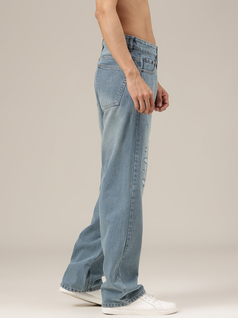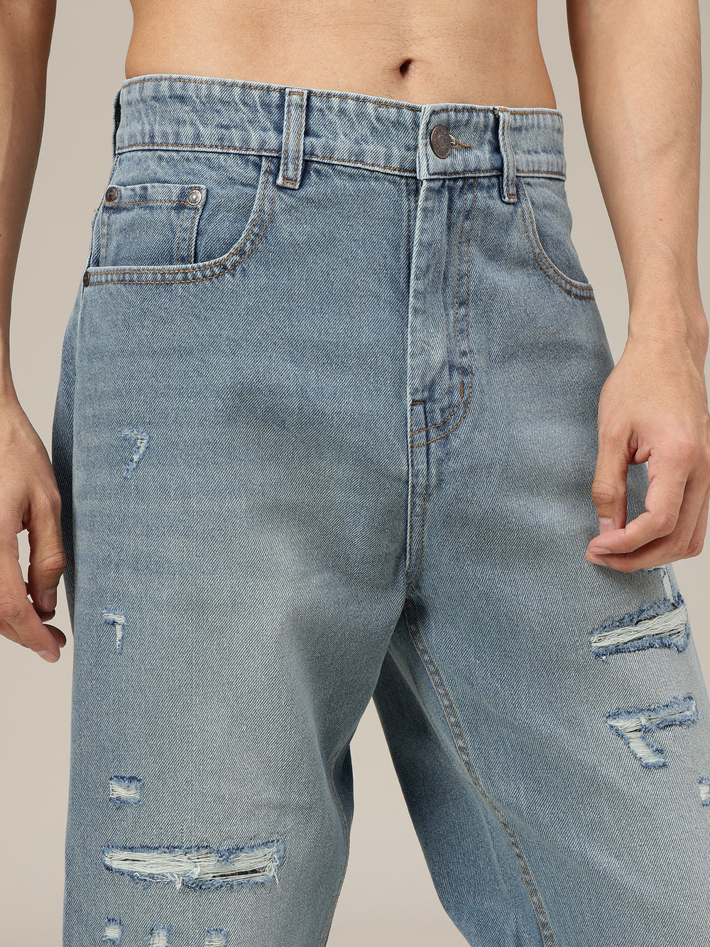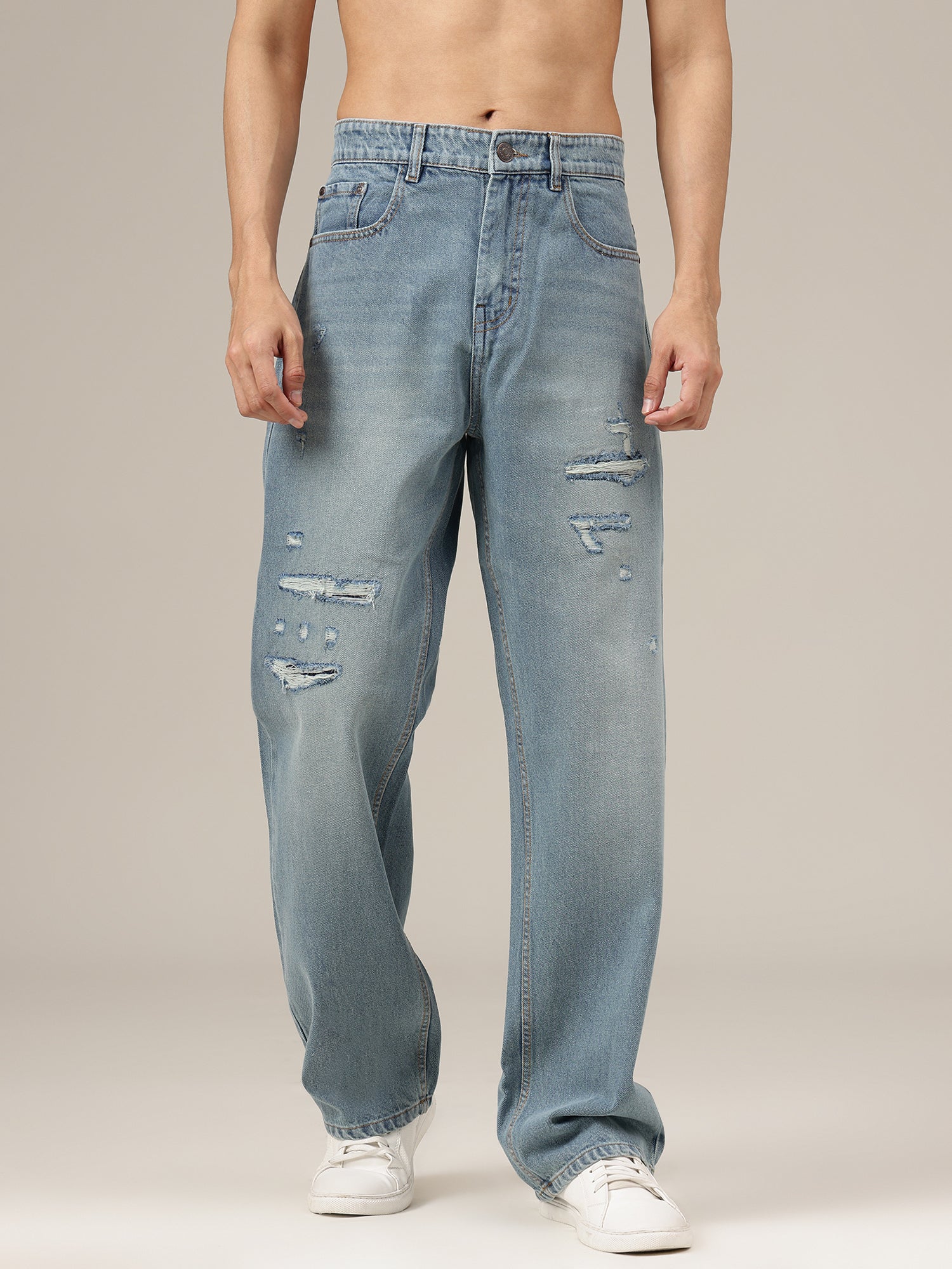 Baggy Fit jeans in a Light Shade with Light Faded finish and Mildly Distressed detailing. Features 5 pockets, Button & Zip Closure, and With Belt Loops, offering relaxed comfort, durable wear, and everyday casual style.