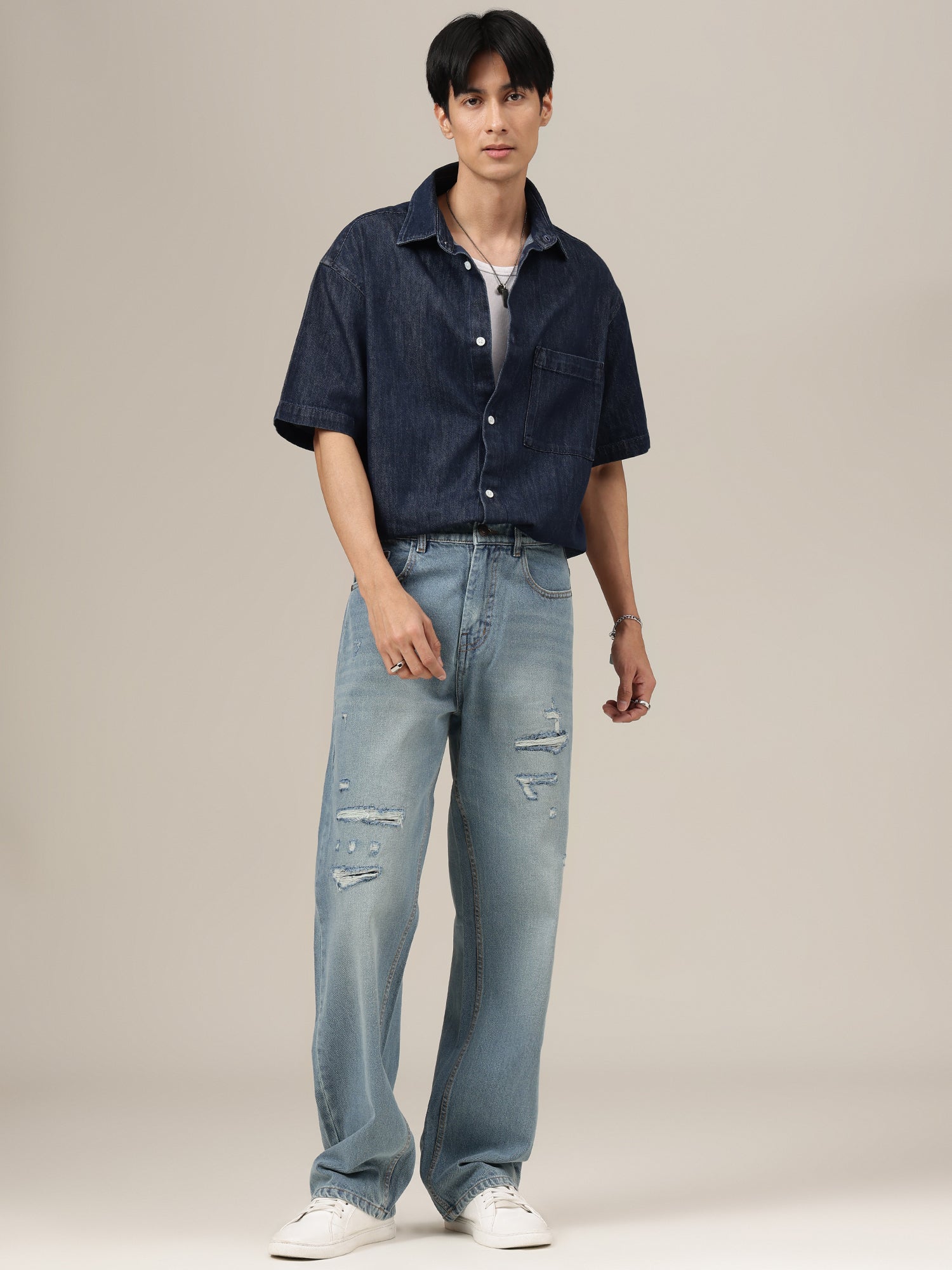 Effortlessly stylish, these Baggy Fit jeans combine a Light Shade base with Light Faded and Mildly Distressed accents, creating a modern, street-ready look that is casual, versatile, and easy to style.