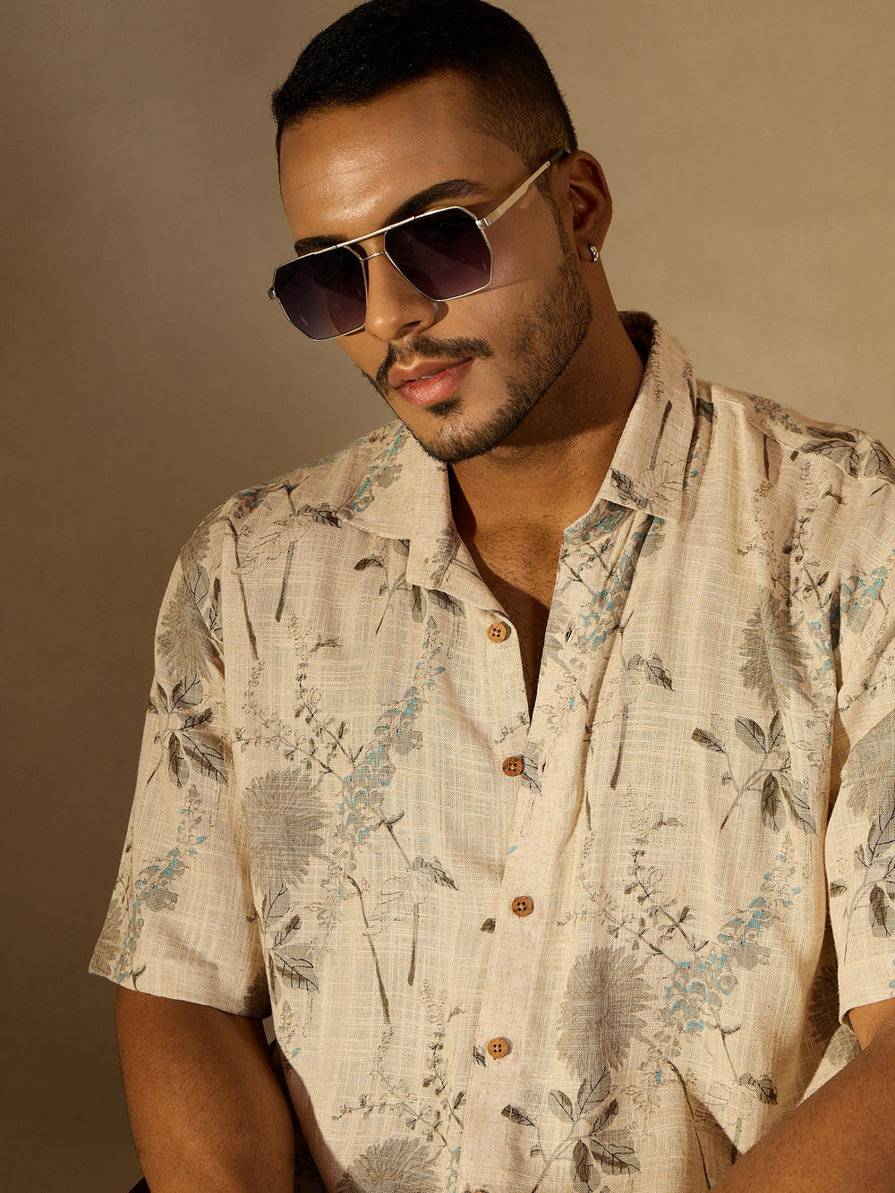 Beige, floral printed opaque Casual shirt, has a spread collar, button placket, short drop-down sleeves, curved hem