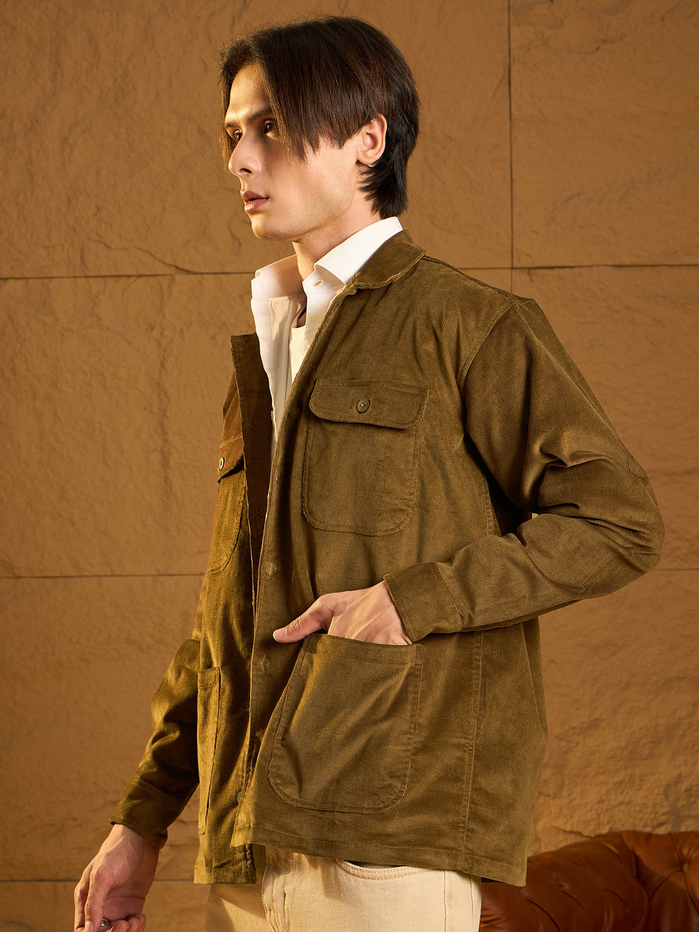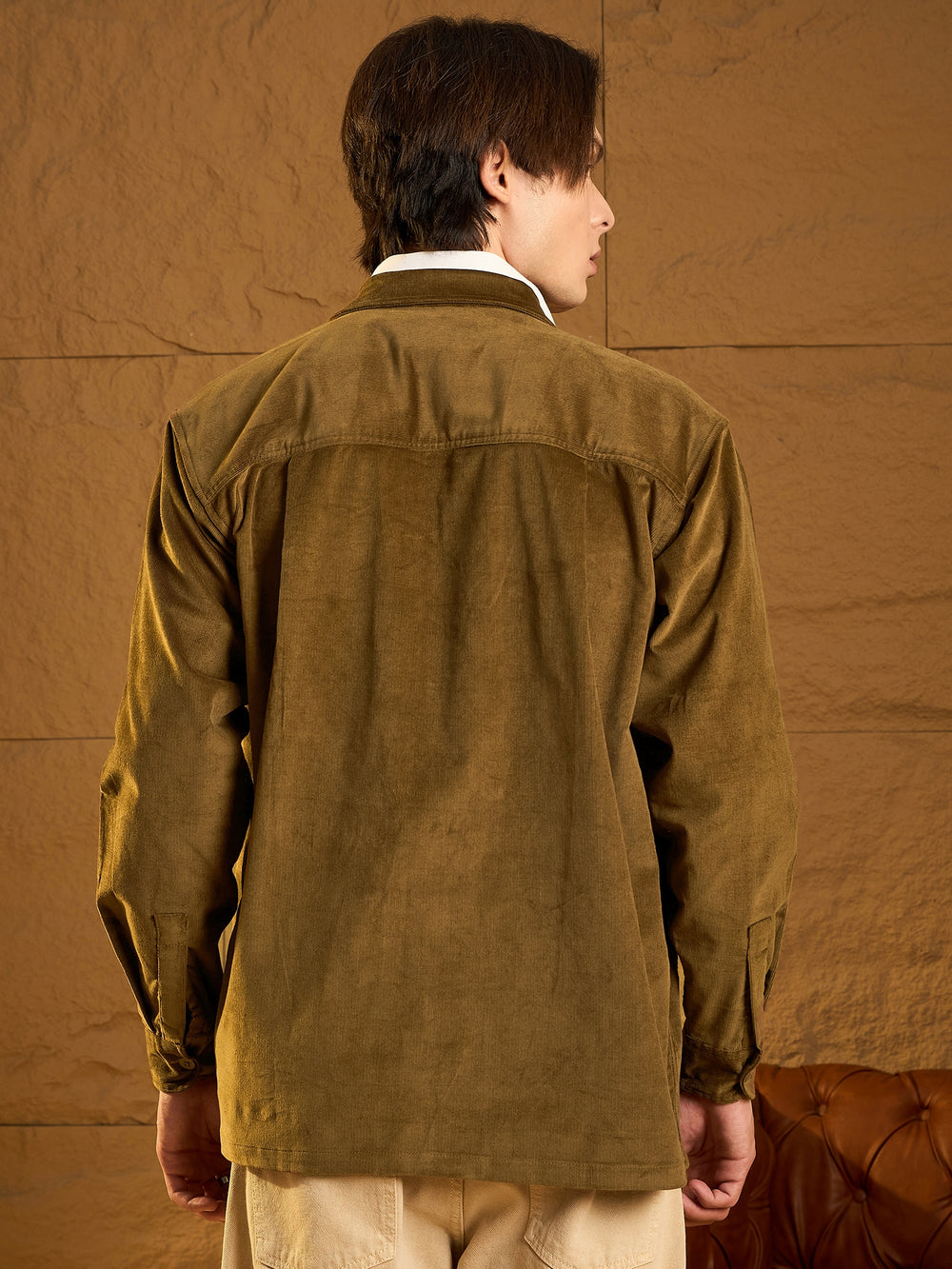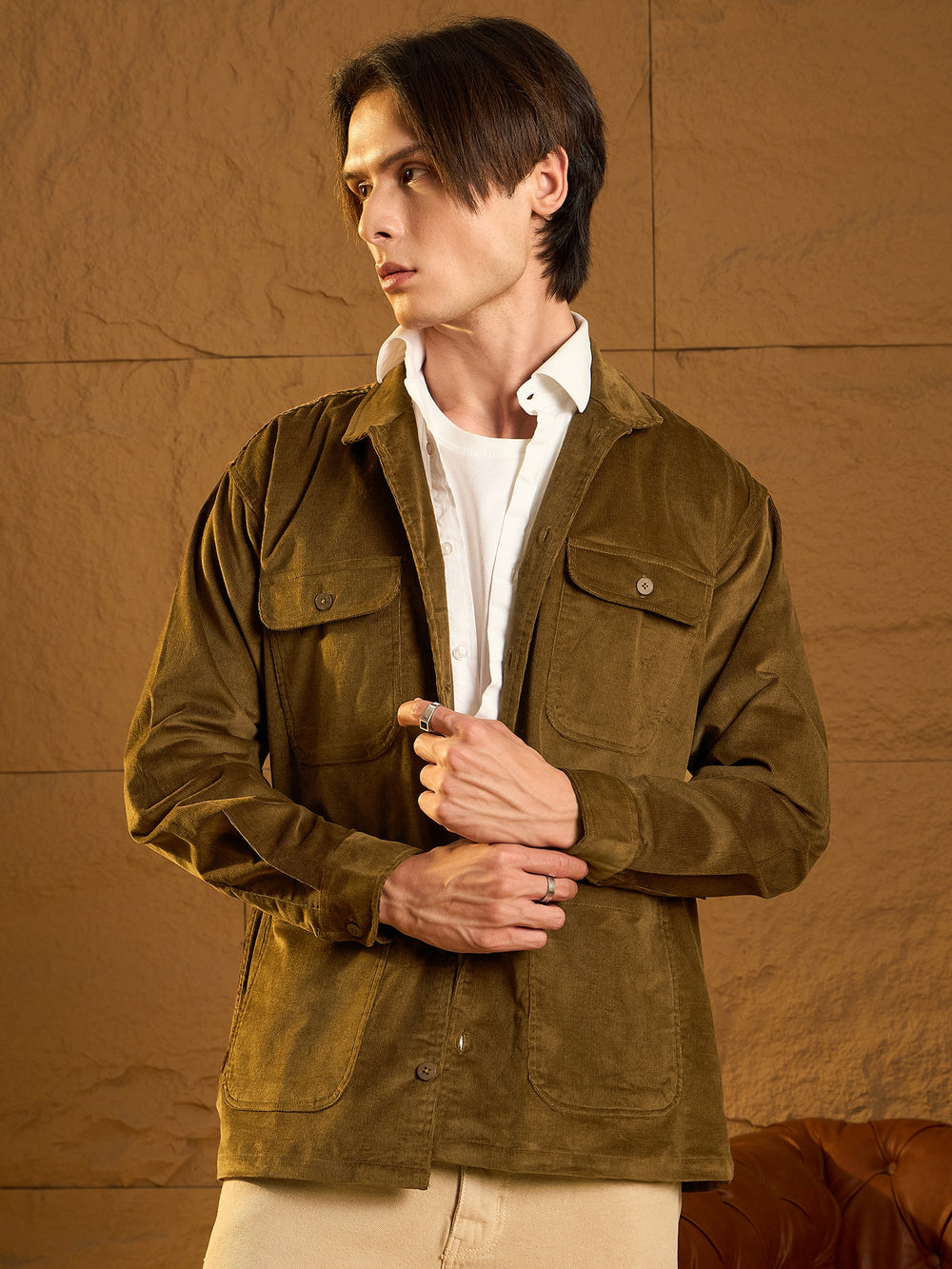 Army Green Solid Corduroy shacket featuring a spread collar, drop shoulders, oversized fit, full sleeves, 2 Flap pockets,2 Patch Pockets, and a stylish curved hemline