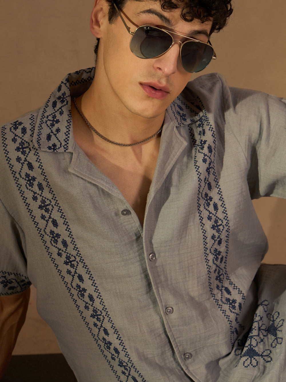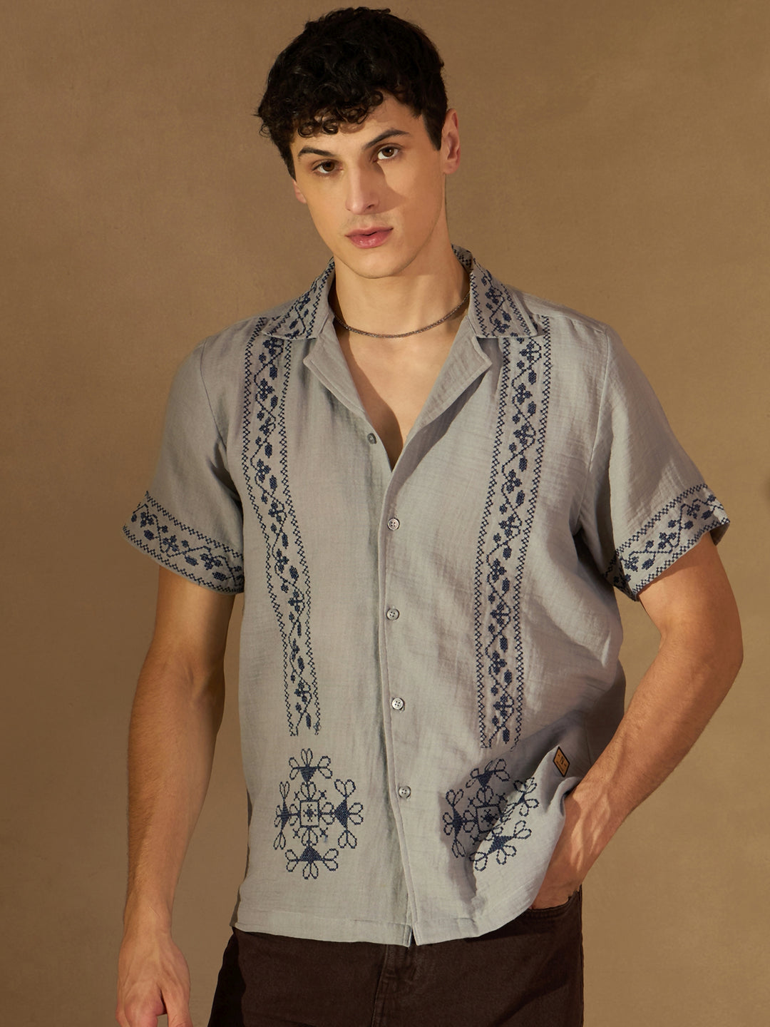 Grey Muslin Double Gauze embroidered Oversized Casual shirt, has a Cuban collar, button placket, short regular sleeves, Straight hem