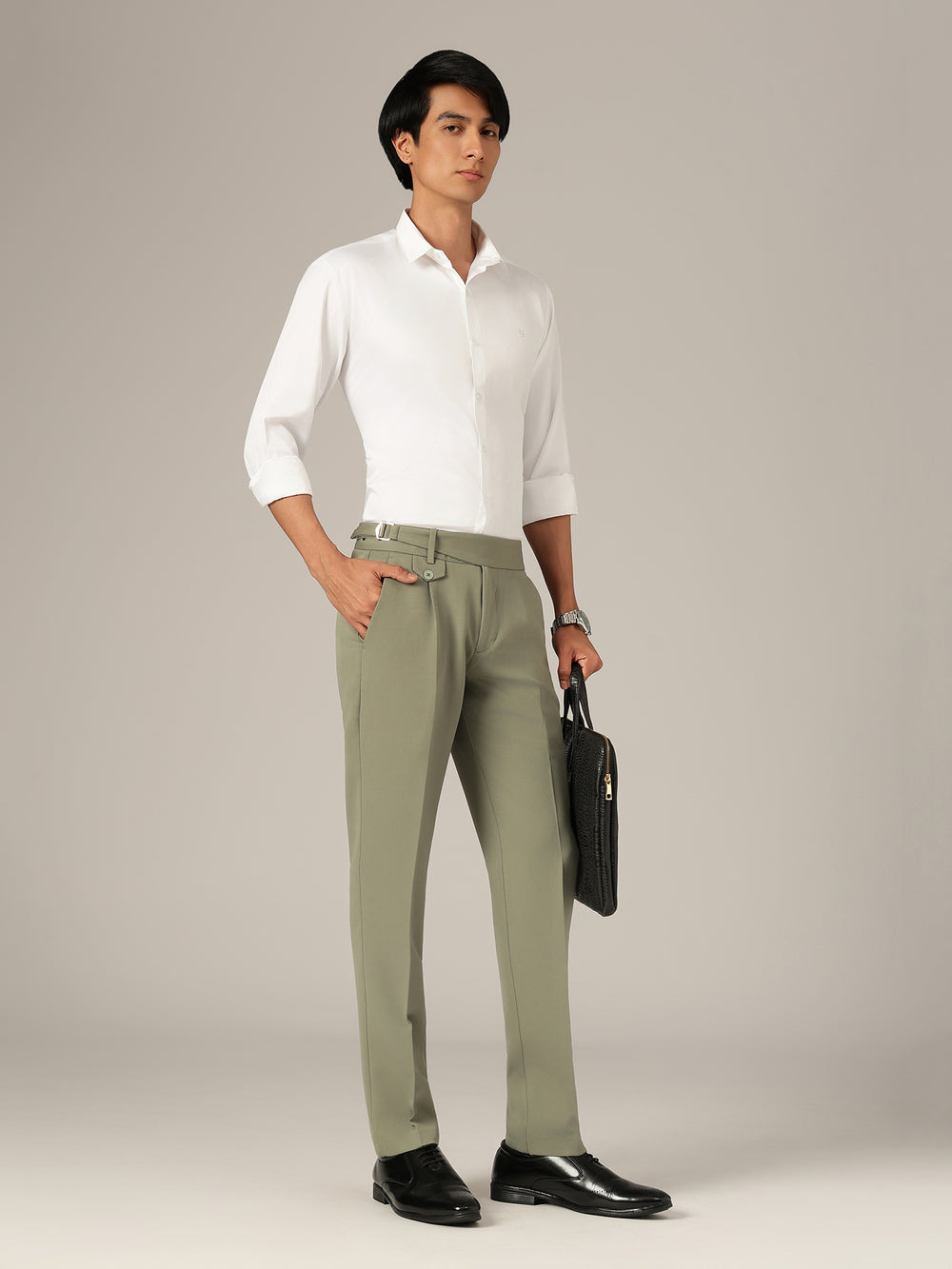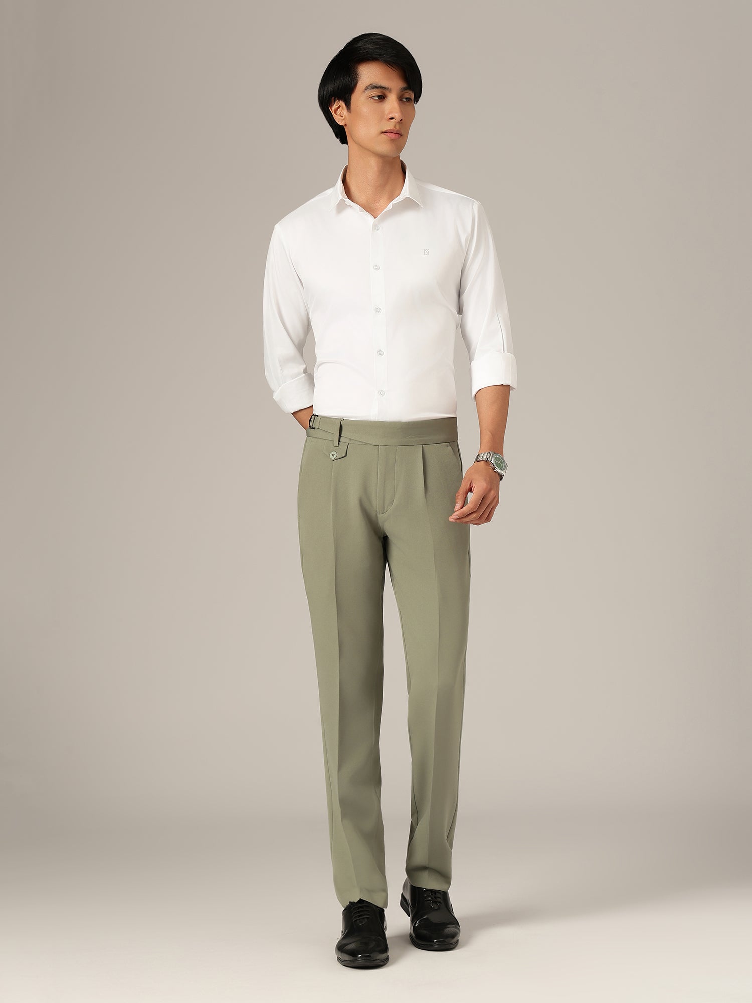 Relaxed Fit Gurkha Trouser crafted from durable polyester, featuring four pockets, a partially elastic waistband with hook and fly zip closure, and adjustable fastening for a secure, comfortable fit.