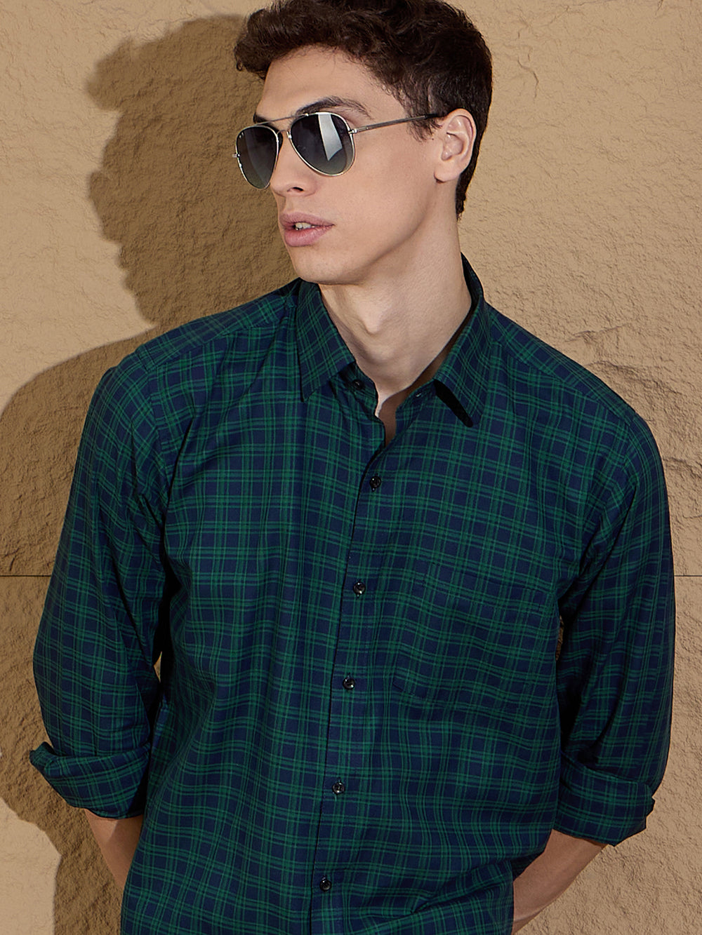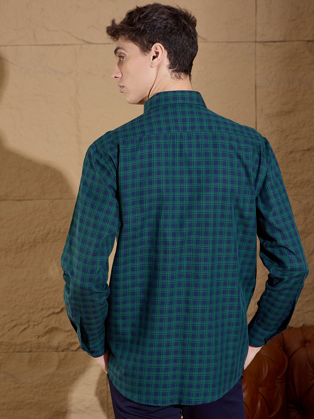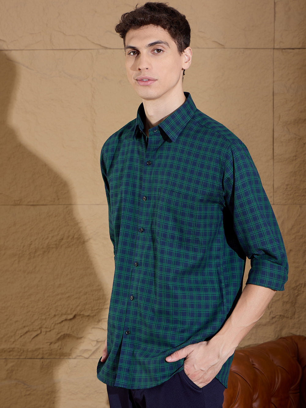 Green and Blue tartan checks opaque Formal shirt, has a Spread collar, button placket, 1 patch pocket, long regular sleeves, curved hem