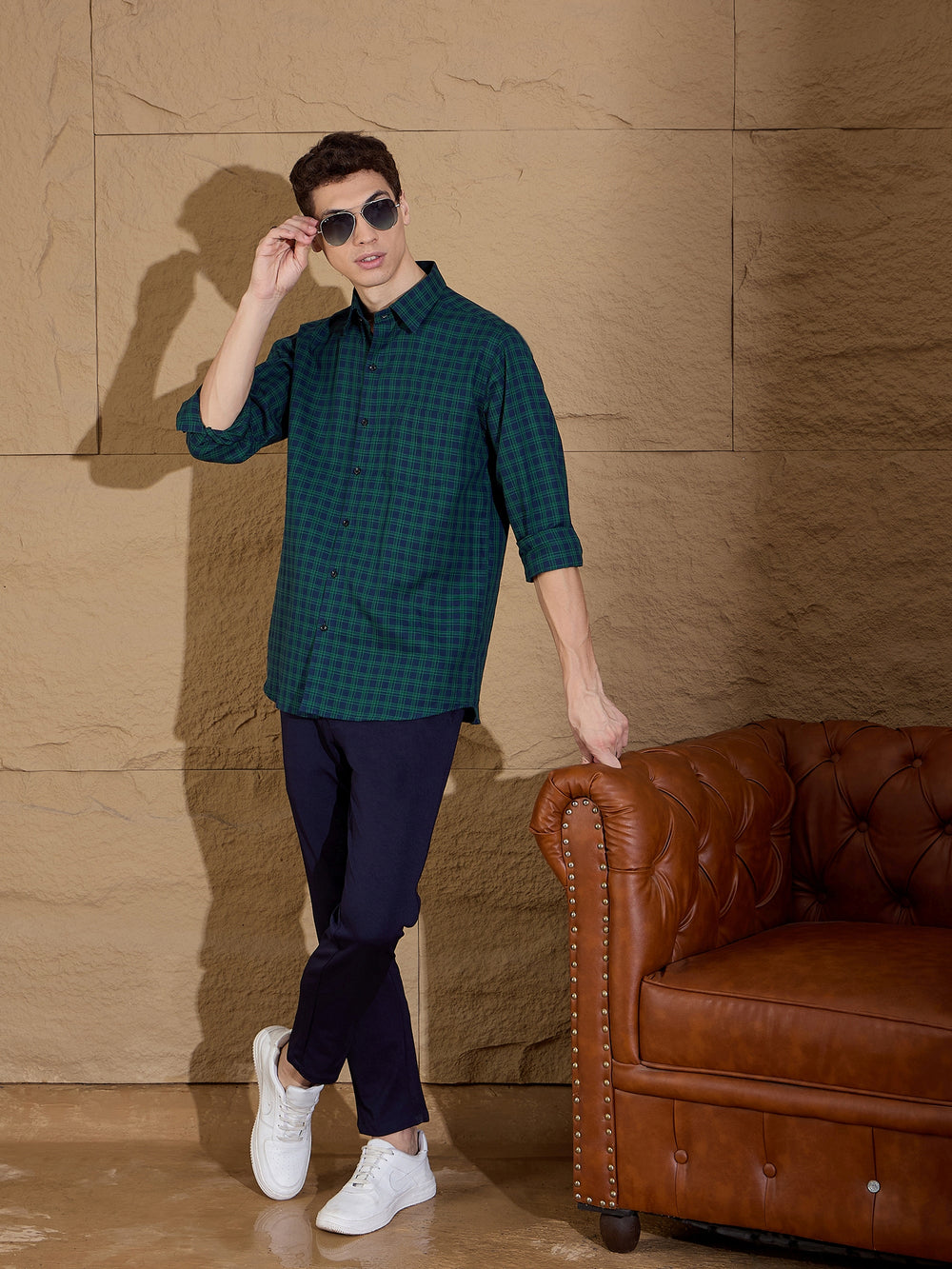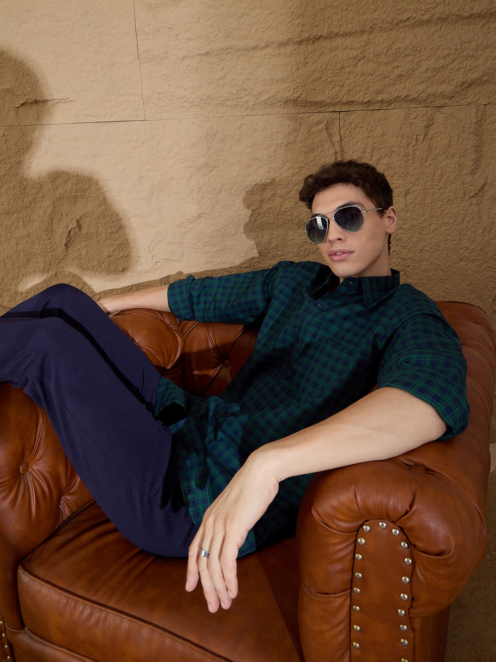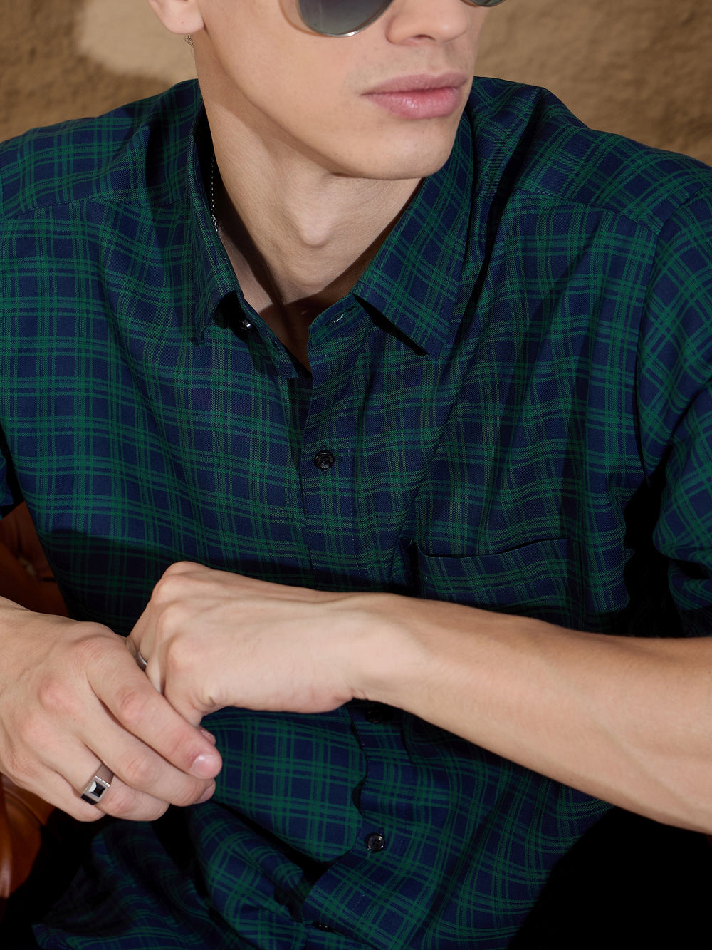 Green and Blue tartan checks opaque Formal shirt, has a Spread collar, button placket, 1 patch pocket, long regular sleeves, curved hem