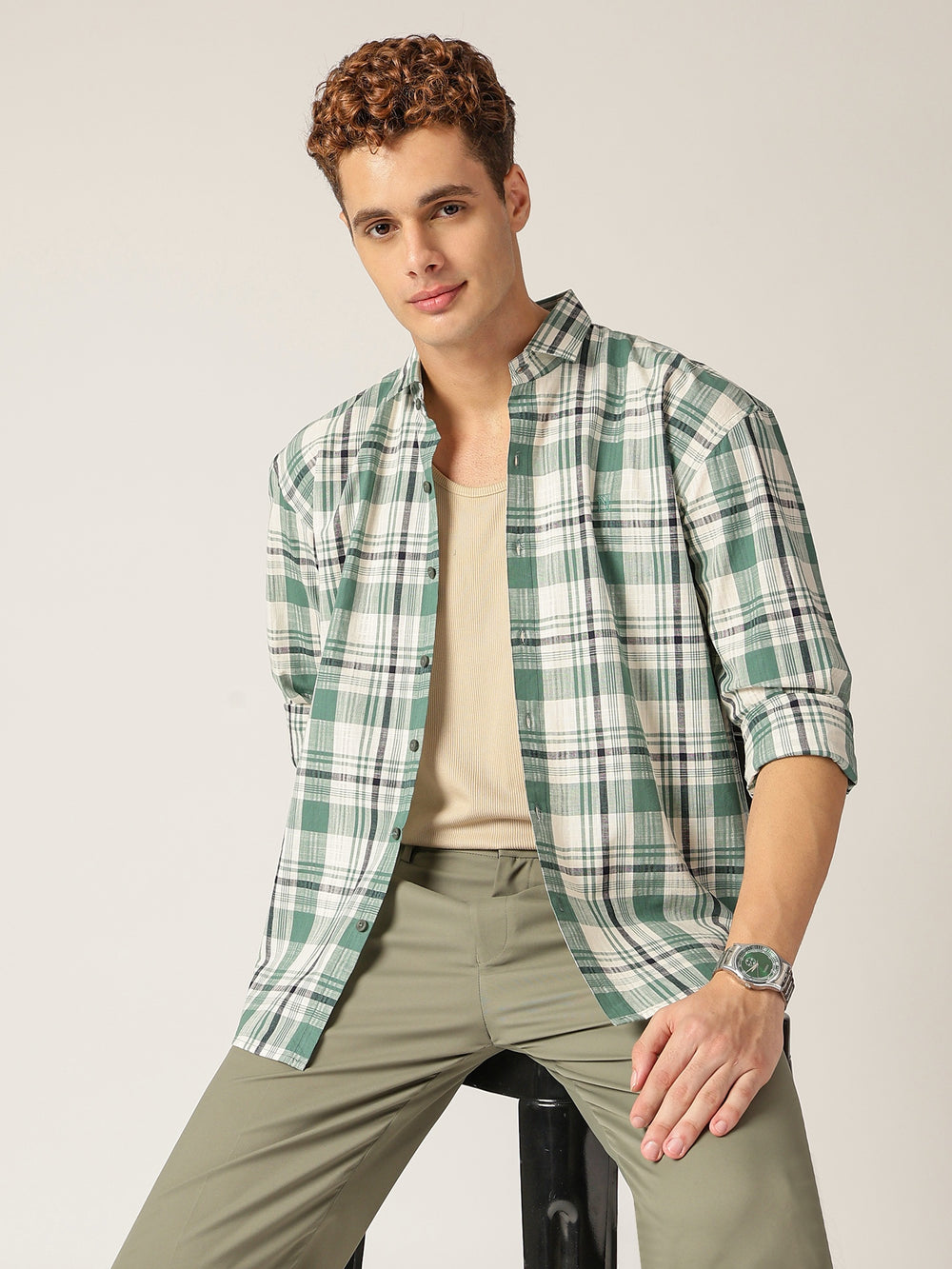 Green & Cream: Checkered Drop-Shoulder Oversized Casual Shirt