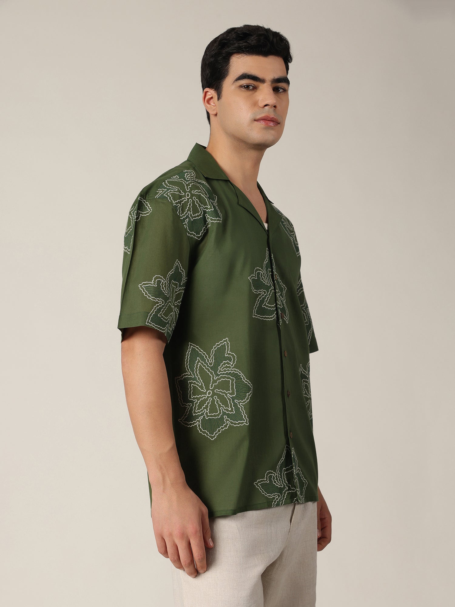 This Oversize Fit Embroidered Shirt crafted from soft cotton features half sleeves, a relaxed drop-shoulder, and a refined Cuban collar. A stylish casual shirt with clean embroidery, offering comfort and effortless everyday elegance.
