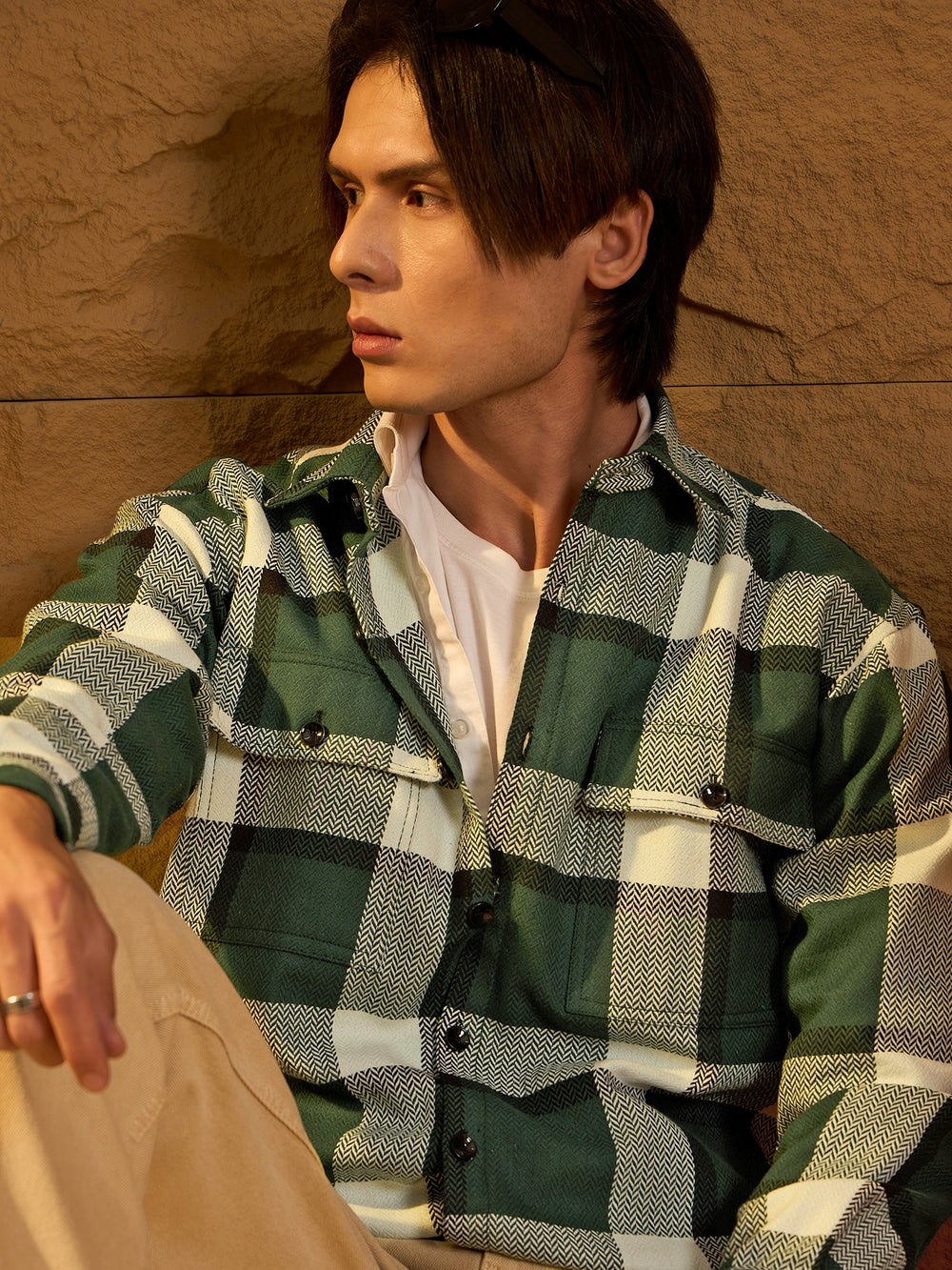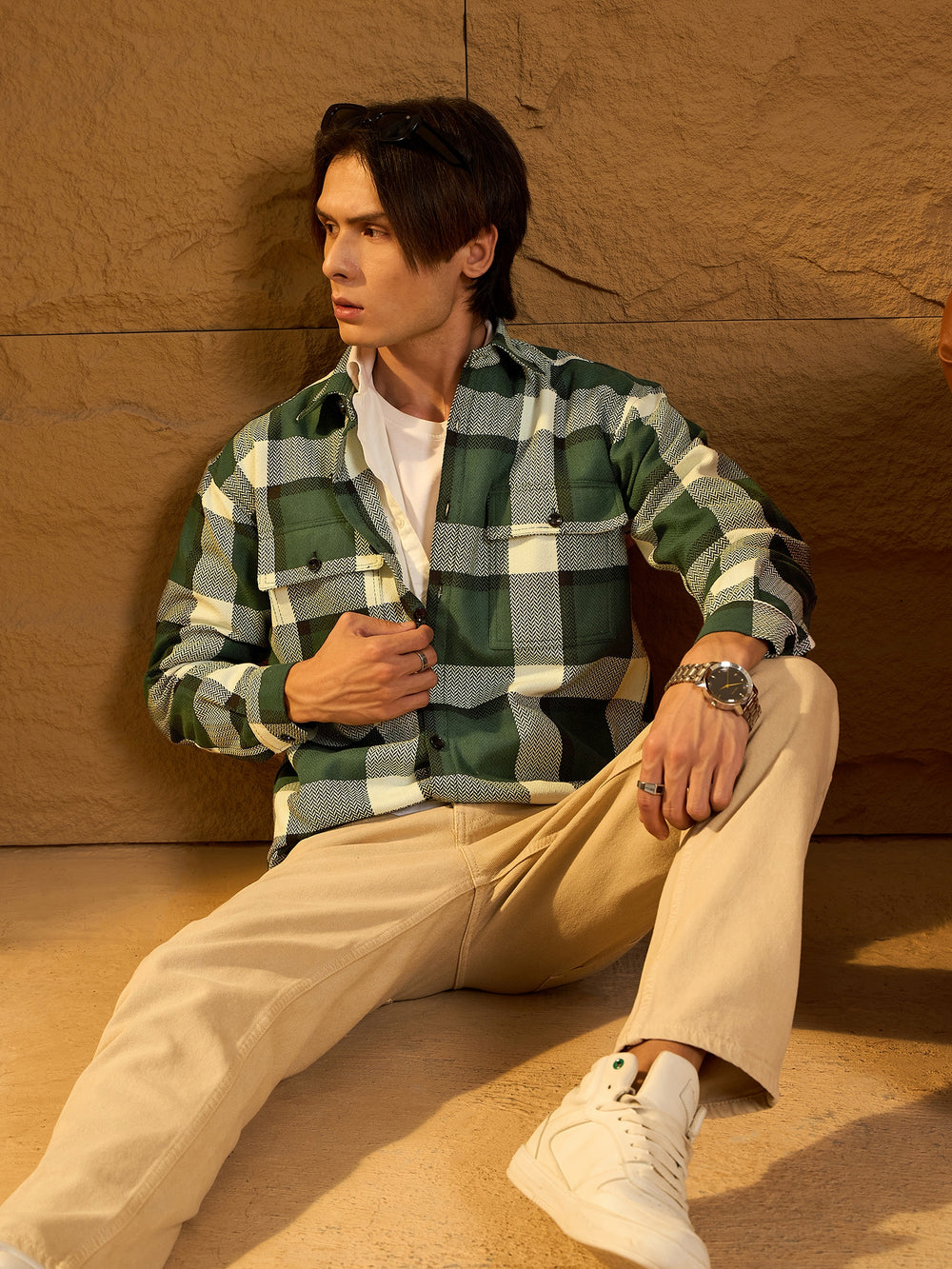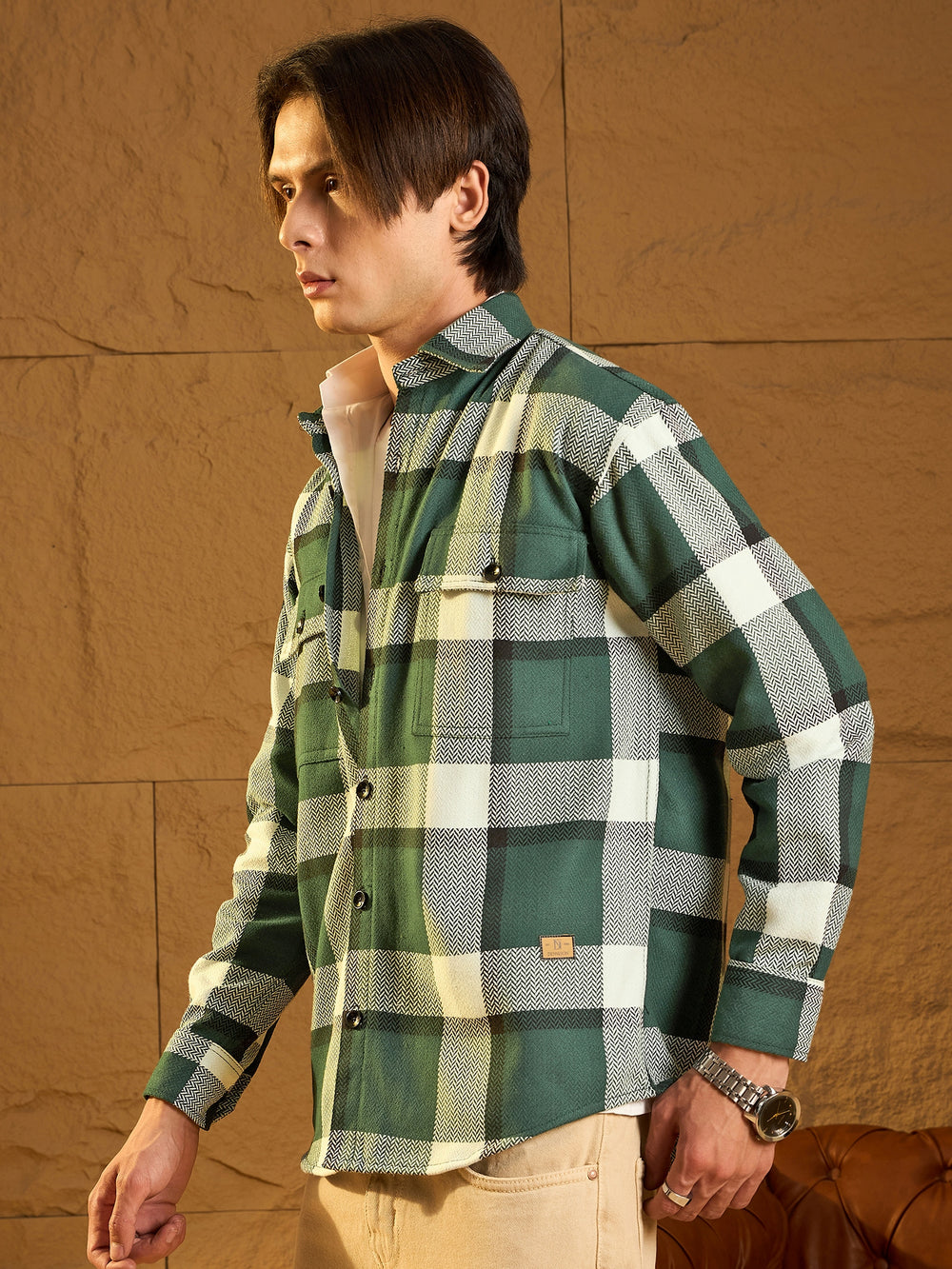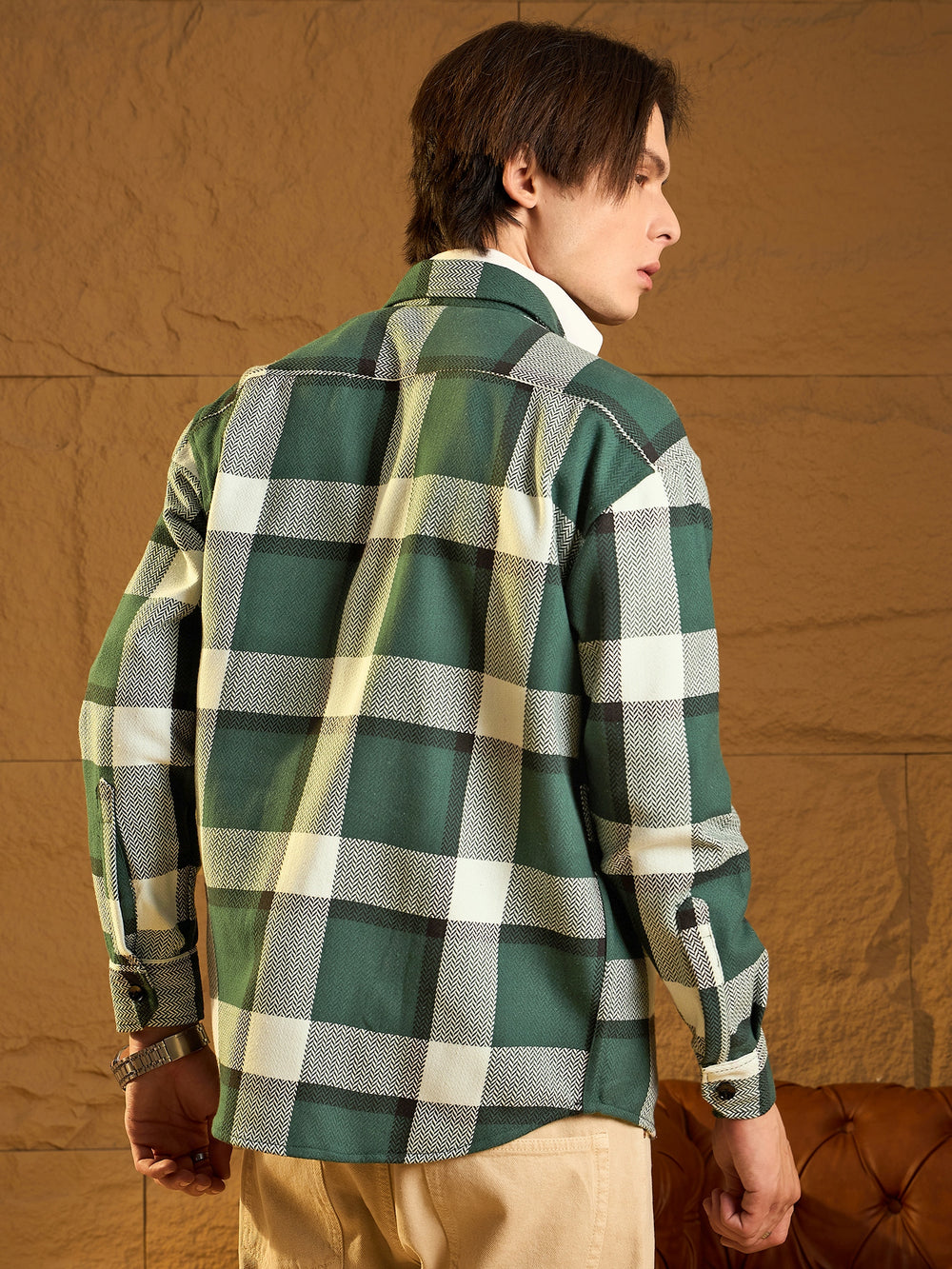 Green and White checked shacket featuring a spread collar, drop shoulders, oversized fit, full sleeves, 2 Flap pockets, and a stylish curved hemline