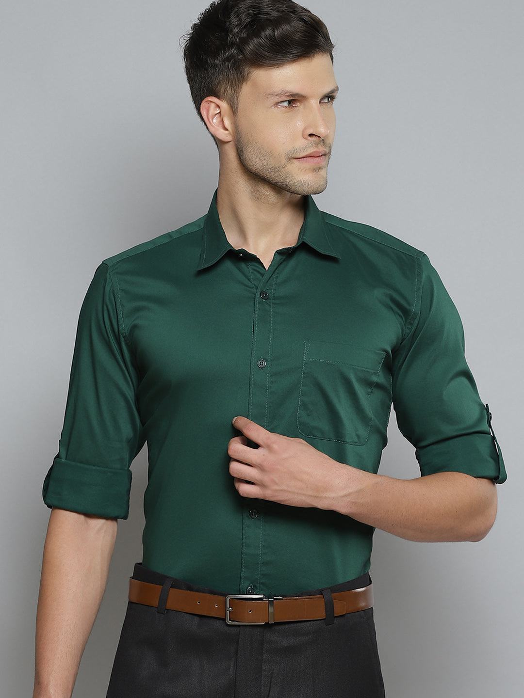 This Regular Fit Solid formal shirt, has a spread collar, long sleeves, button placket, curved hem, and 1 patch pocket