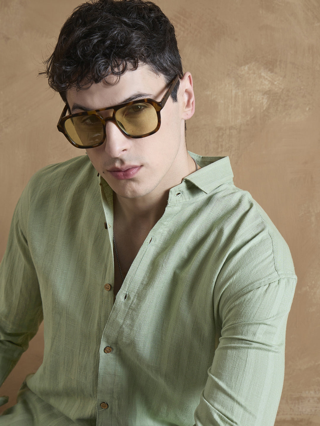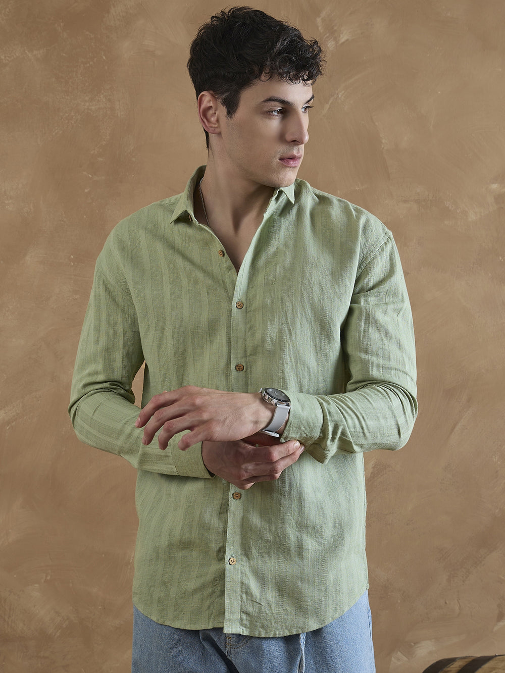 This Dennison cotton-linen self-design shirt blends texture and comfort effortlessly. Featuring a spread collar, drop shoulders, and an oversized fit, it exudes relaxed elegance. The long sleeves and curved hemline make it versatile enough for layering or wearing solo for a smart-casual look.
