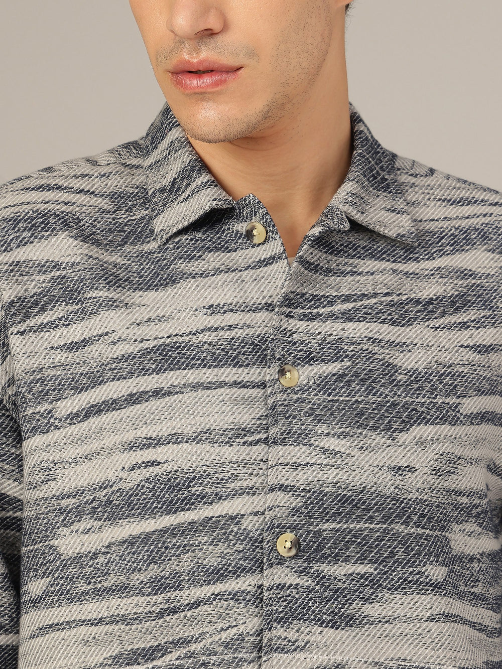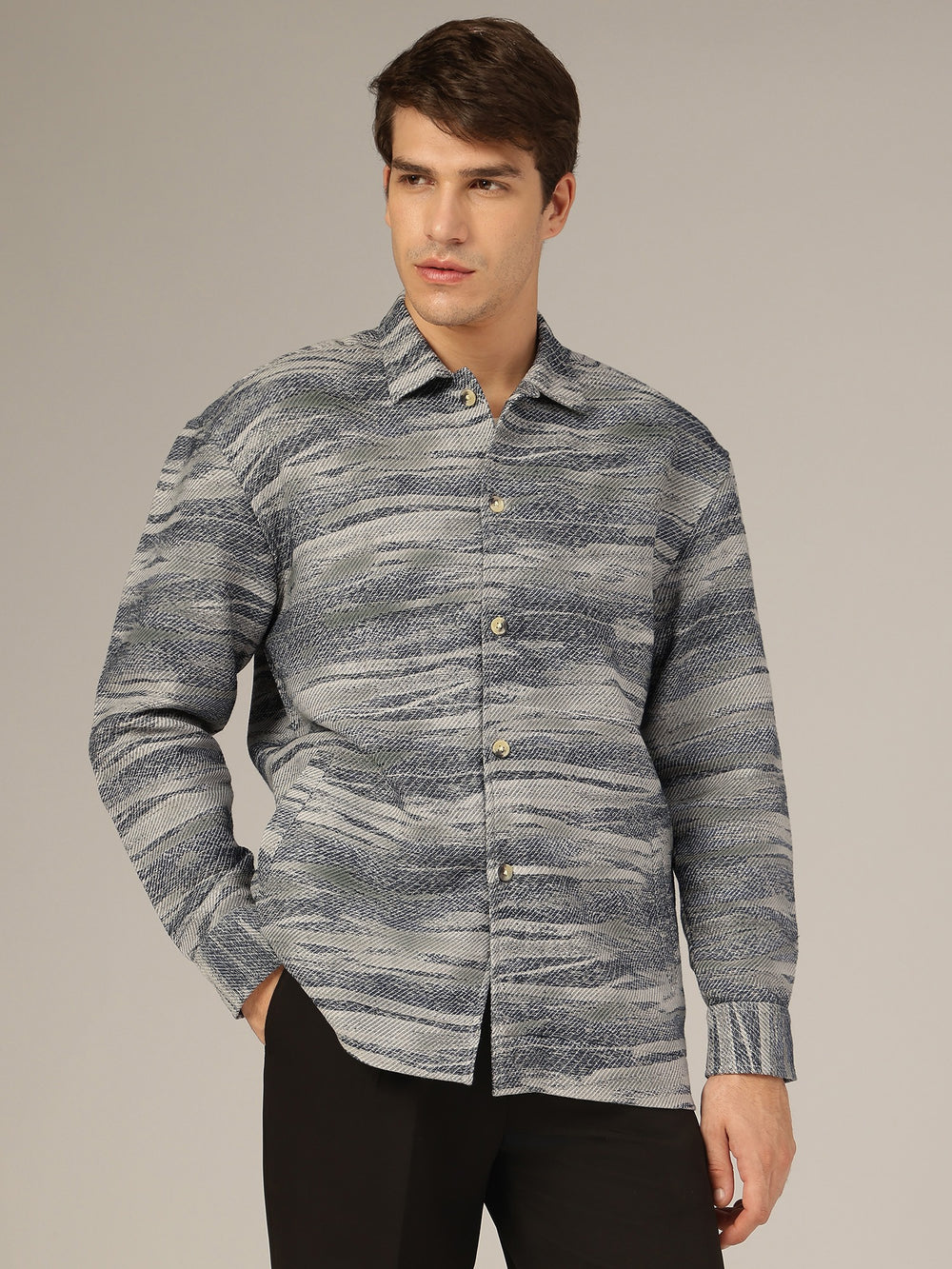 Step up your style with this Oversized Fit, Full Sleeves Casual Shacket featuring a Drop-Shoulder, Jacquard Print, 2 welt pockets, spread collar, and crafted in breathable cotton for all-day comfort.