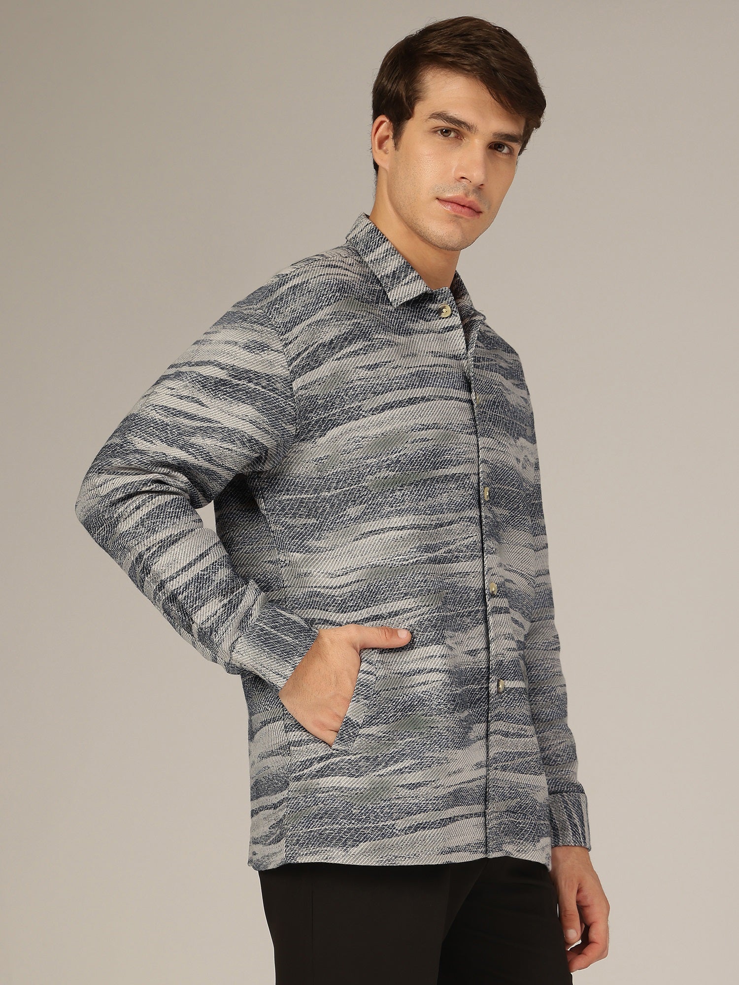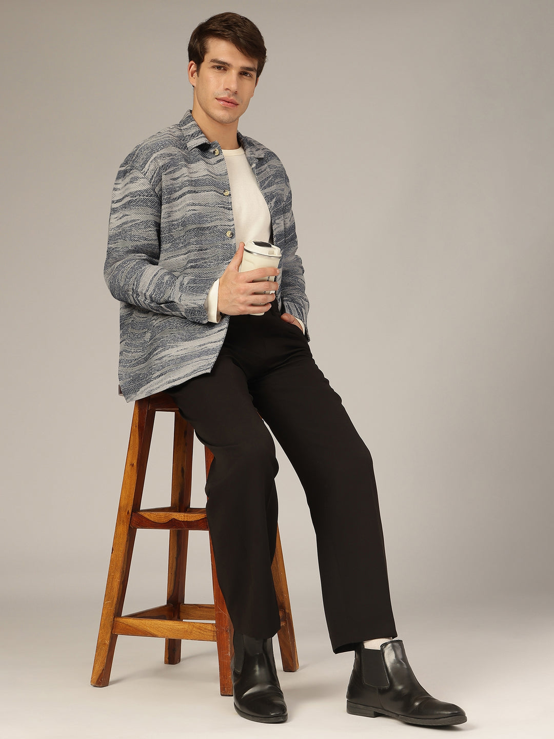 Grey & Blue: Jacquard Printed Oversized Drop-Shoulder Shacket