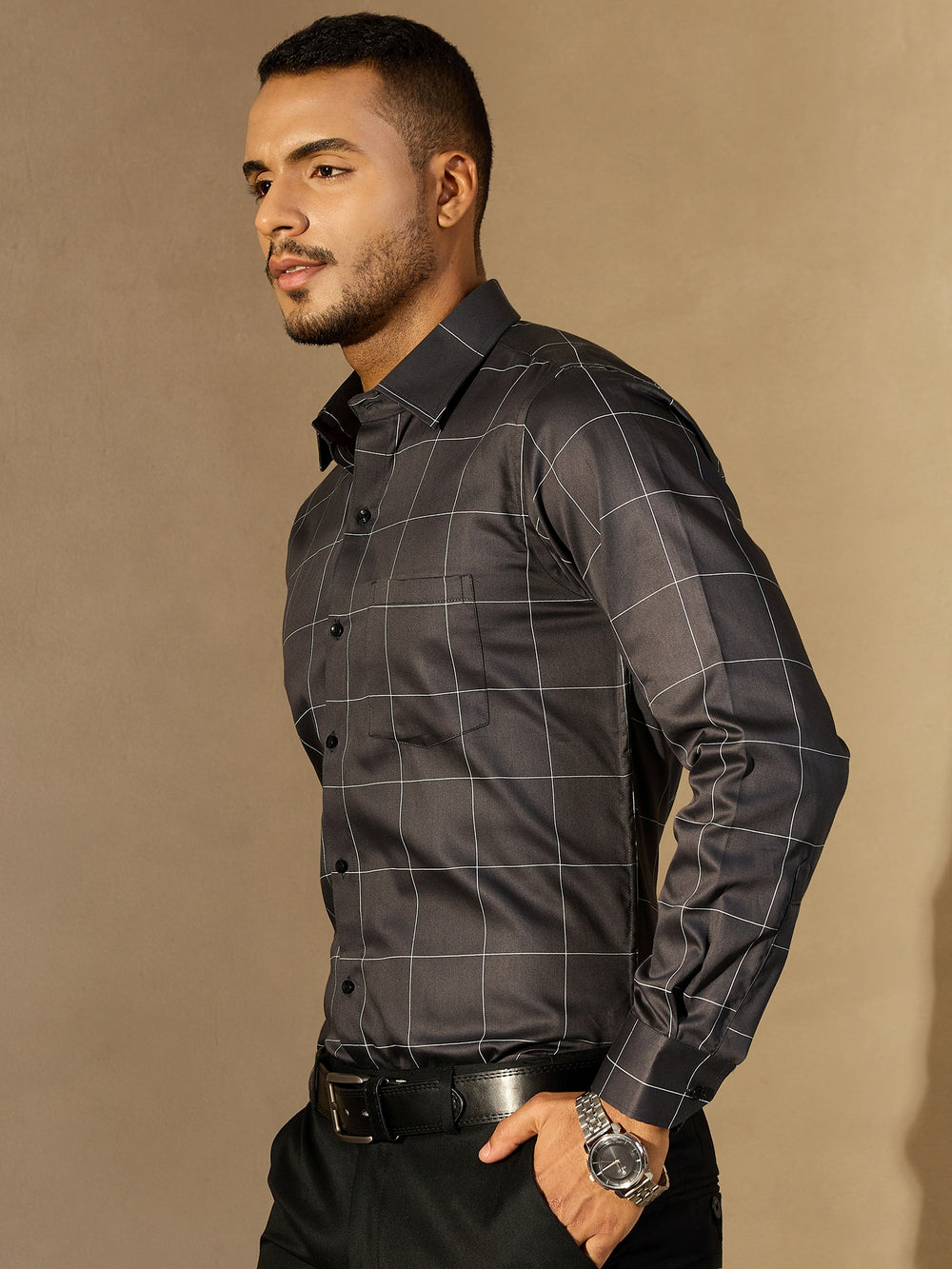 Dark Grey & White checks checked opaque formal shirt, has a spread collar, button placket, 1 patch pocket, long regular sleeves, curved hem