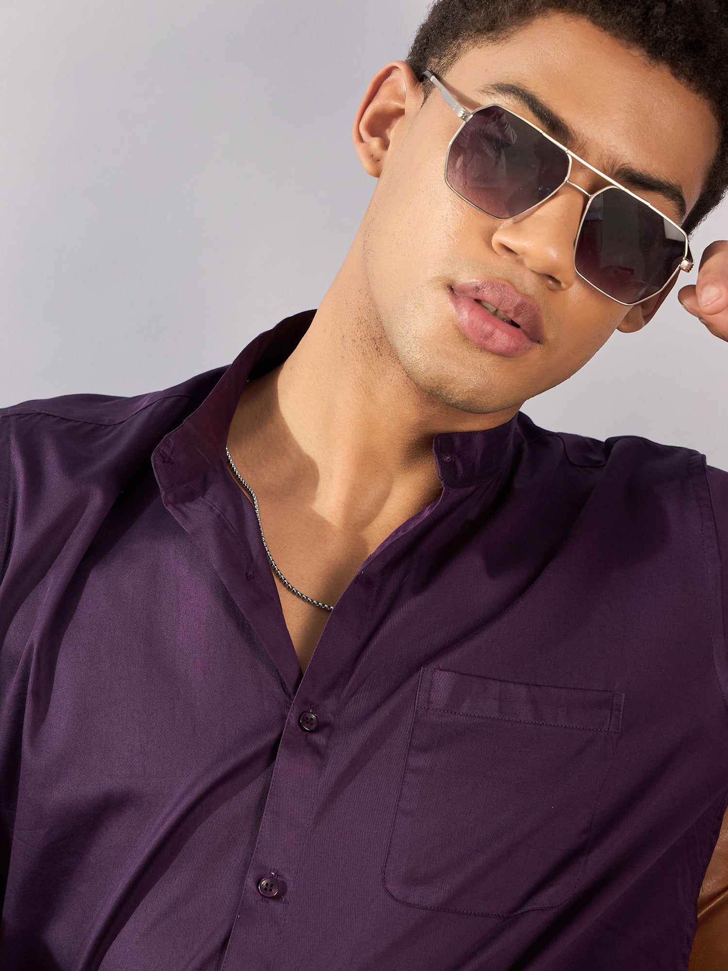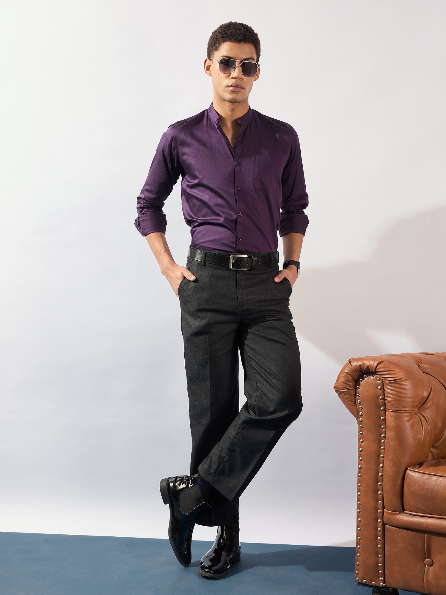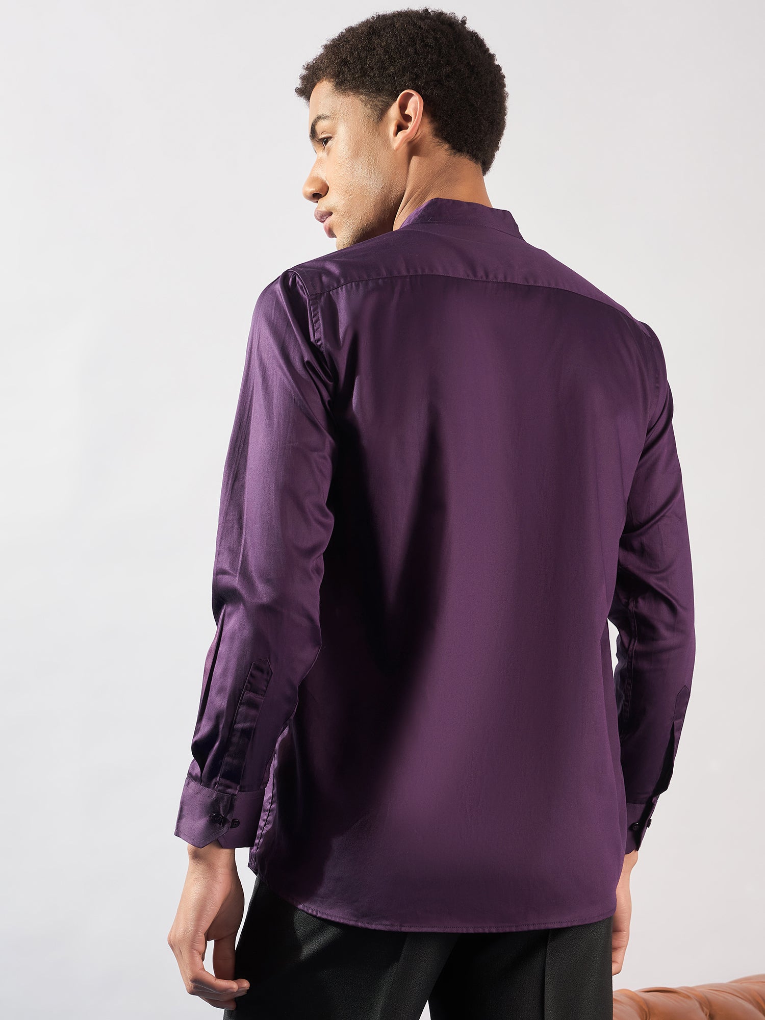 Violet solid opaque Casual shirt has a mandarin collar, button placket, 1 patch pocket, long regular sleeves, curved hem