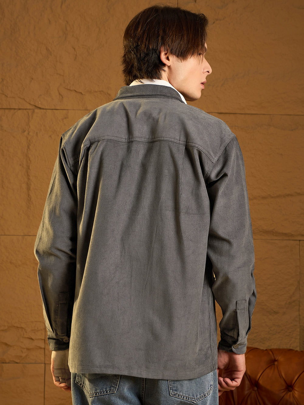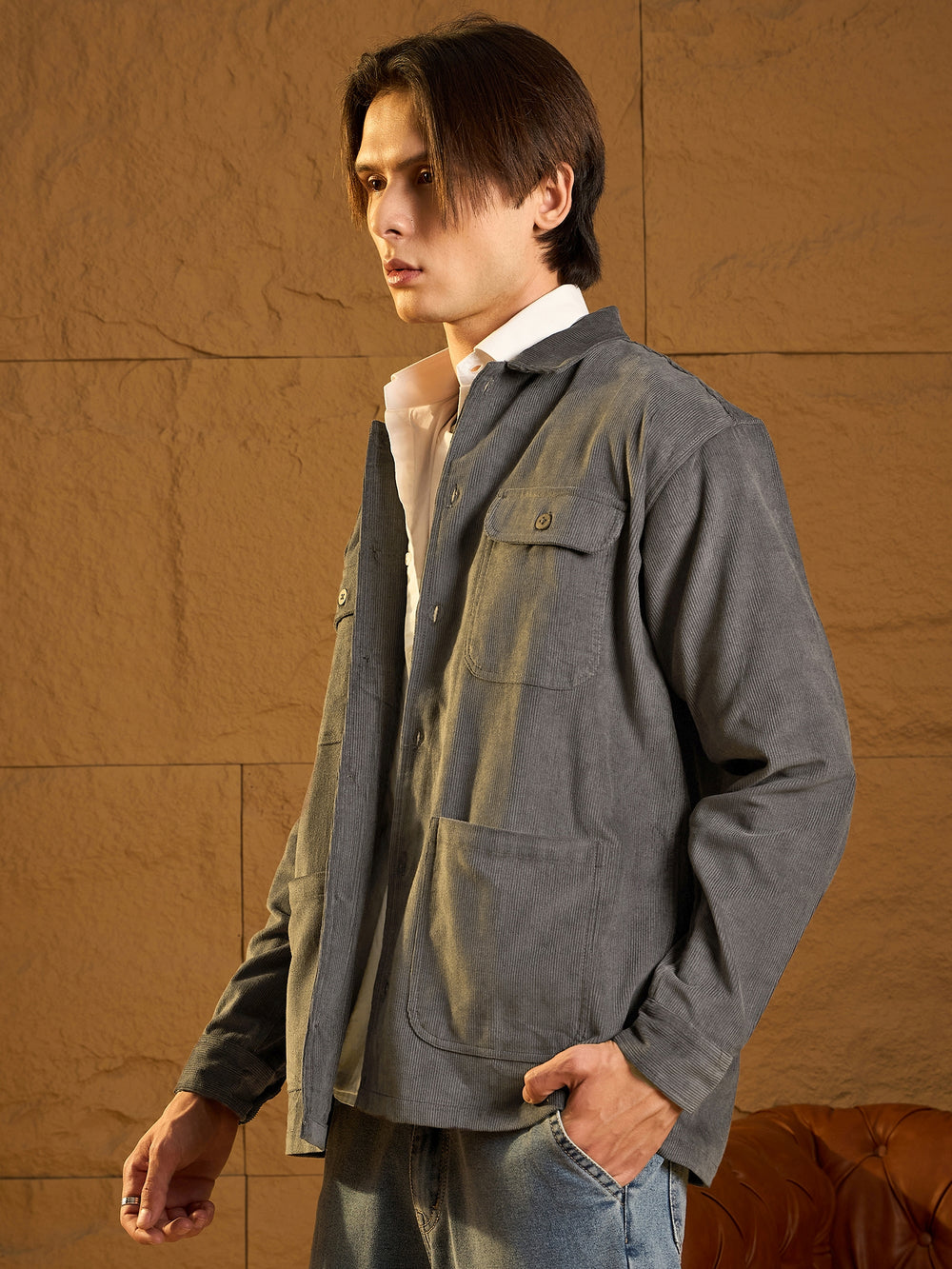 A cozy, versatile oversized shacket crafted from Corduroy with a Four-pocket design and dropped shoulders for a relaxed fit. The full sleeves and timeless Solid pattern add casual-chic appeal, perfect for layering any season.