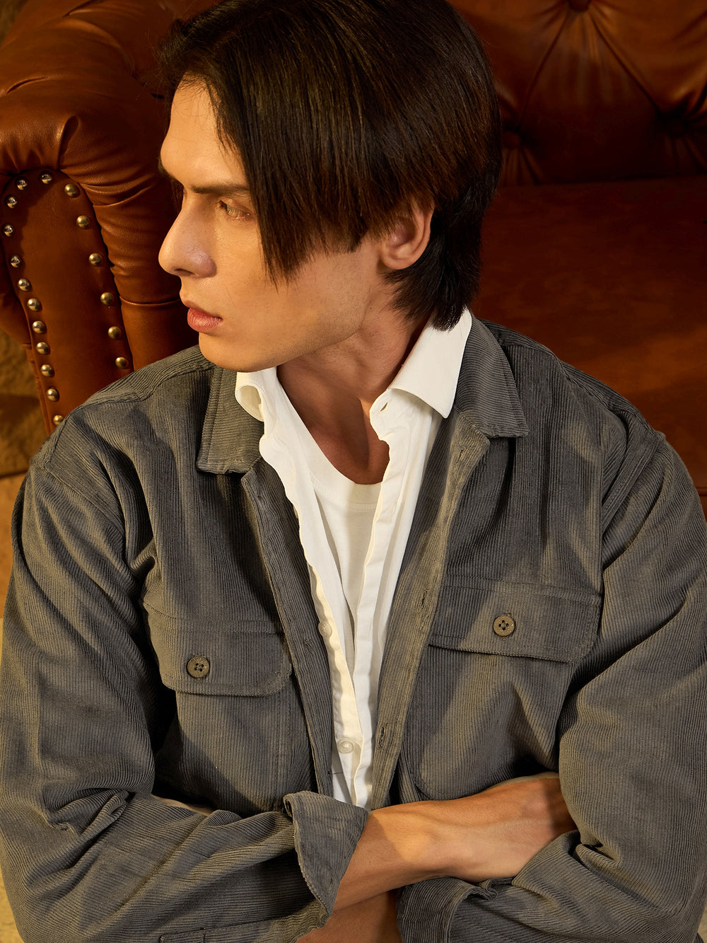 Grey Solid Corduroy shacket featuring a spread collar, drop shoulders, oversized fit, full sleeves, 2 Flap pockets,2 Patch Pockets, and a stylish curved hemline