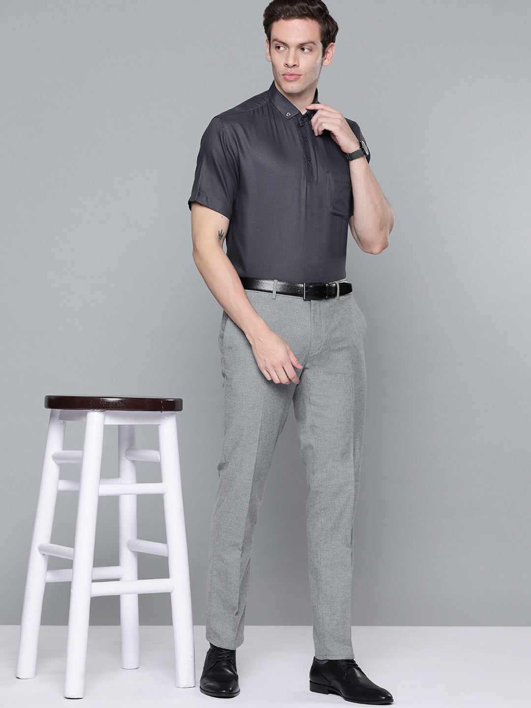 Grey solid opaque formal shirt ,has a button-down collar, button placket, 1 patch pocket, short regular sleeves, curved hem