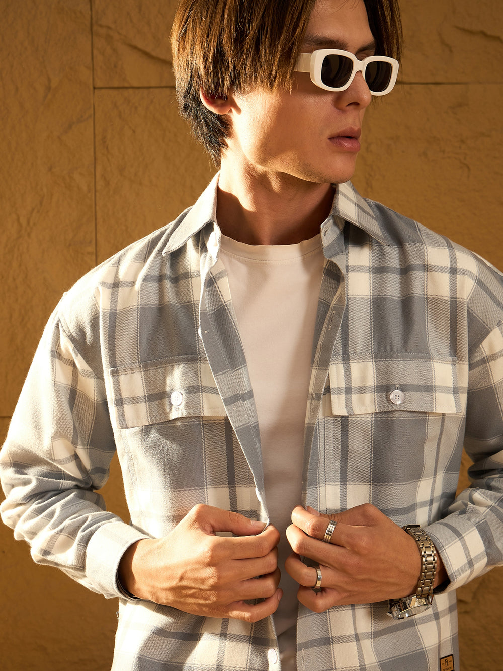 Grey and White checked shacket featuring a spread collar, drop shoulders, oversized fit, full sleeves, 2 Patch pockets, and a stylish curved hemline