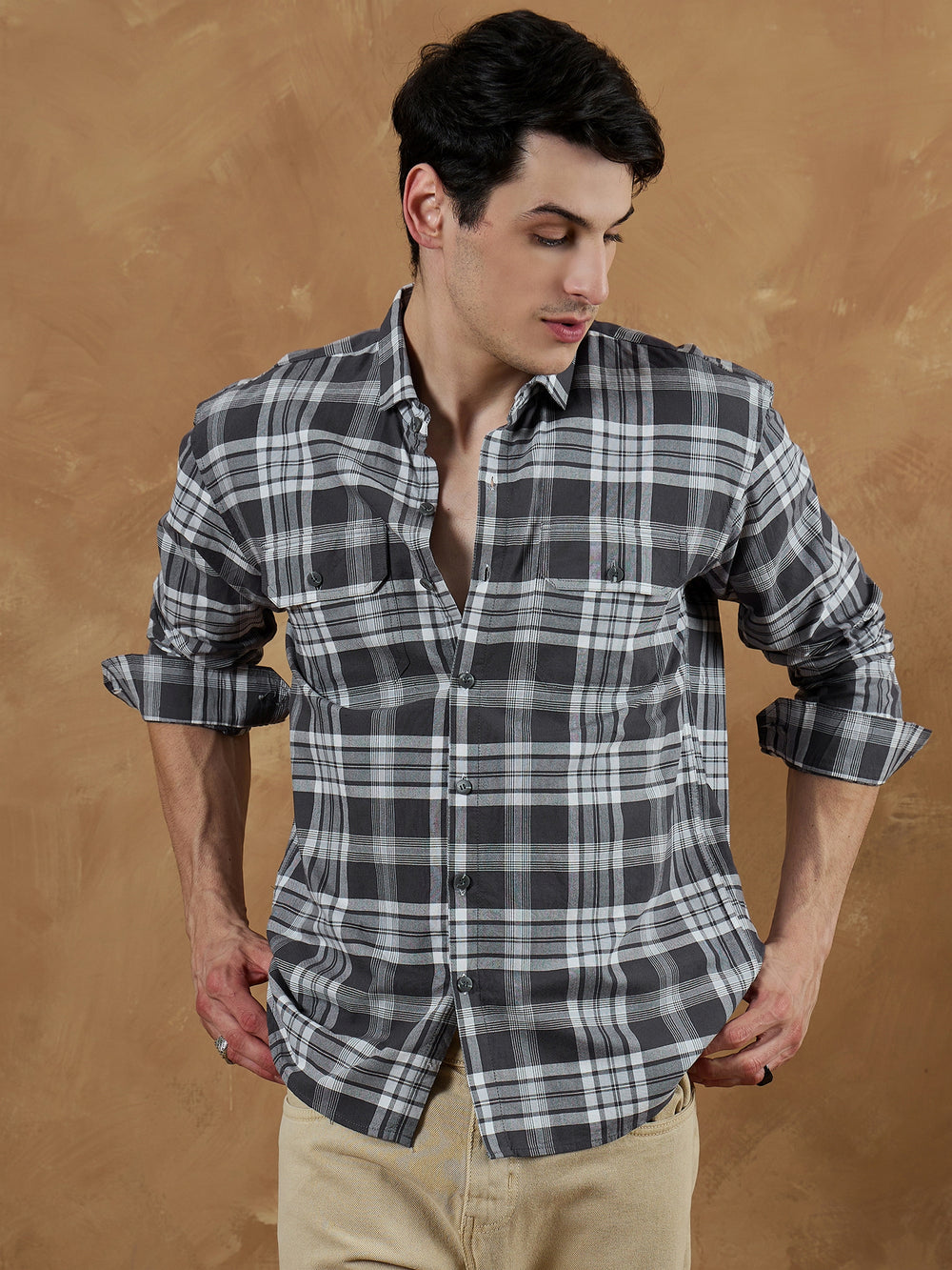 This Oversize Fit Check Shirt is crafted from breathable cotton and features a spread collar, dual flip pockets, drop-shoulder, and long sleeves—perfect for a relaxed, casual layering look with everyday utility.