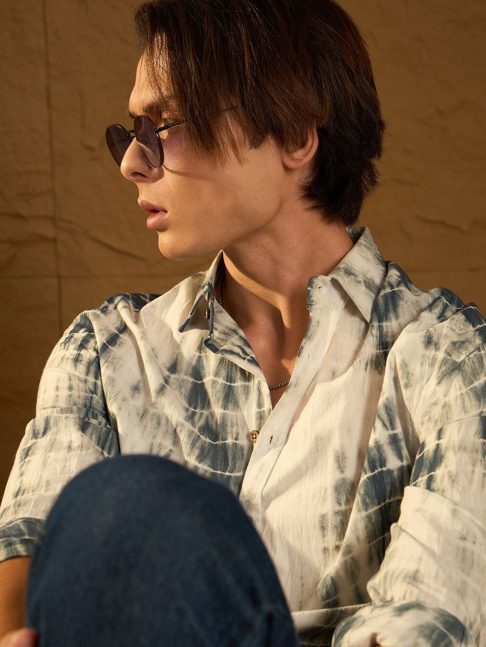 This oversized drop-shoulder tie-dye shirt features a spread collar and button placket, giving it a laid-back yet stylish vibe. With long regular sleeves and a curved hem, it's perfect for casual outings with a bold, trendy flair.