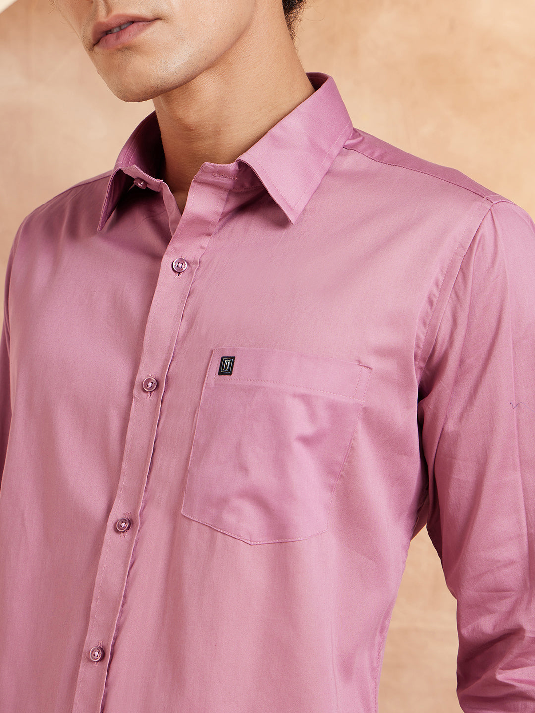 Lavender brand logo printed opaque casual shirt, has a spread collar, button placket, 1 patch pocket, long regular sleeves, curved hem