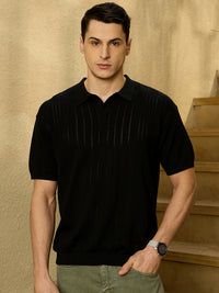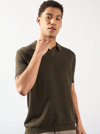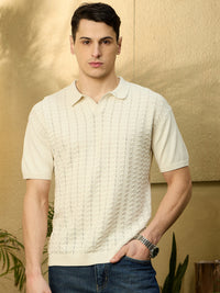 Elevate your casual wardrobe with this textured self design knitted T-shirt. Crafted from pure cotton, it features a stylish polo neck and half sleeves, making it perfect for laid-back outings. Regular length ensures versatile styling.