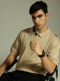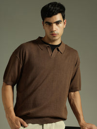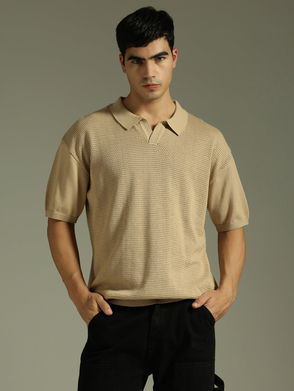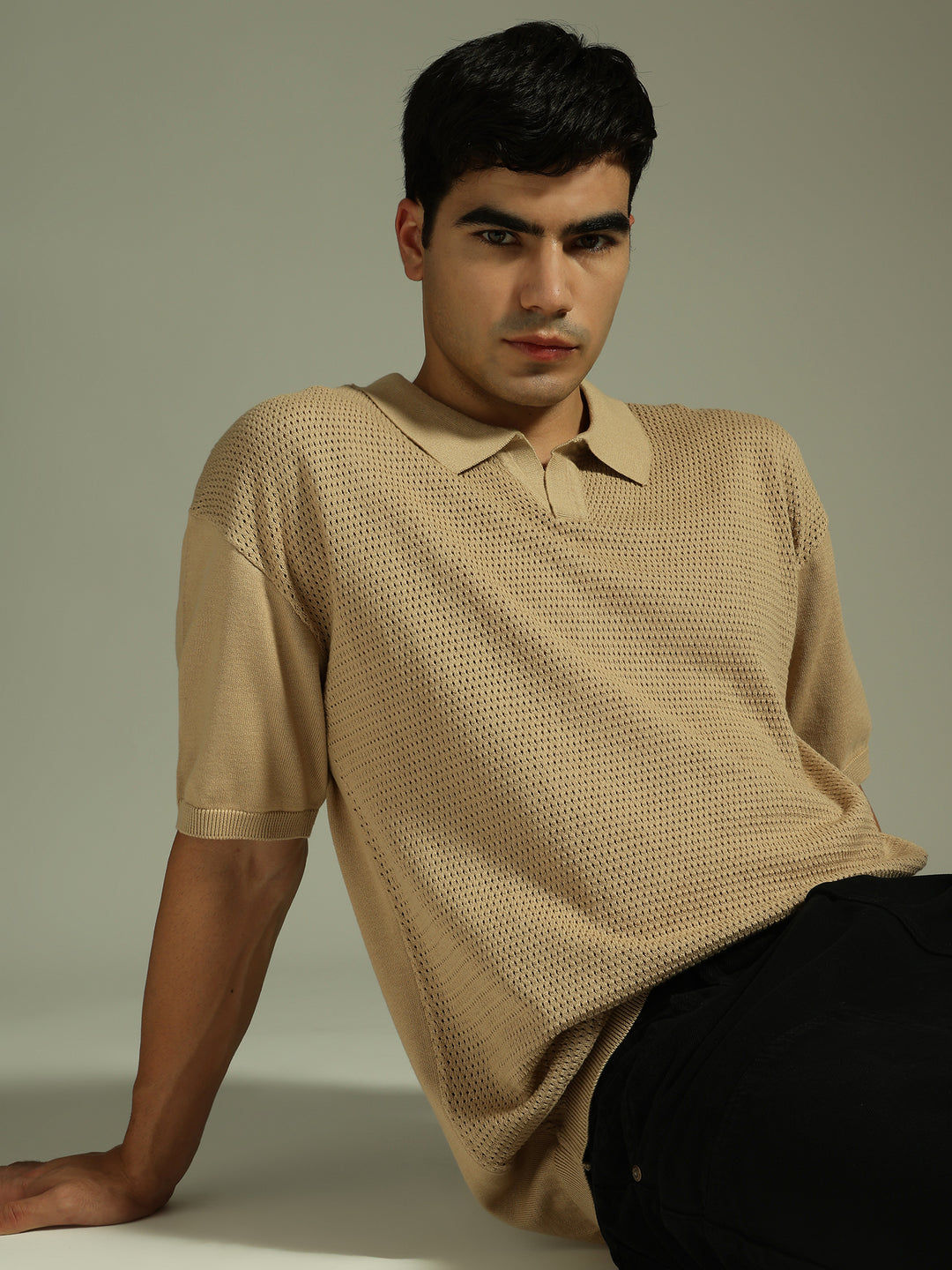 Light Brown Textured Oversized Semi Sheer Knitted T-shirt ,has a Polo collar, no pocket, Half regular sleeves, full front coverage Self Design