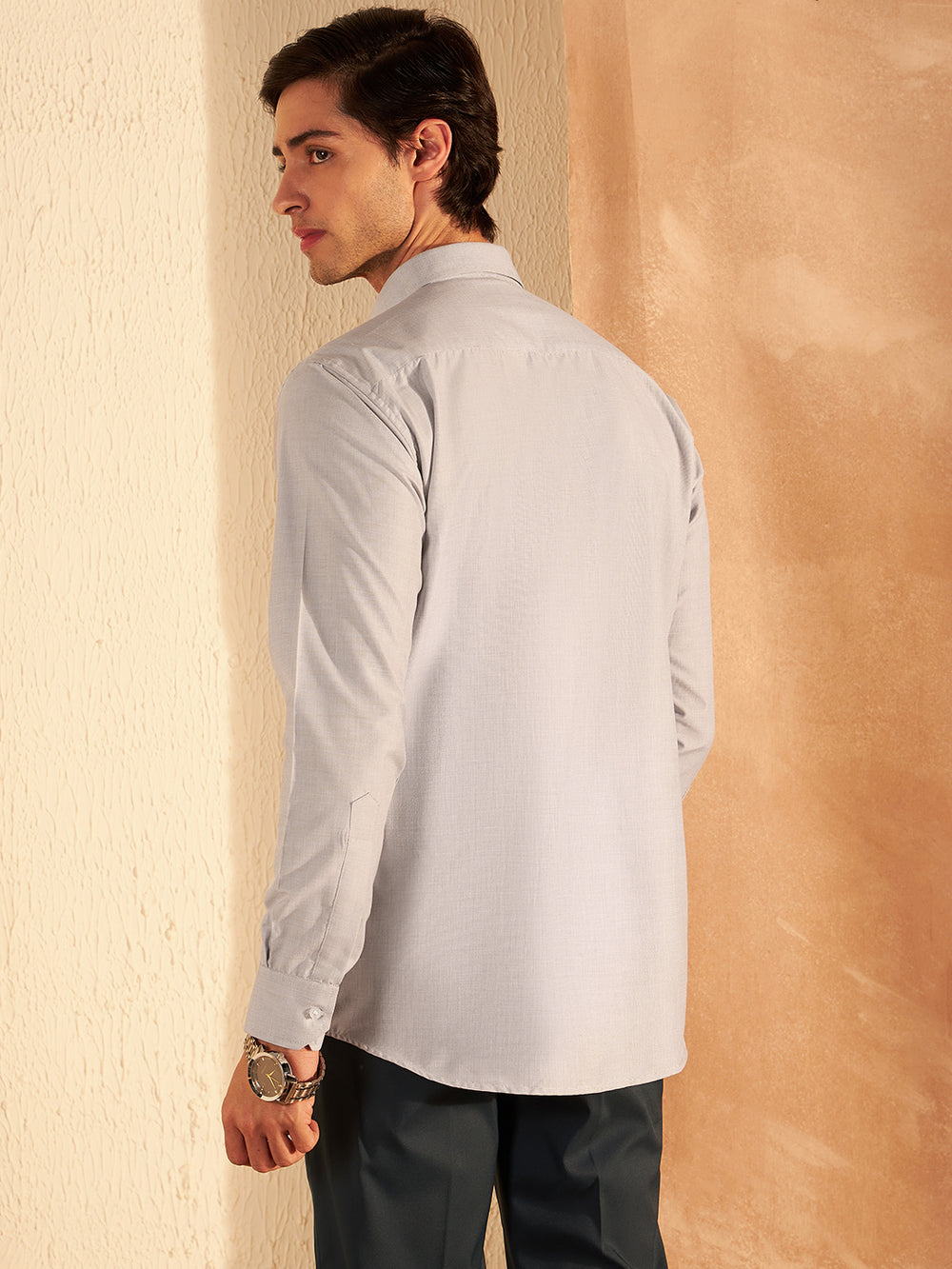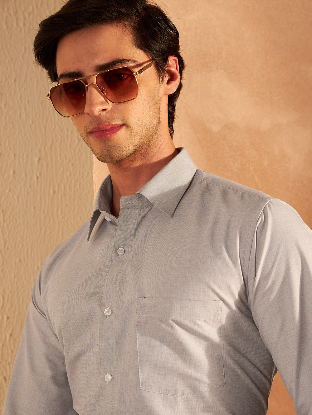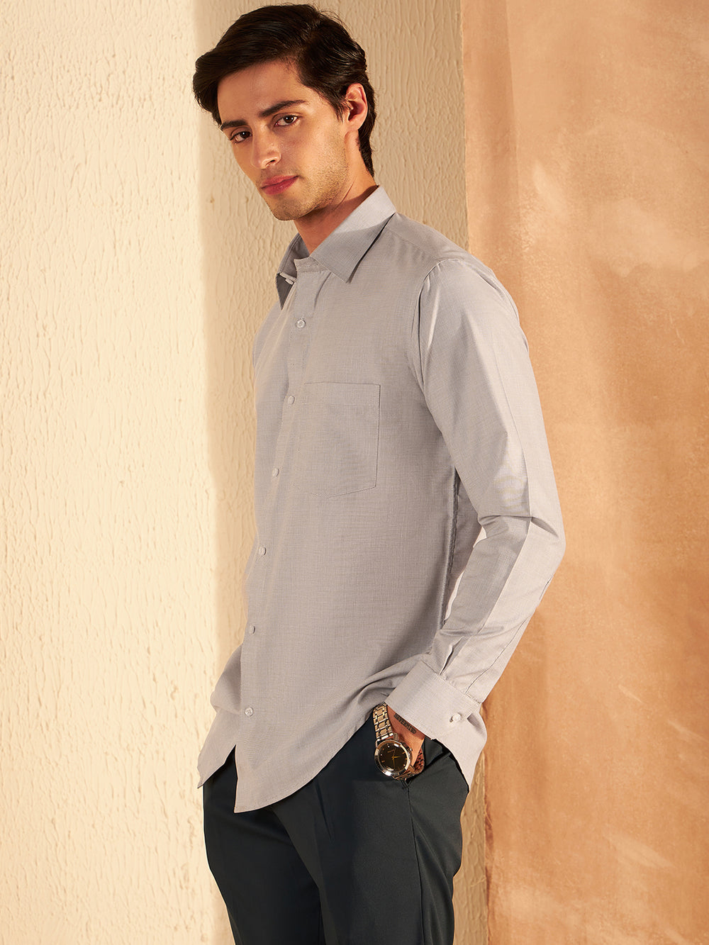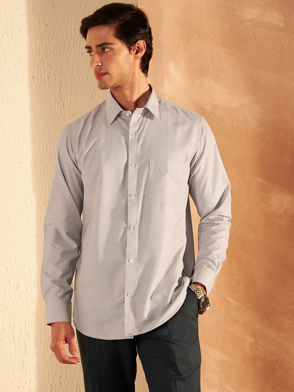 Light Grey solid opaque casual shirt, has a spread collar, button placket, 1 patch pocket, long regular sleeves, curved hem