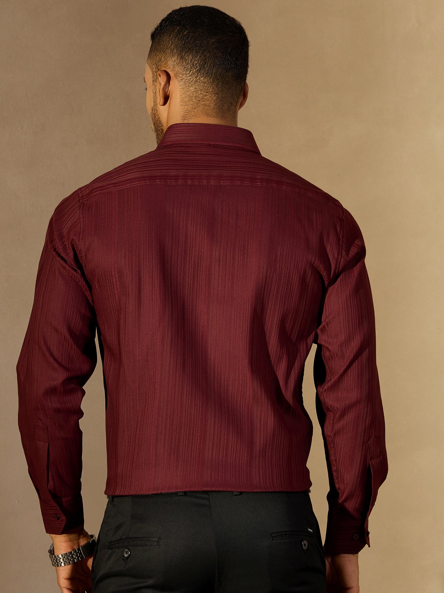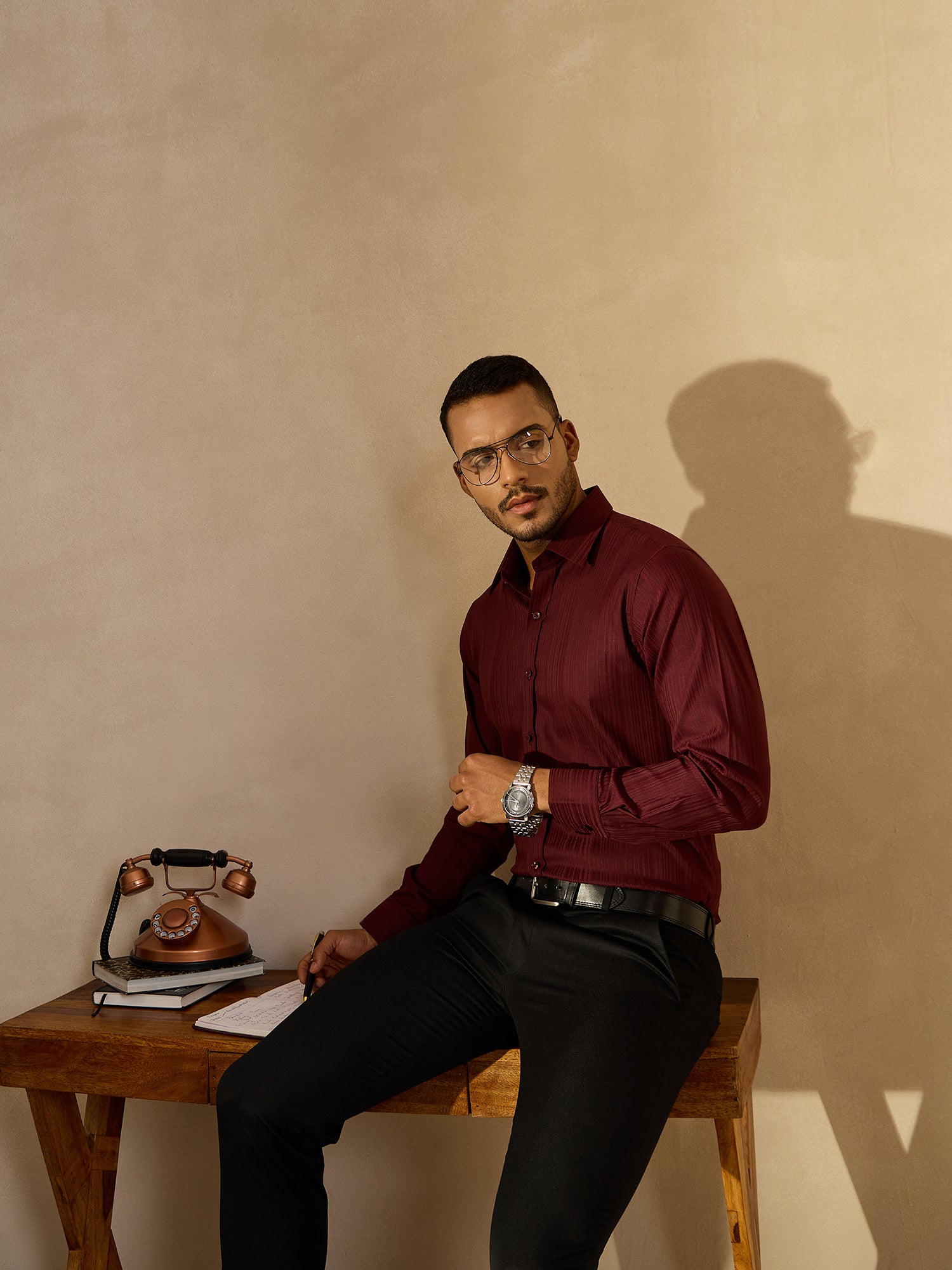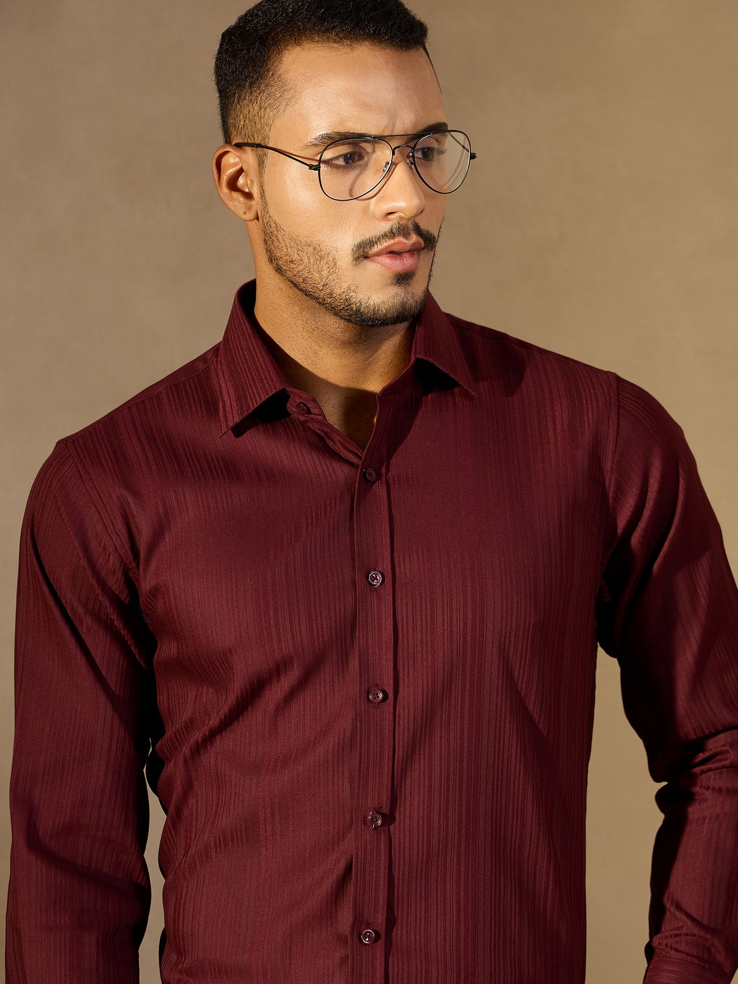 Maroon textured striped opaque formal shirt, has a spread collar, button placket, long regular sleeves, curved hem