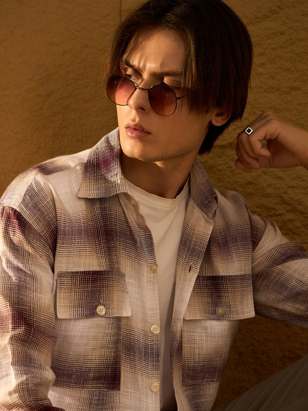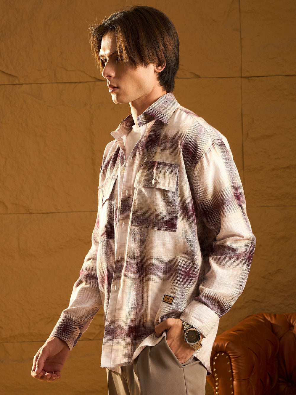 Maroon and Cream checked shacket featuring a spread collar, drop shoulders, oversized fit, full sleeves, 2 Patch pockets, and a stylish curved hemline