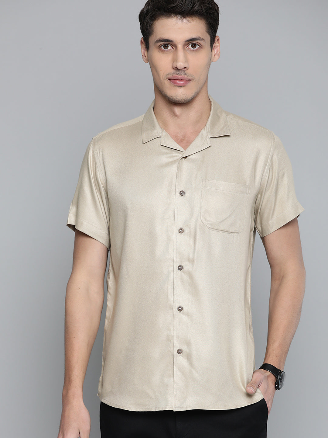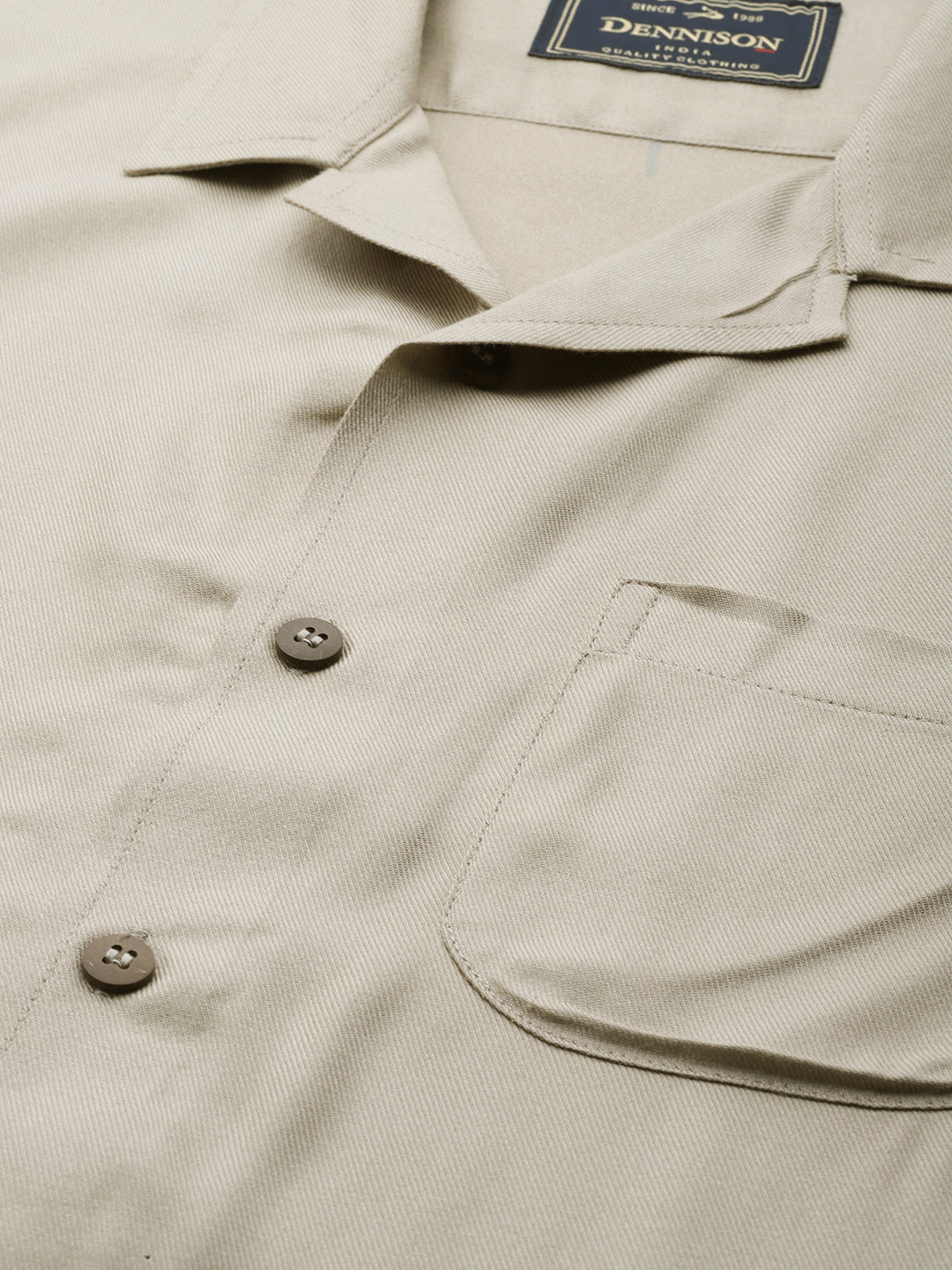 Beige solid opaque Casual shirt ,has a cuban collar, button placket, 1 patch pocket, short regular sleeves, curved hem