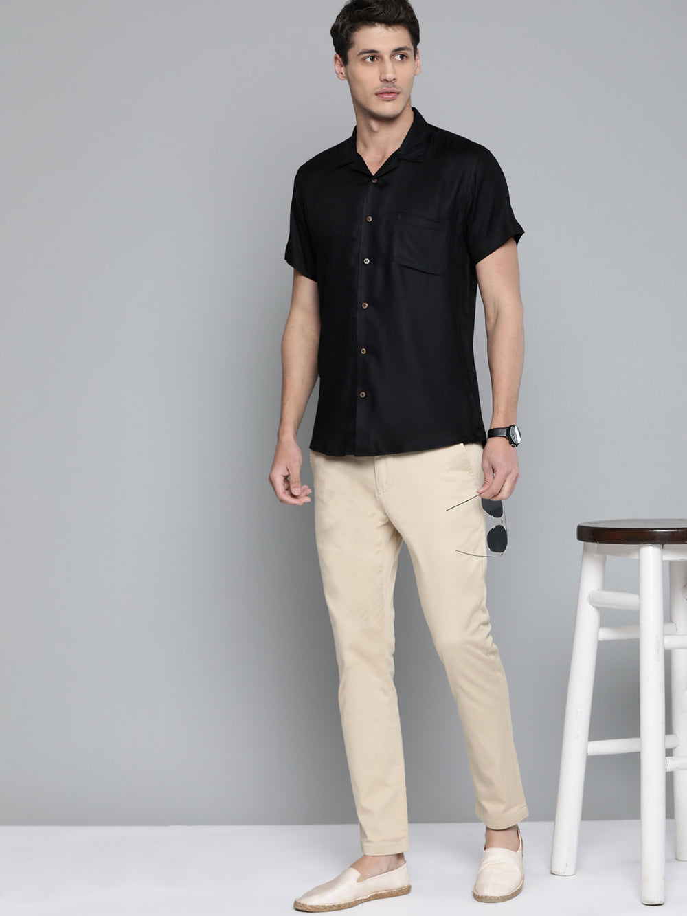 Black solid opaque Casual shirt ,has a cuban collar, button placket, 1 patch pocket, short regular sleeves, curved hem