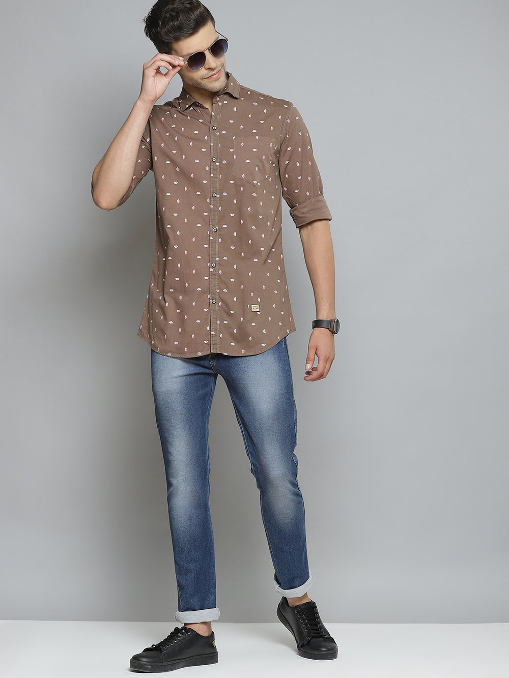 Brown conversational printed opaque Casual shirt ,has a spread collar, button placket, 1 patch pocket, long roll-up sleeves, curved hem
