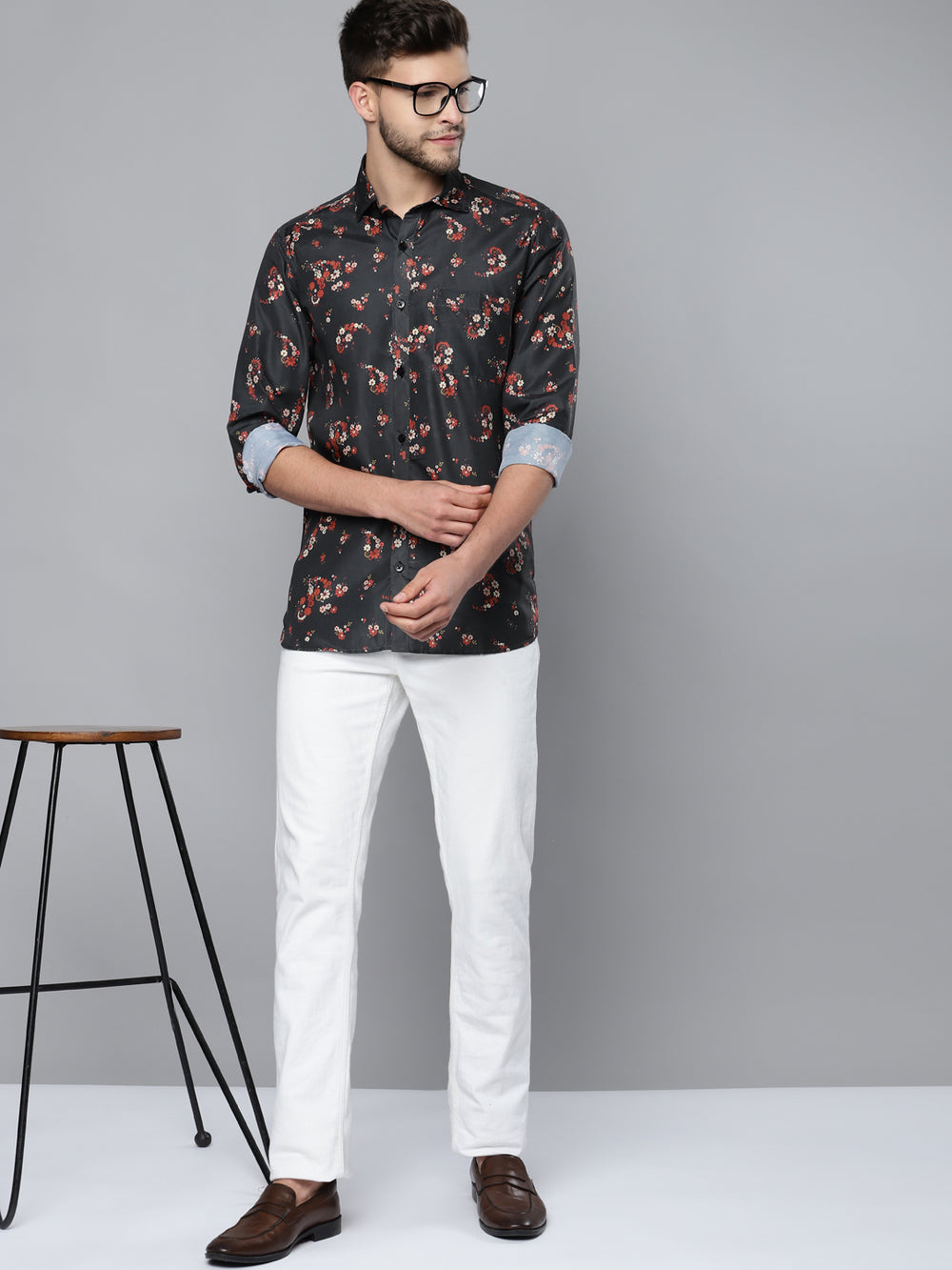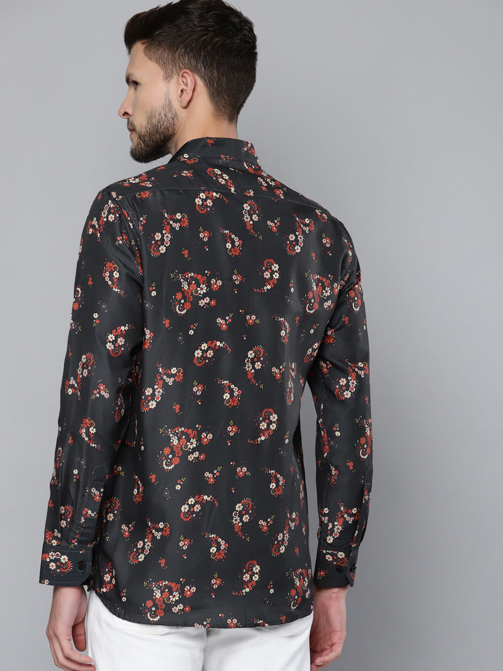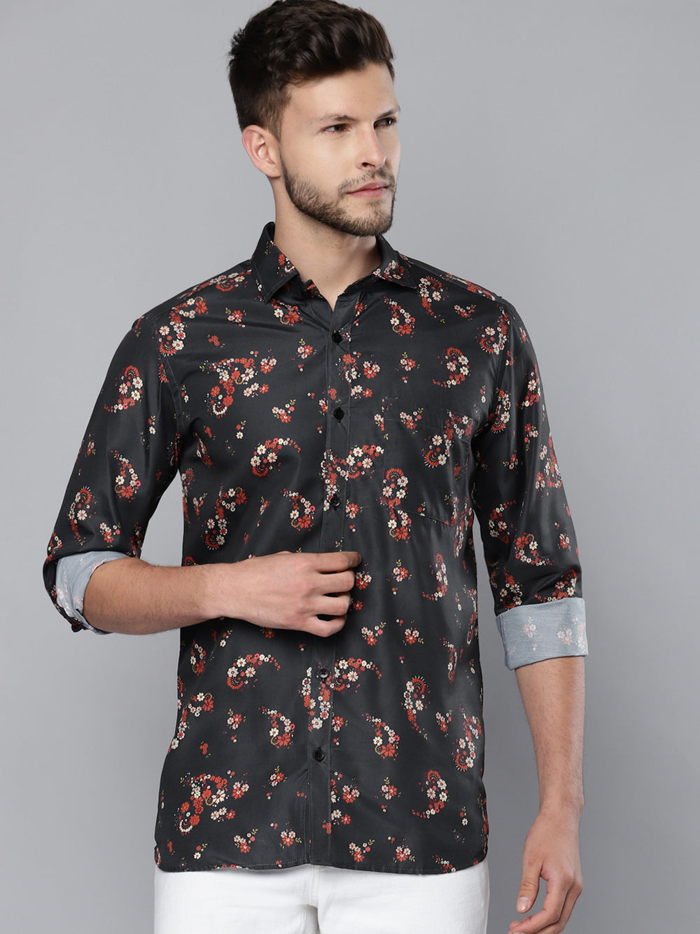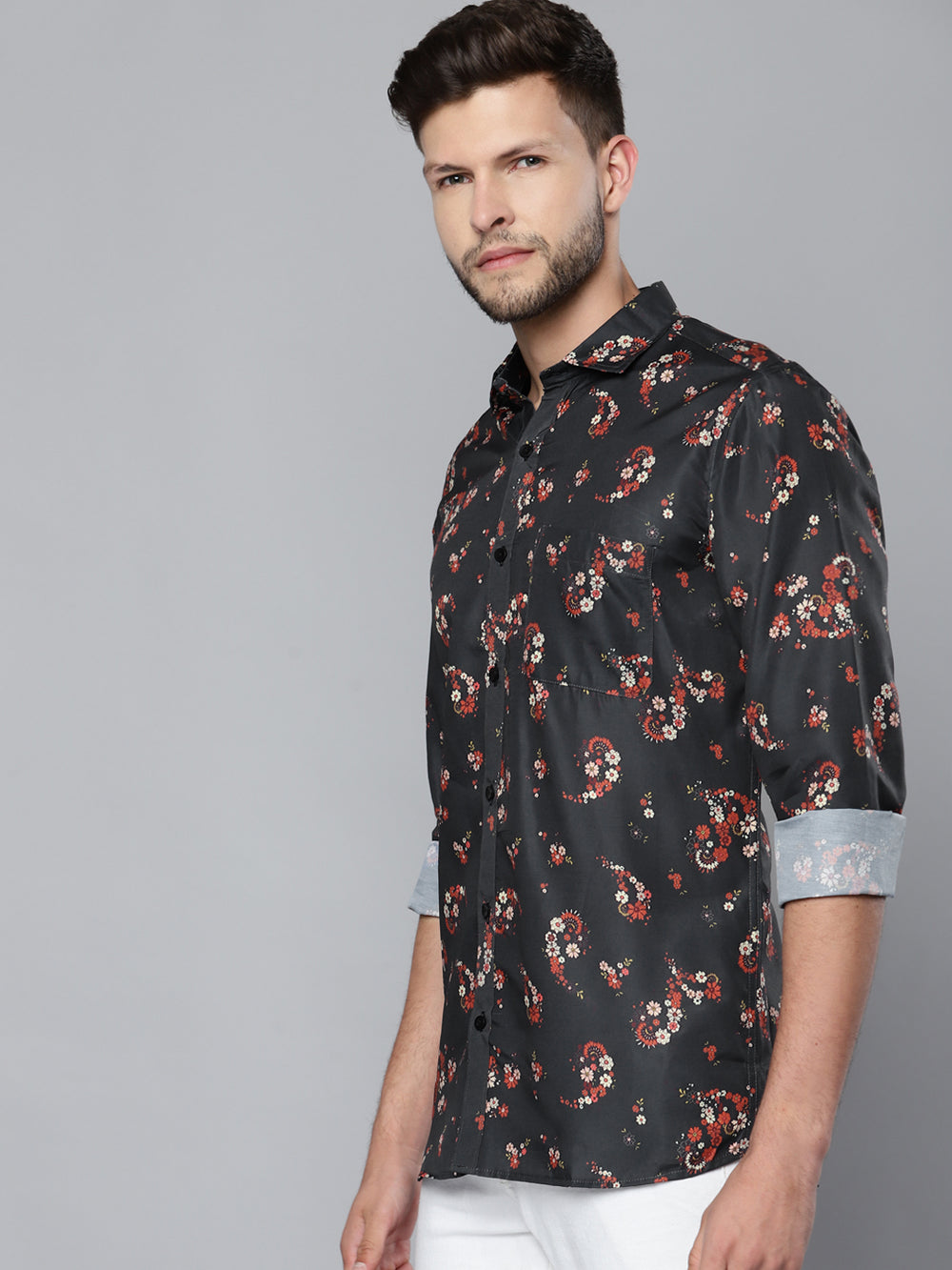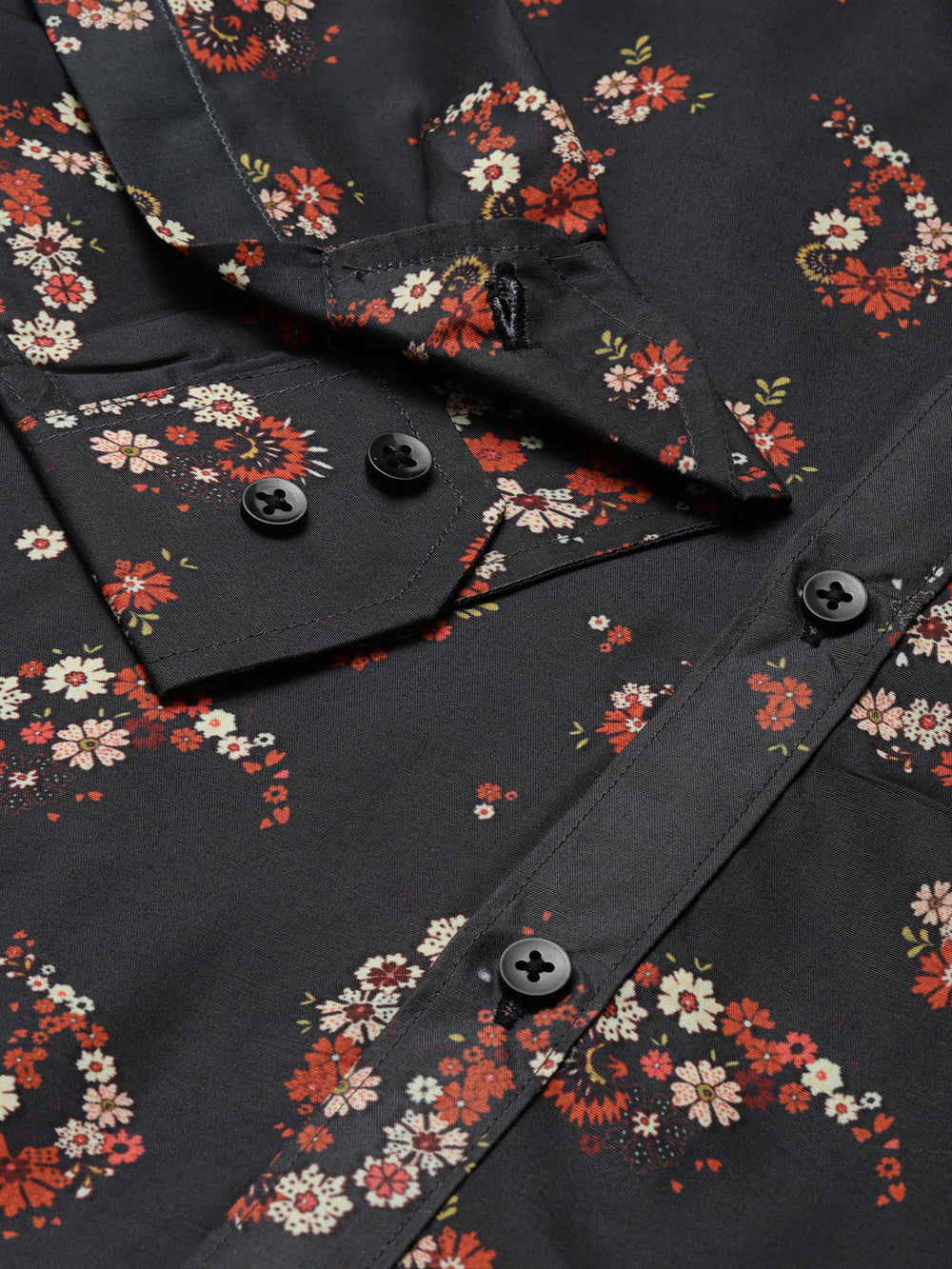 Charcoal floral printed opaque Formal shirt ,has a spread collar, button placket, 1 patch pocket, long regular sleeves, curved hem