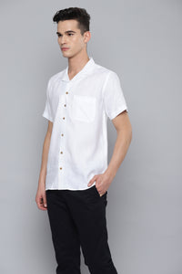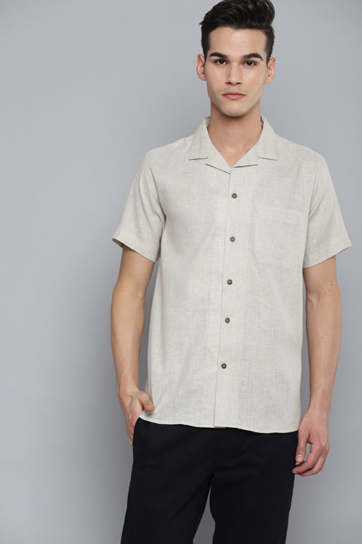 Beige solid opaque Casual shirt ,has a cuban collar, button placket, 1 patch pocket, short regular sleeves, curved hem