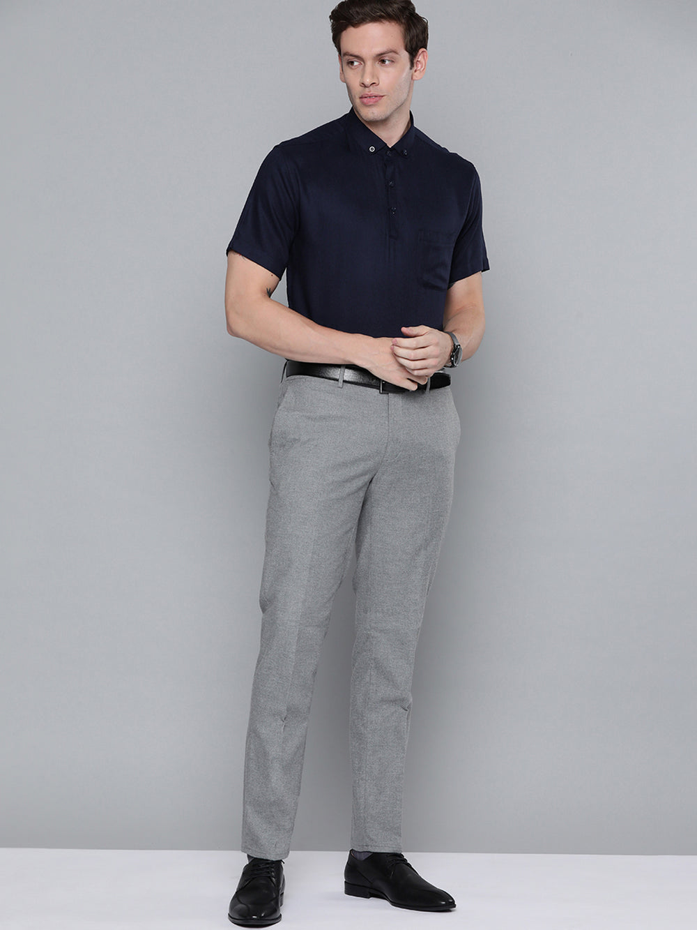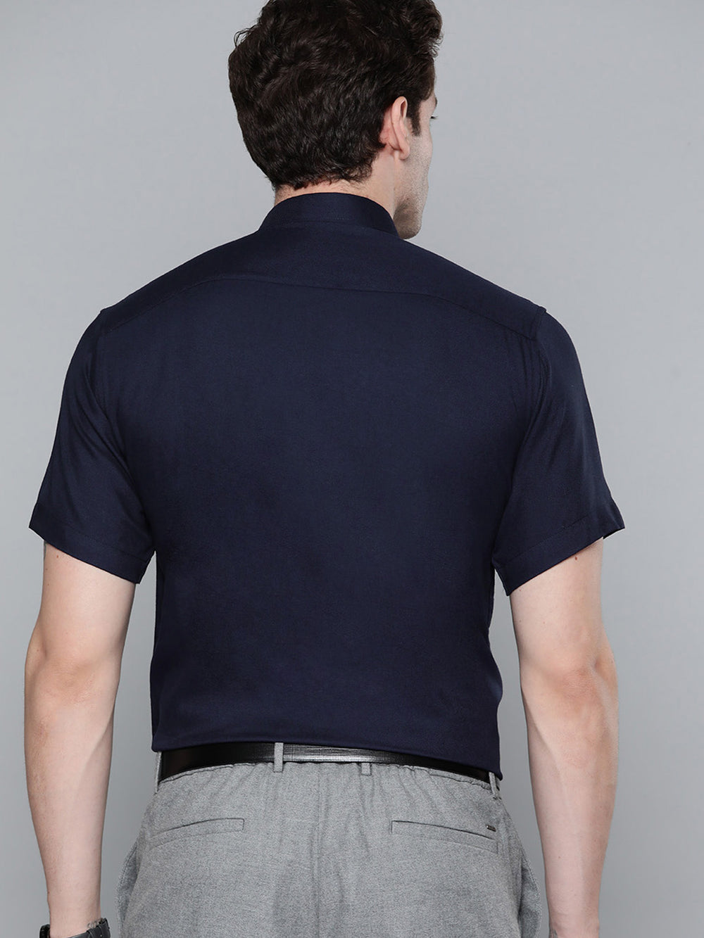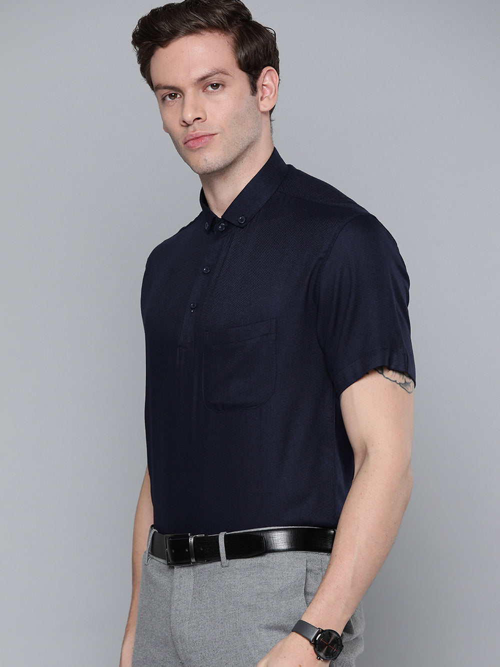 Navy blue solid opaque Formal shirt ,has a button-down collar, button placket, 1 patch pocket, short regular sleeves, curved hem