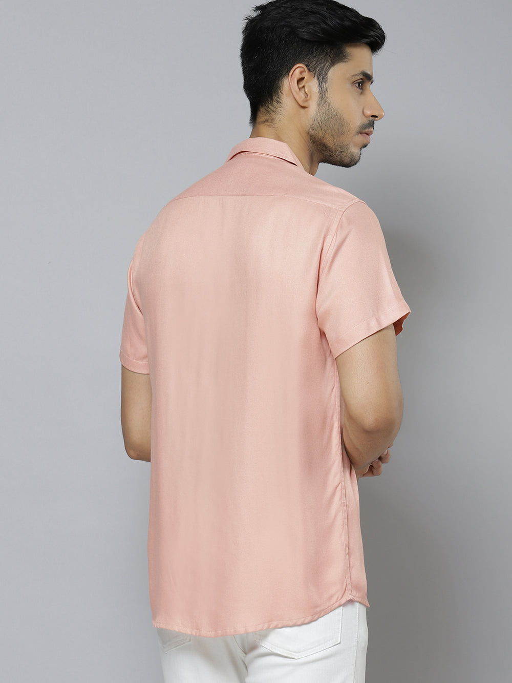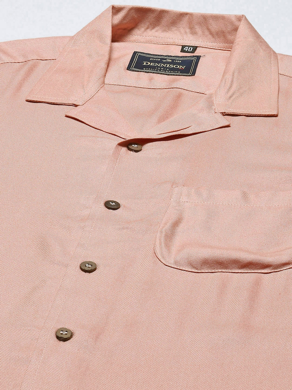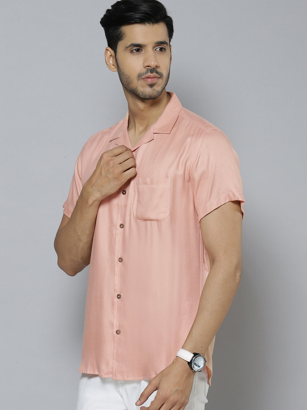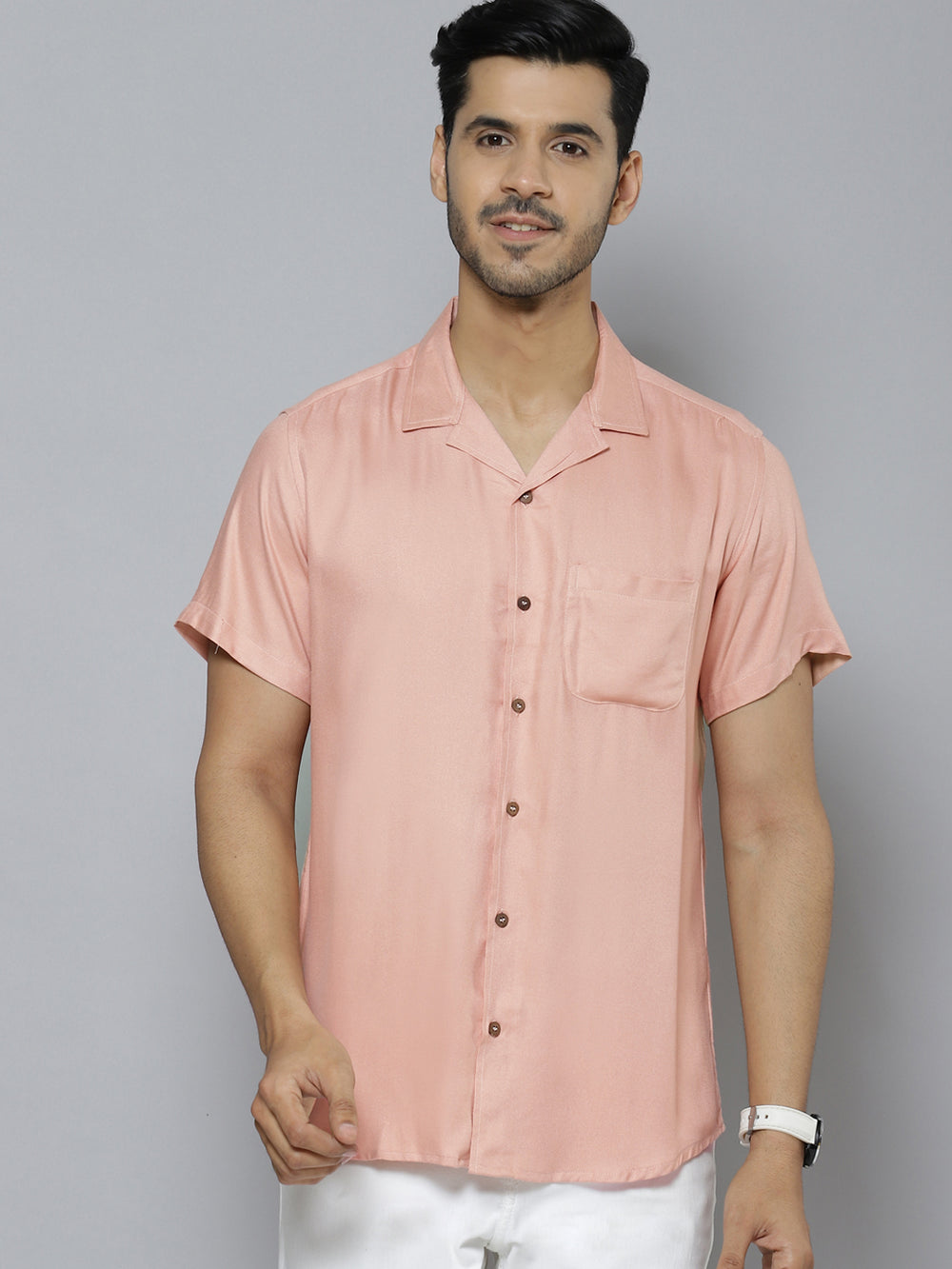 Peach-coloured solid opaque casual shirt, has a cuban collar, button placket, 1 patch pocket, short regular sleeves, curved hem