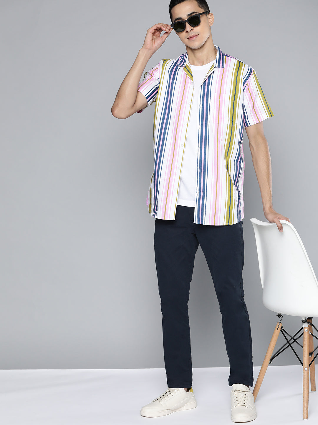Pink, blue and green multi stripes striped opaque Casual shirt ,has a cuban collar, button placket, 1 patch pocket, short regular sleeves, curved hem