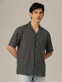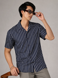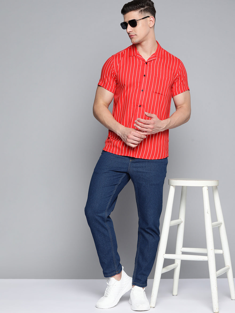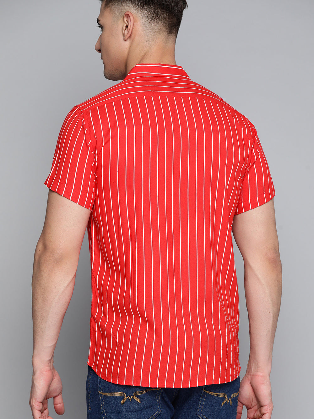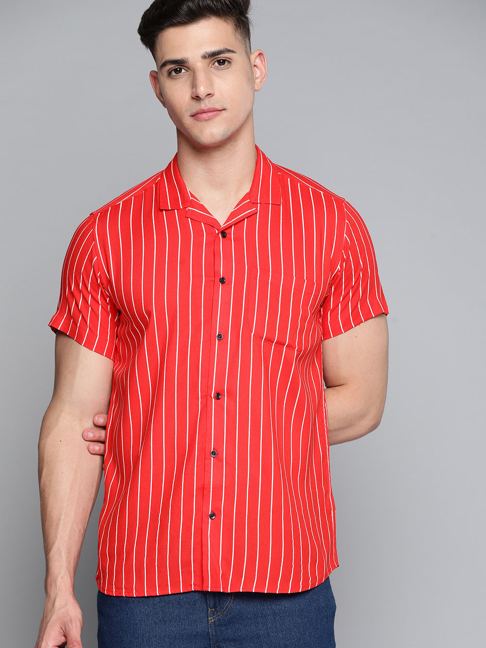 Red striped casual shirt, has a cuban collar, button placket, 1 patch pocket, short regular sleeves, curved hem