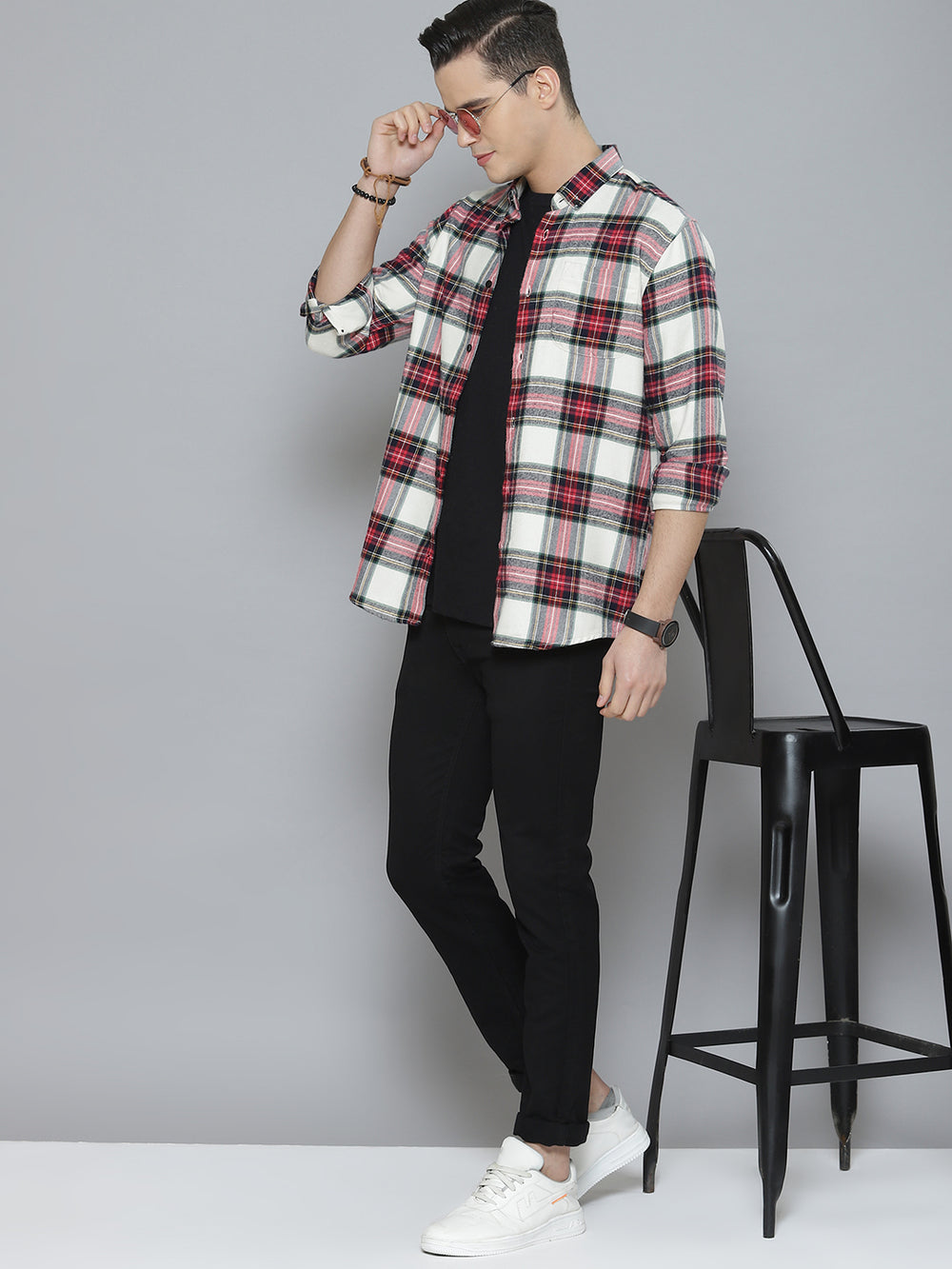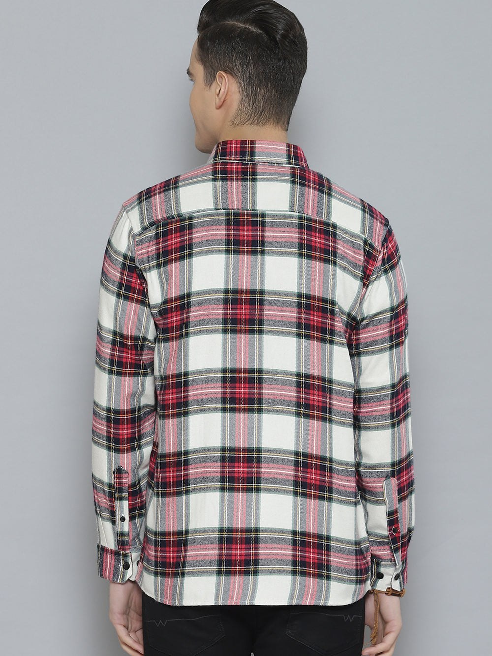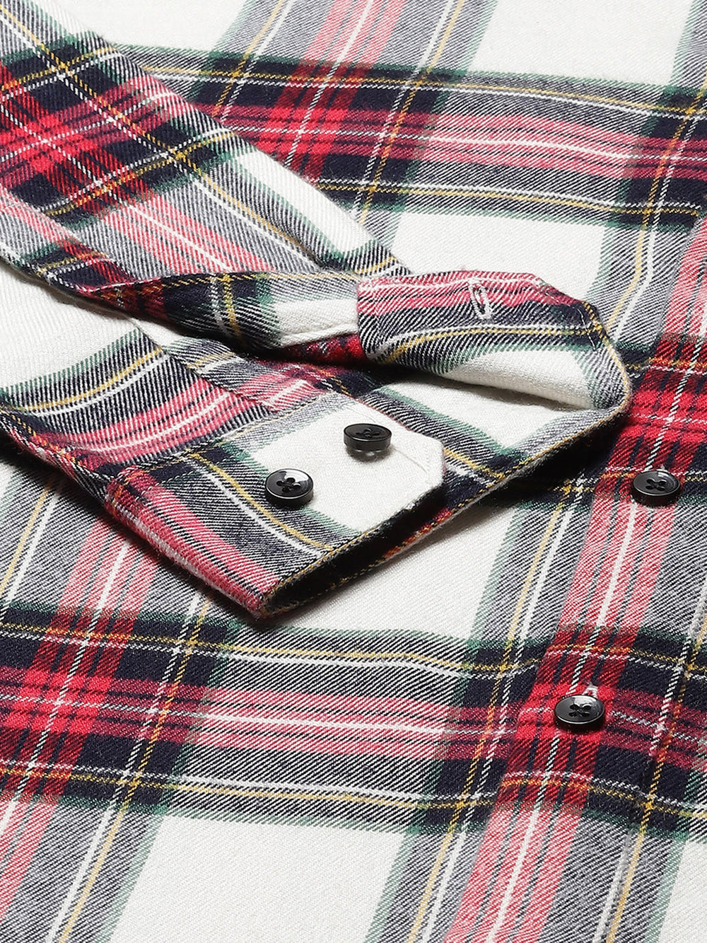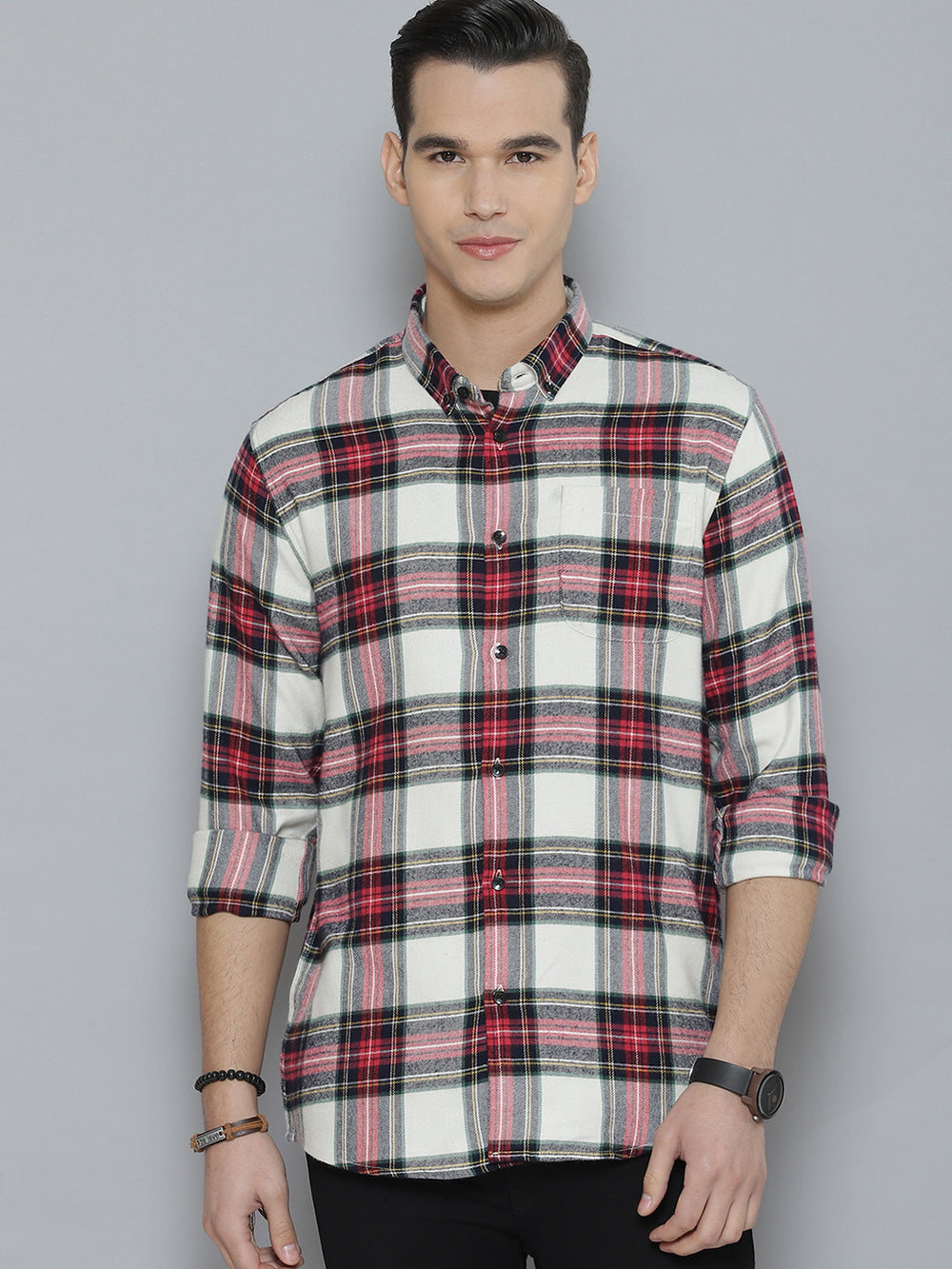 White & Red tartan checked opaque Casual shirt ,has a button-down collar, button placket, 1 patch pocket, long regular sleeves, curved hem