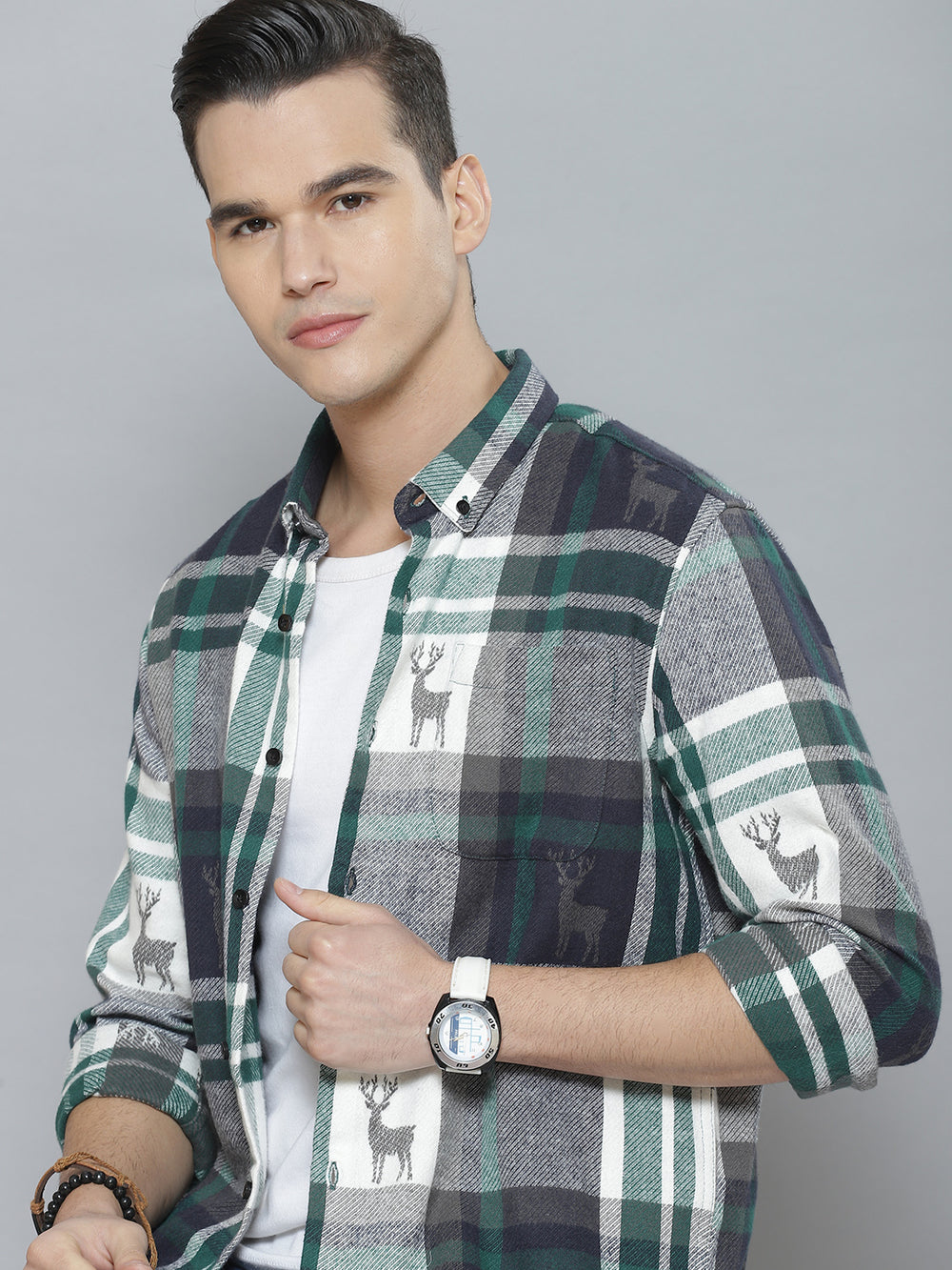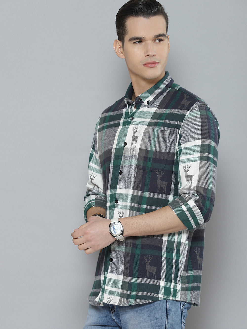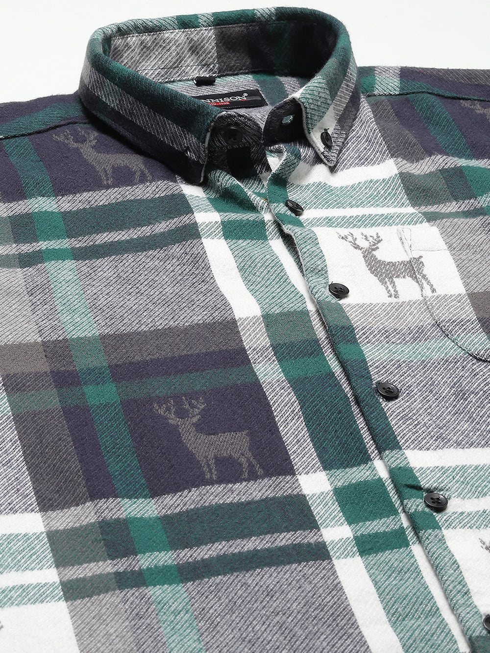 White & Green tartan checked opaque Casual shirt ,has a button-down collar, button placket, 1 patch pocket, long regular sleeves, curved hem