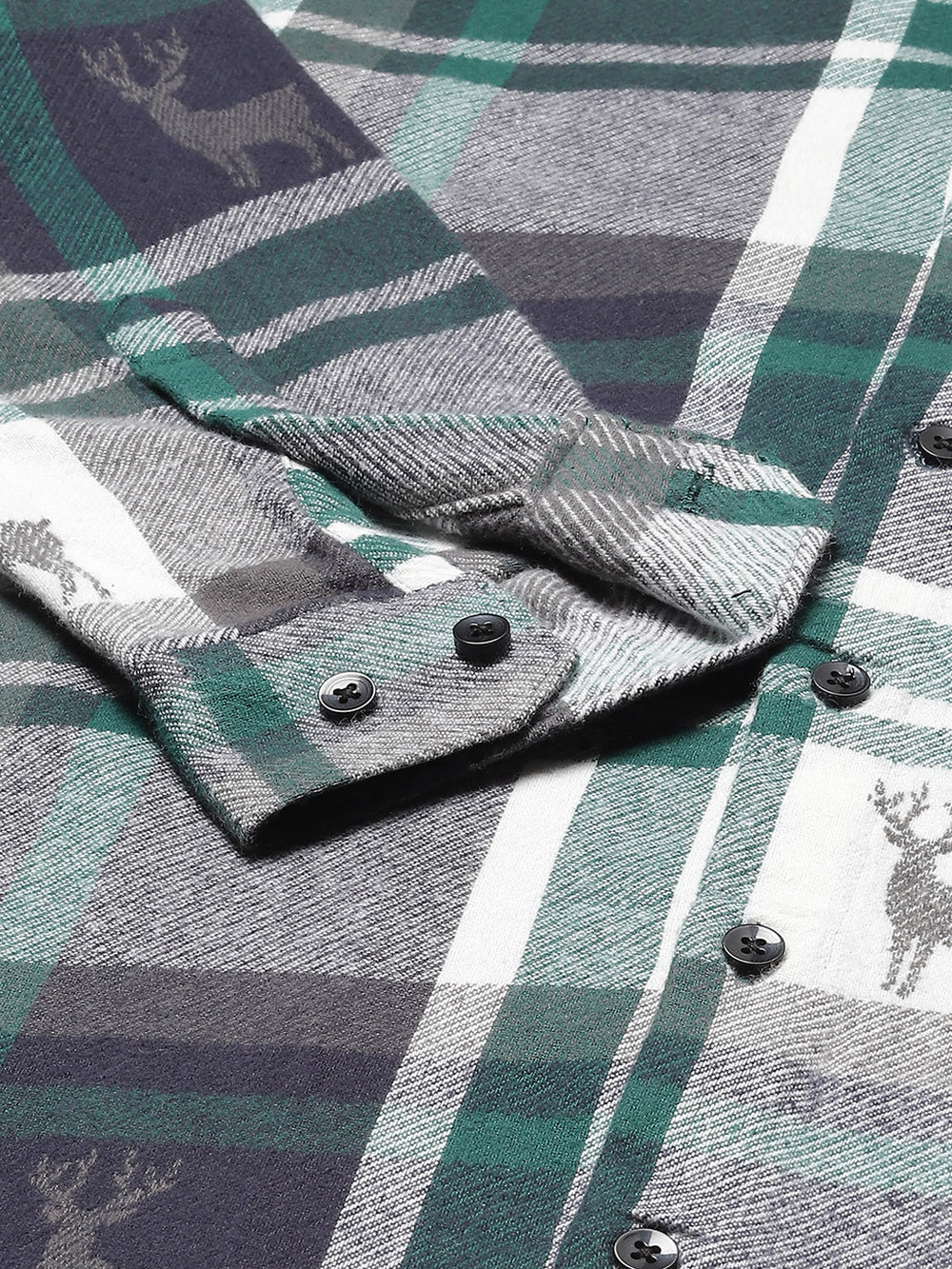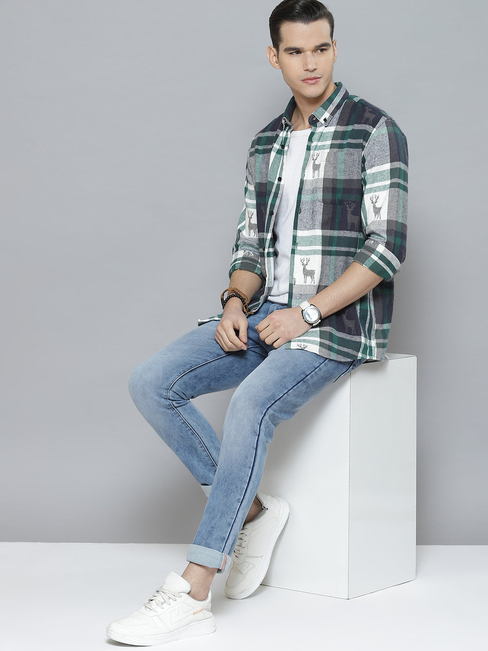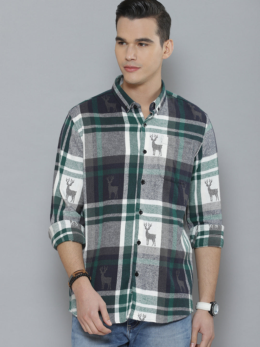 White & Green tartan checked opaque Casual shirt ,has a button-down collar, button placket, 1 patch pocket, long regular sleeves, curved hem