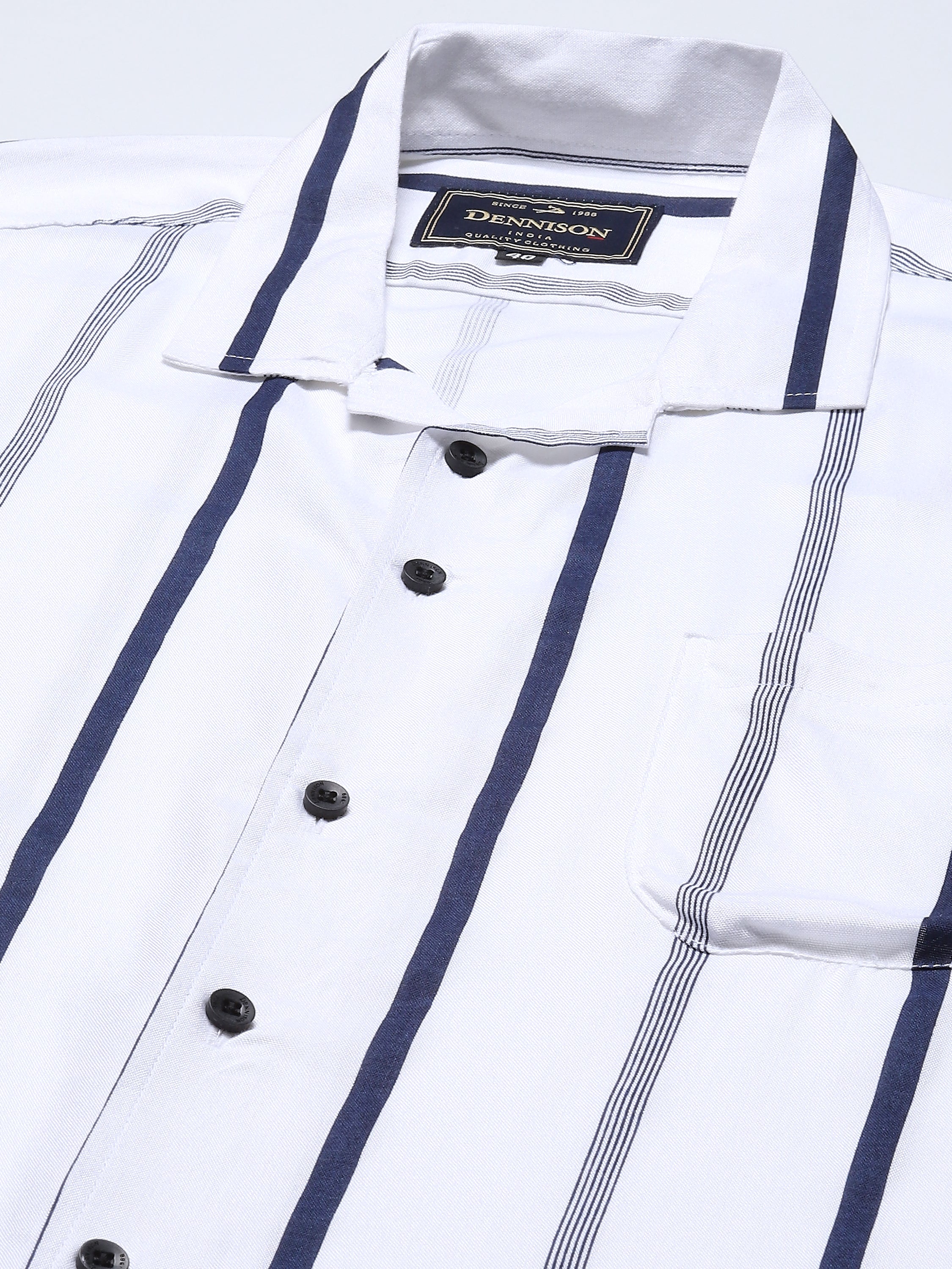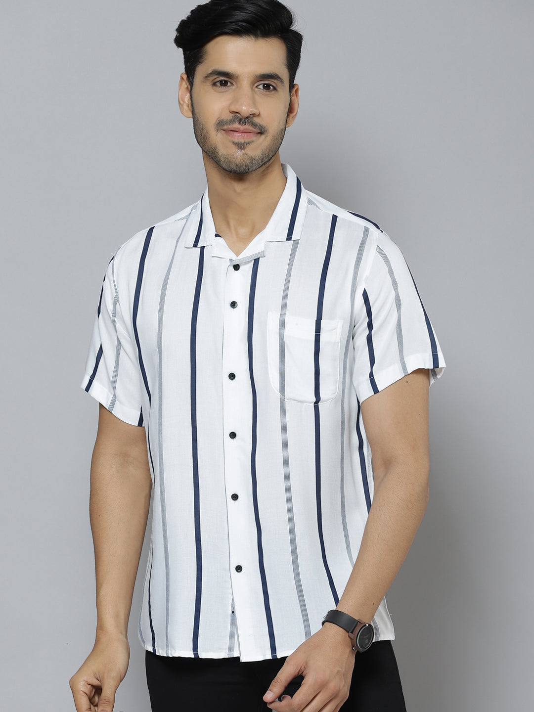 White and navy blue smart slim-fit striped opaque Casual shirt ,has a cuban collar, button placket, 1 patch pocket, short regular sleeves, curved hem