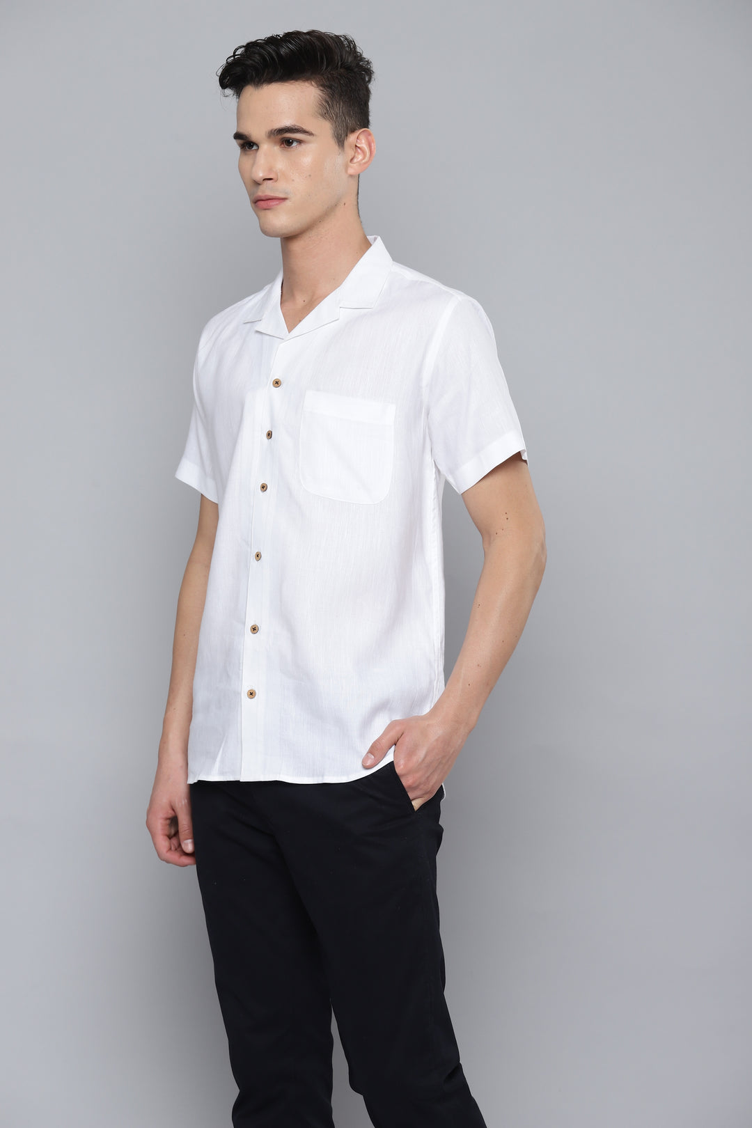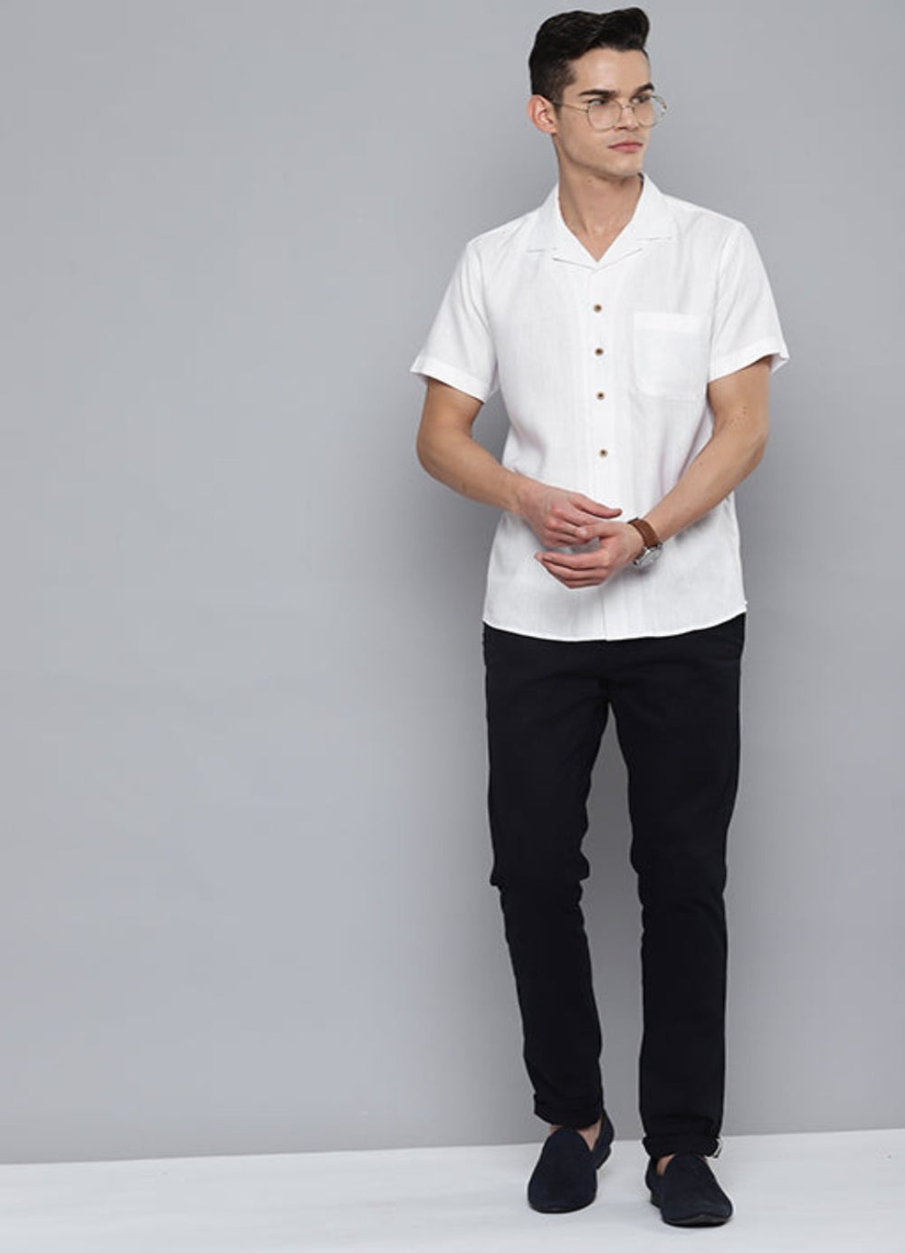 White solid opaque Casual shirt ,has a cuban collar, button placket, 1 patch pocket, short regular sleeves, curved hem