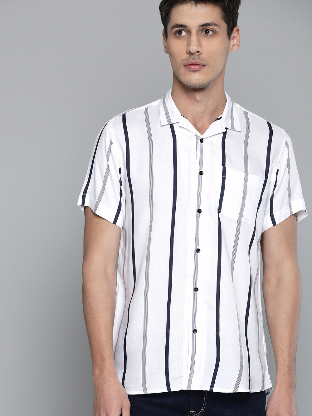 White and navy blue vertical stripes opaque casual shirt, has a cuban collar, full button placket, 1 patch pocket at chest, short regular sleeves, curved hem
