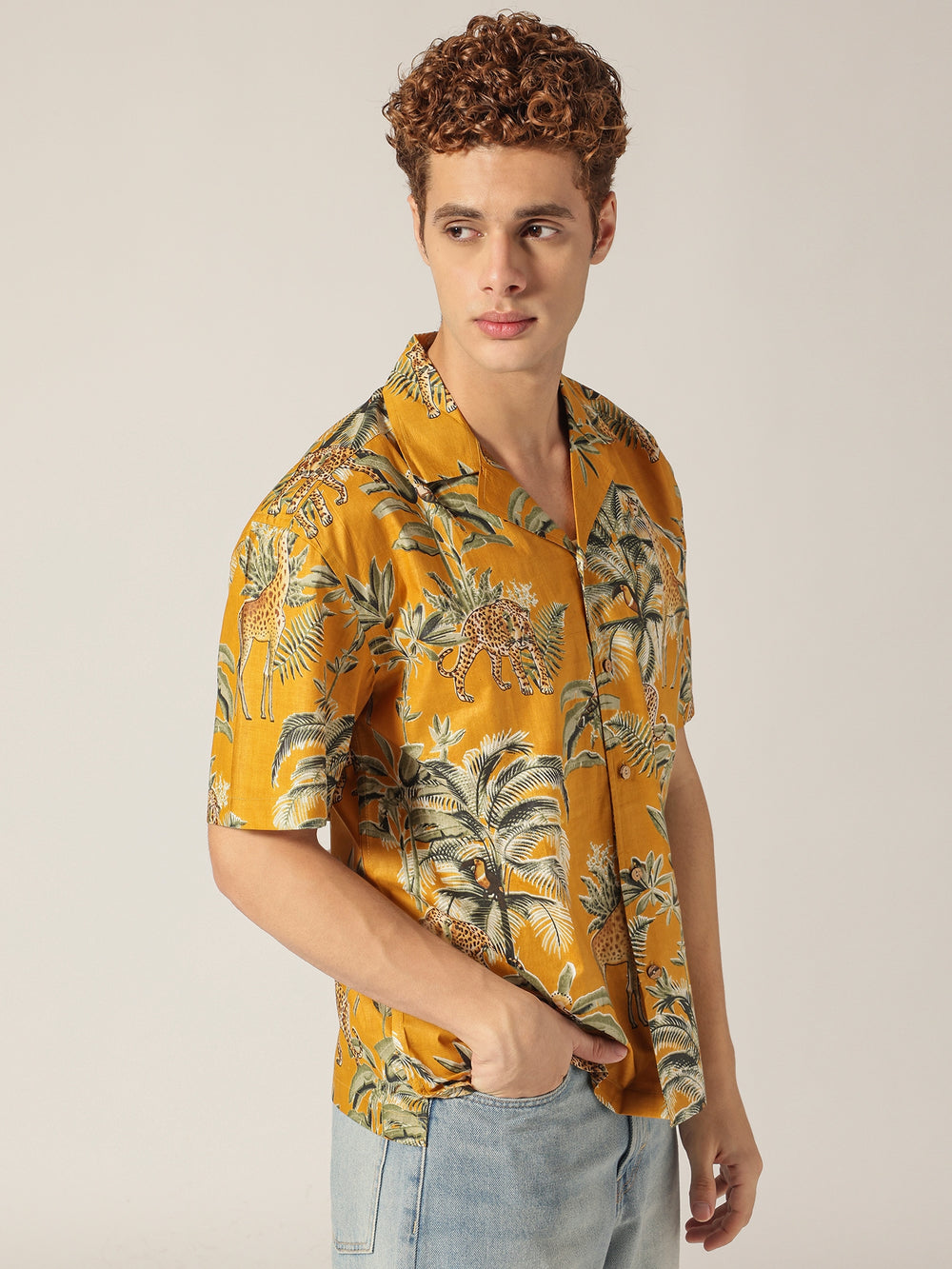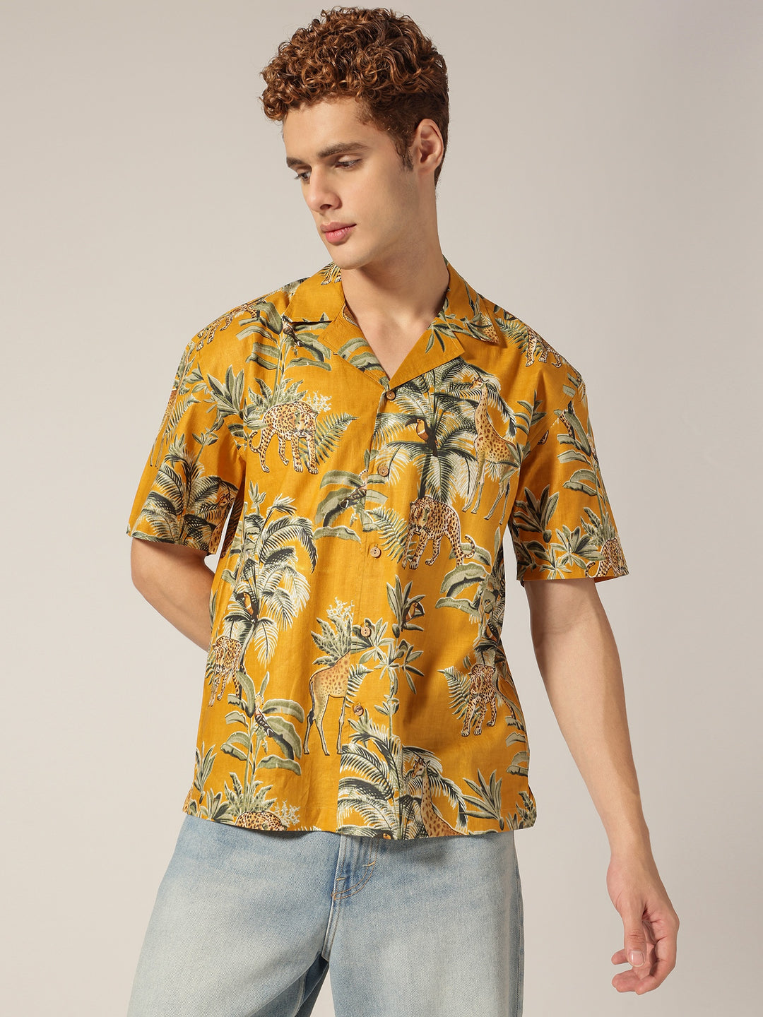 Mustard & This Oversized Fit Casual shirt is made from soft, breathable Cotton, featuring bold Animal Block Printed and Tropical Printed motifs. Designed with Drop Shoulder, Cuban Collar, Half Sleeves, Straight Hemline, and no pocket for a clean, relaxed look.