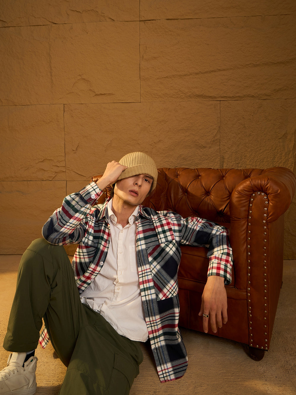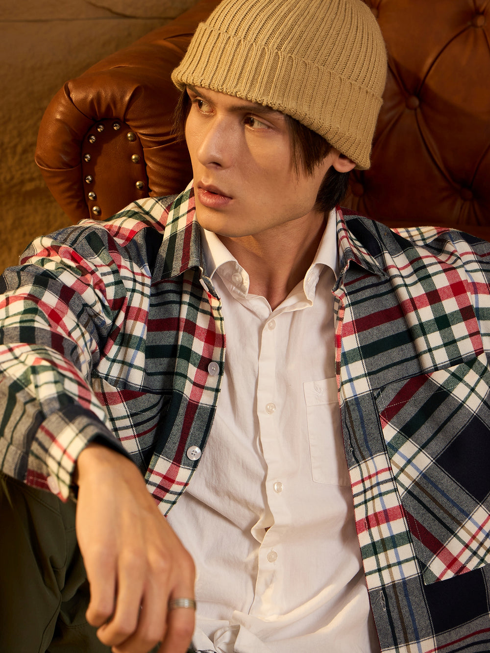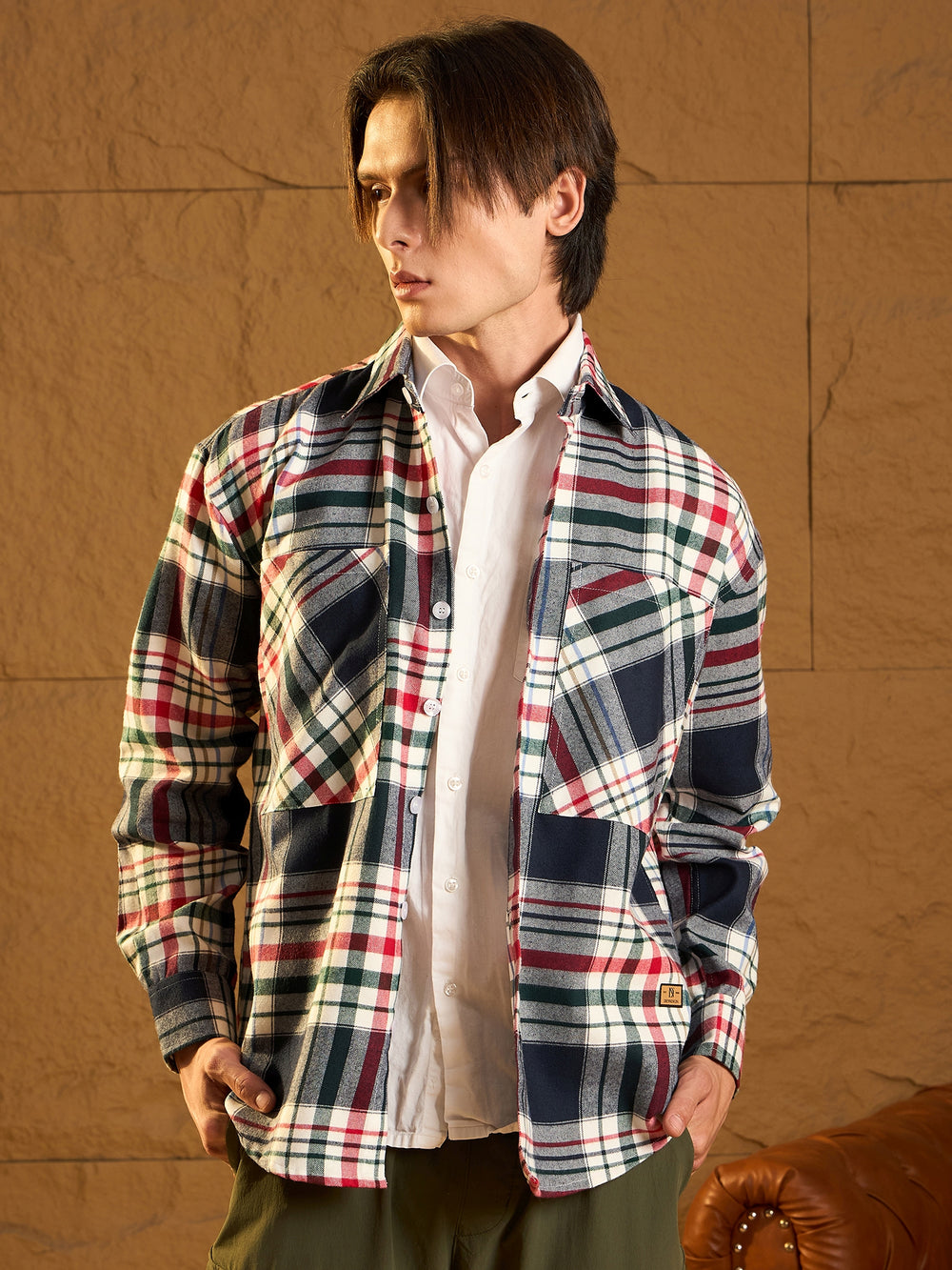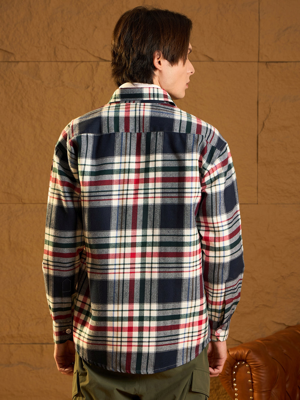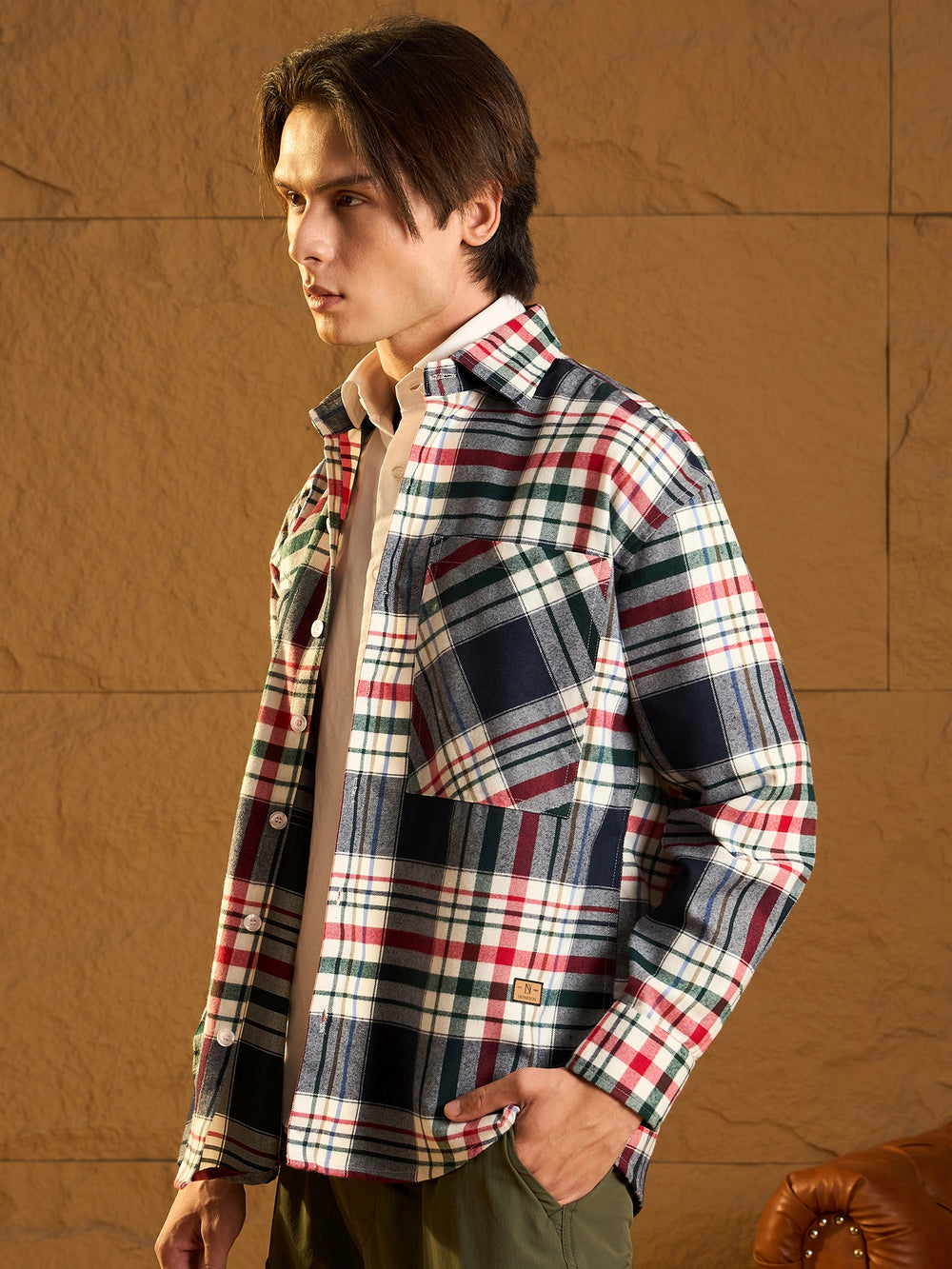 A cozy, versatile oversized shacket crafted from soft cotton with a double-pocket design and dropped shoulders for a relaxed fit. The full sleeves and timeless check pattern add casual-chic appeal, perfect for layering any season.