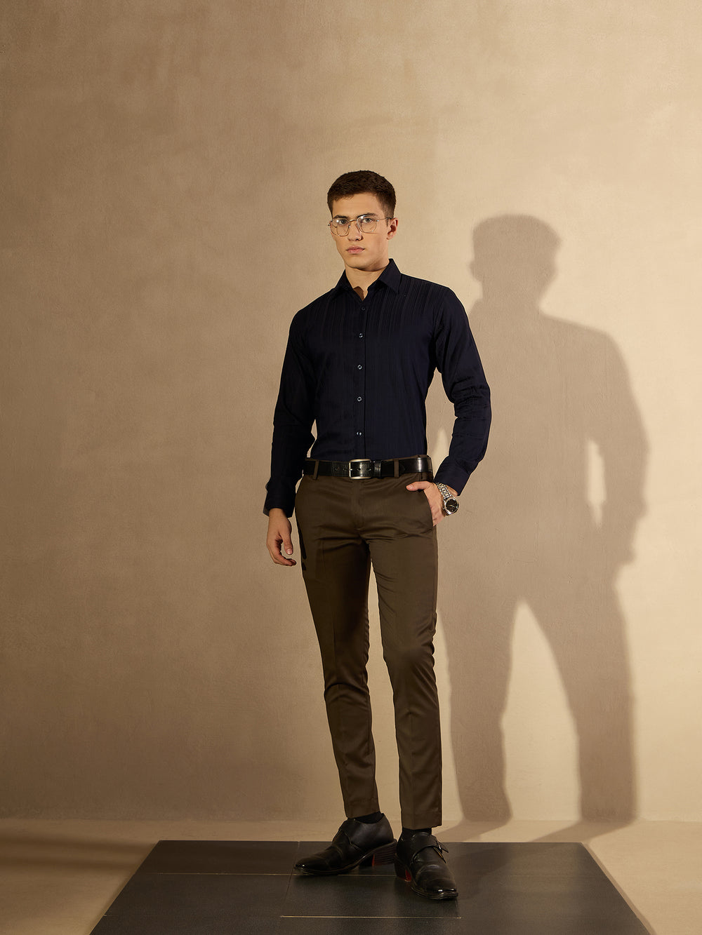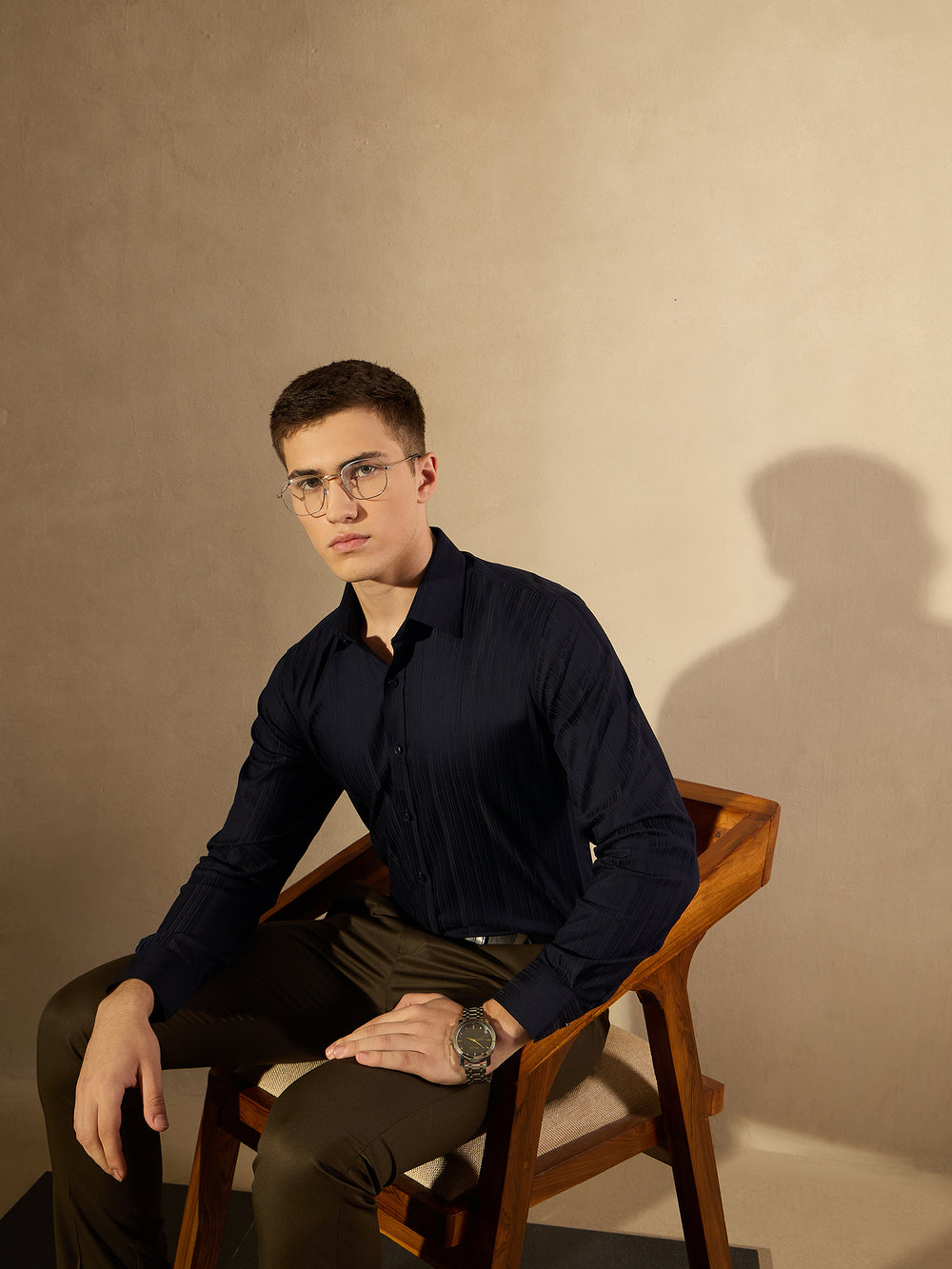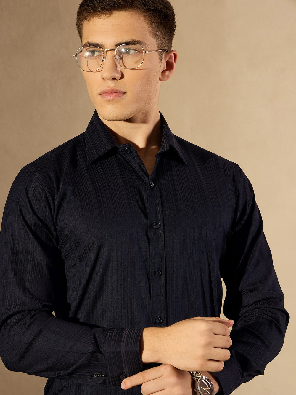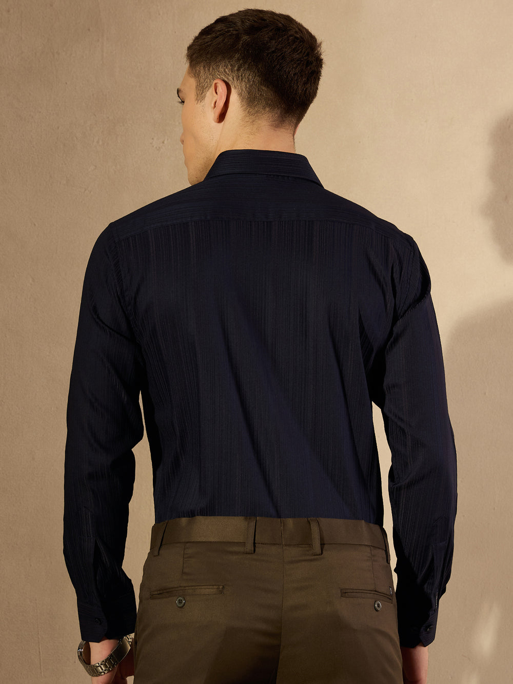 Navy Blue self design striped formal shirt, has a spread collar, button placket, no pocket, long regular sleeves, straight hem