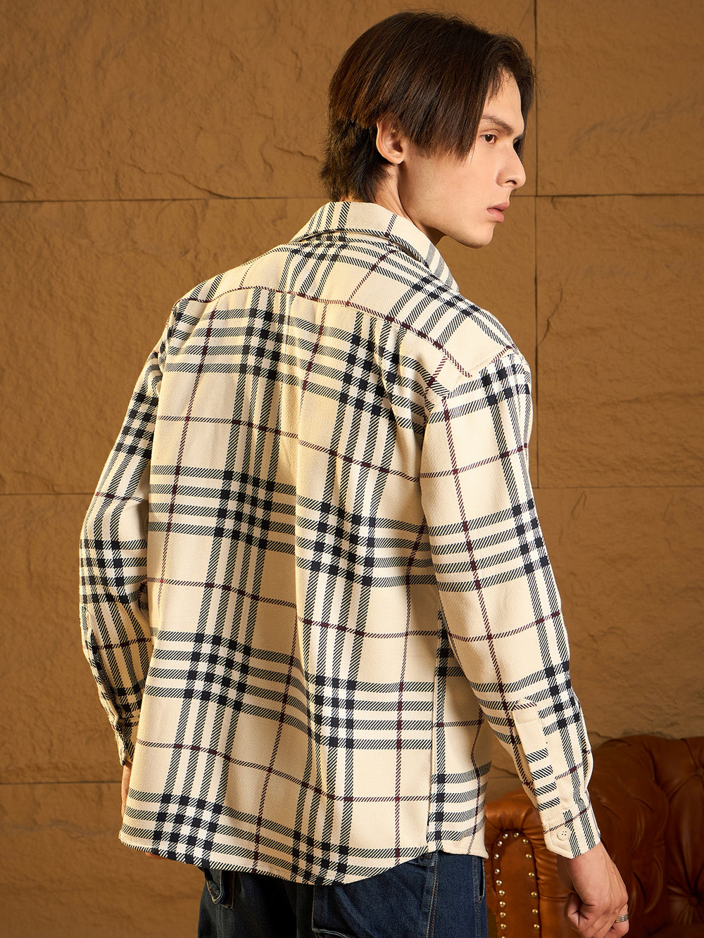 A cozy, versatile oversized Checked shacket crafted from soft cotton with a double-pocket design and dropped shoulders for a relaxed fit. The full sleeves and timeless check pattern add casual-chic appeal, perfect for layering any season.