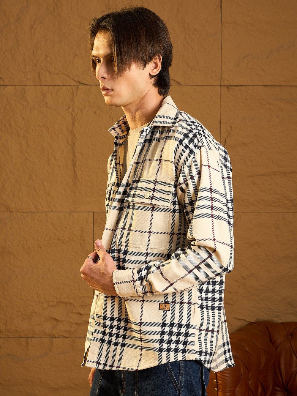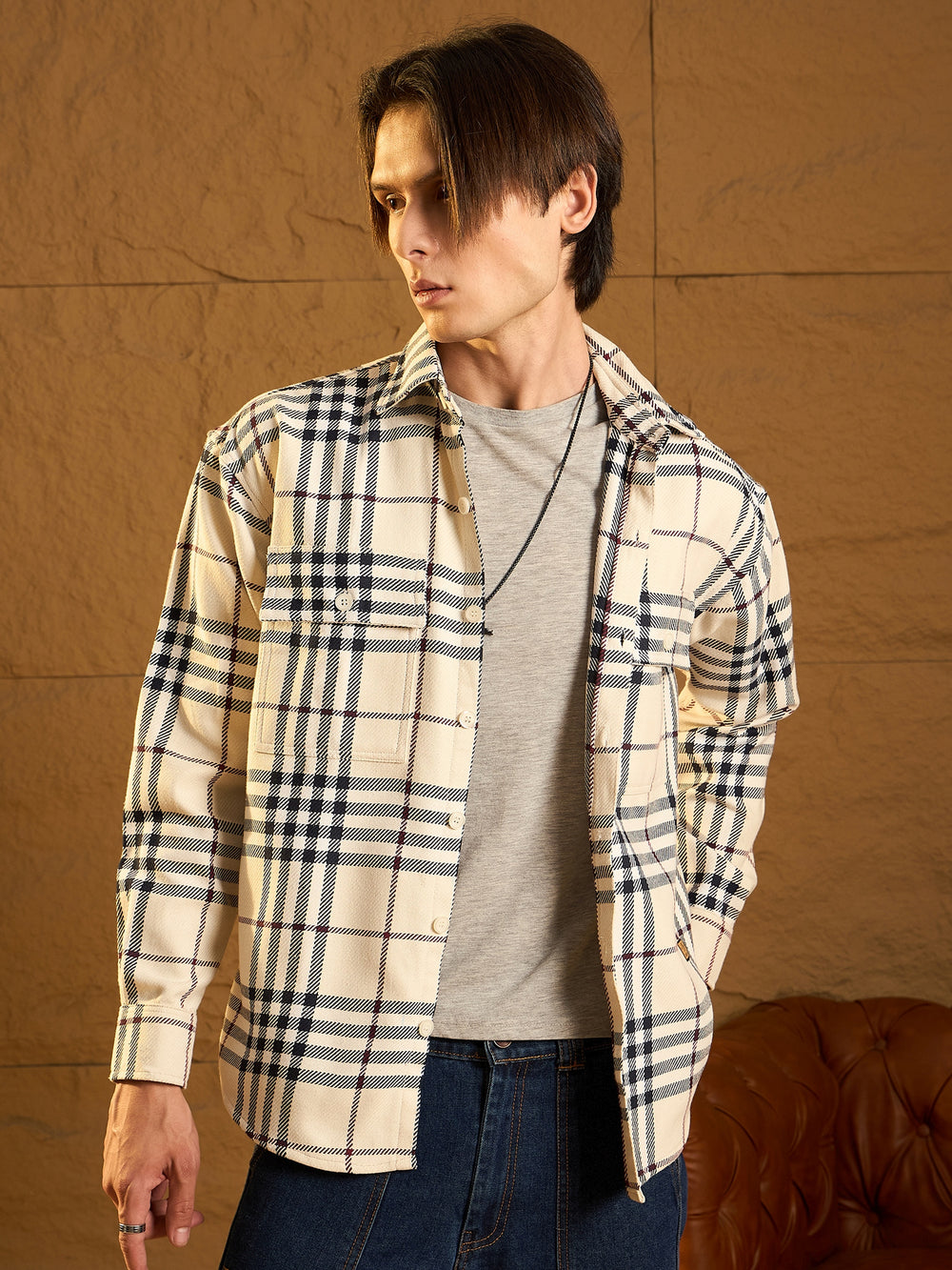 Off White and Black checked shacket featuring a spread collar, drop shoulders, oversized fit, full sleeves, 2 Flap pockets, and a stylish curved hemline