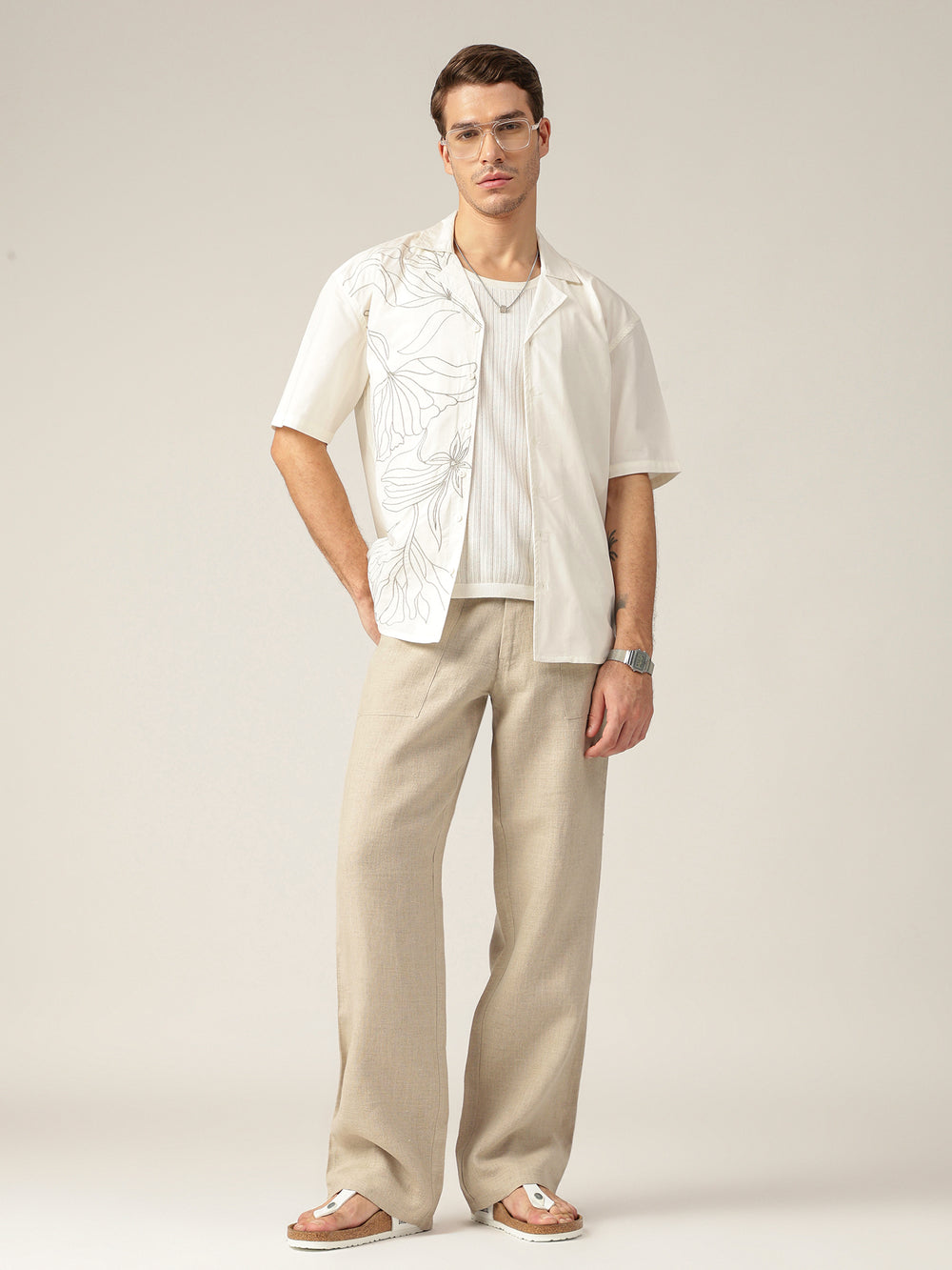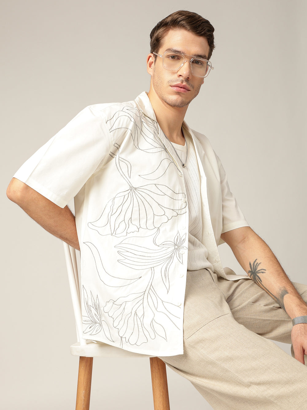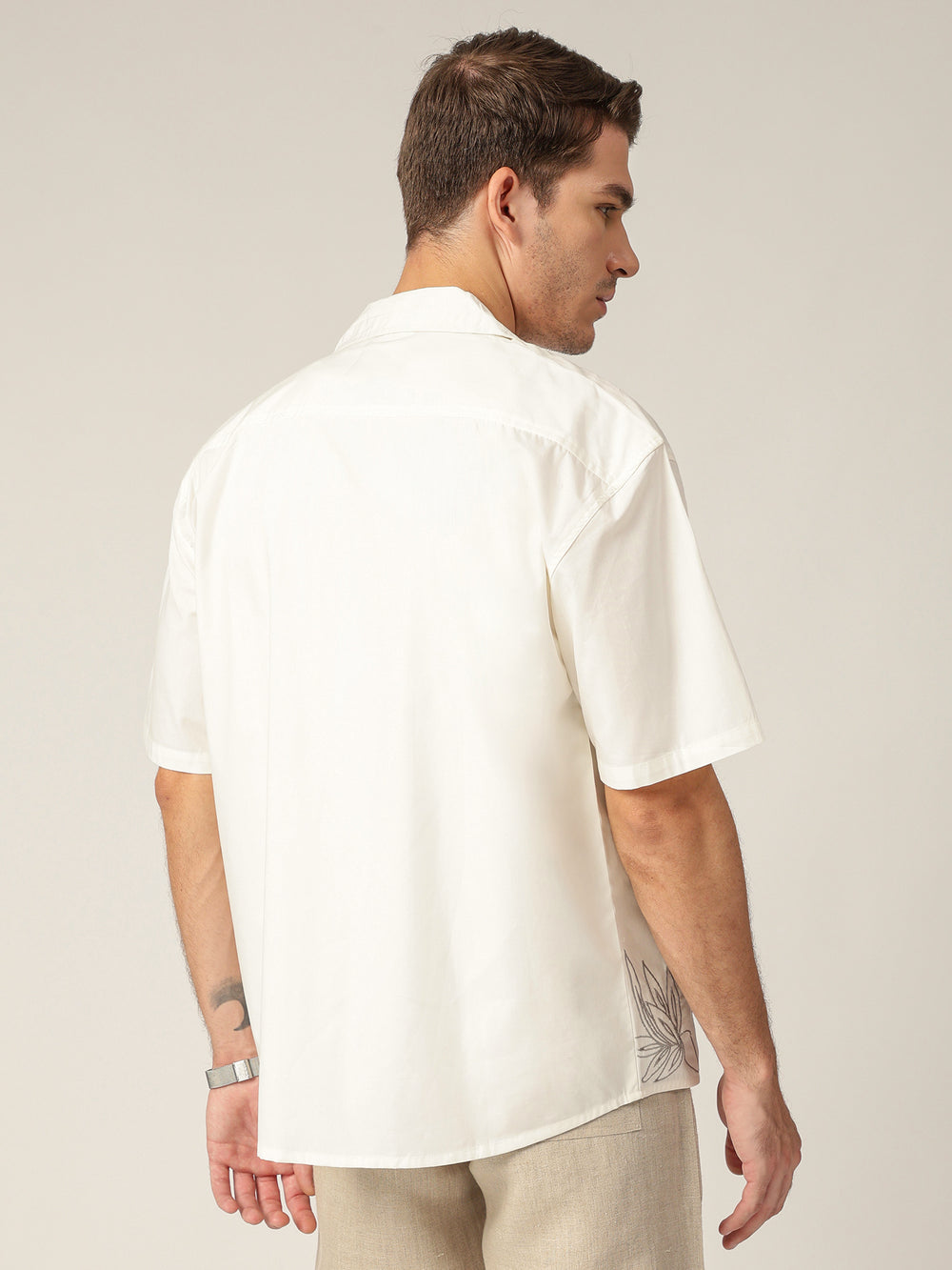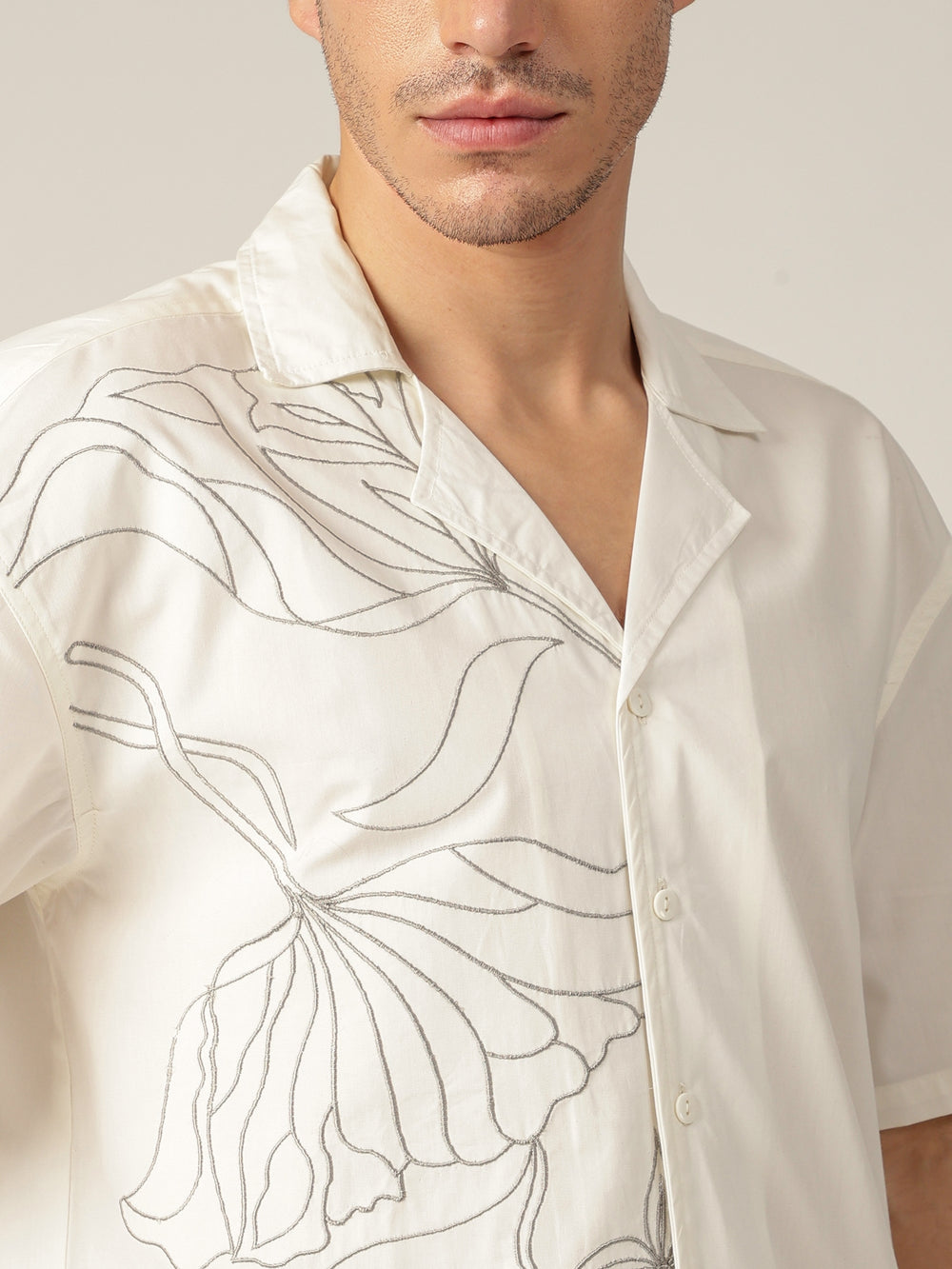 This Oversize Fit Casual shirt features elegant Embroidered detailing, No Pocket design, Drop-Shoulder, Half Sleeves, a breezy Cuban Collar, and a Curved Hemline. Crafted from premium cotton for all-day comfort.